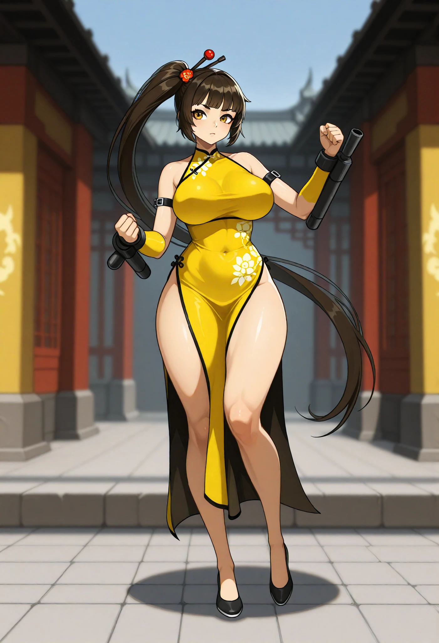 Tiequanlastorigin, china_dress, hair_ornament, full_body, thick_thighs, chinese_clothes, long_hair, very_long_hair, brown_hair, dress, tachi-e, tonfa, side_ponytail, yellow_dress, breasts, flats, huge_breasts, a pair of tonfa,