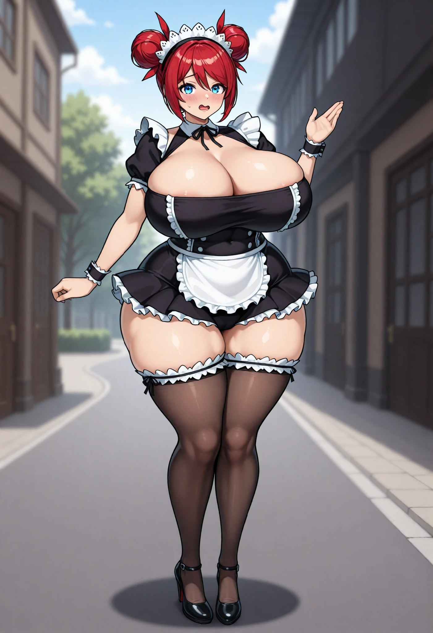 Fotialastorigin, double_bun, high_heels, tachi-e, hair_bun, huge_breasts, thighs, maid, black maid uniform, blush, thighhighs, wide_hips, maid_headdress, full_body, thick_thighs, cleavage, apron, short skirt with ruffles,