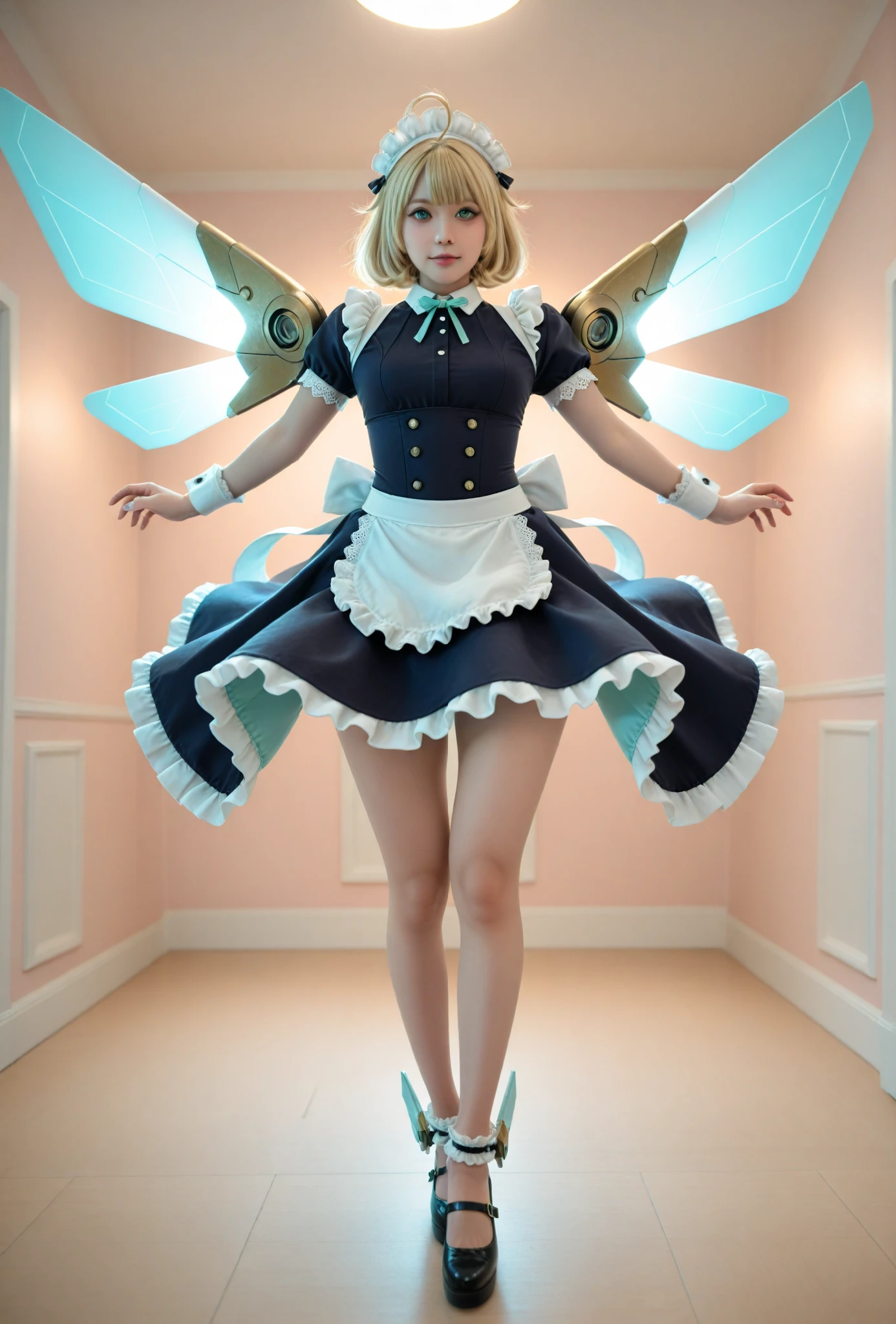 Aqualastorigin, mechanical_wings, maid_headdress, maid, green_eyes, blonde_hair, wings,