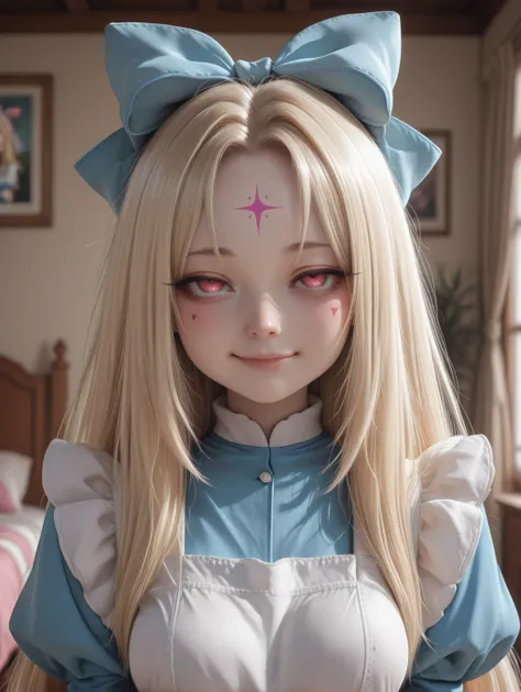Nero Alice, long hair, blonde hair, red eyes, bow, hair bow, pink eyes, facial mark, forehead mark,,long sleeves, blue dress, ribbon, apron, white apron, puffy sleeves ,shoes