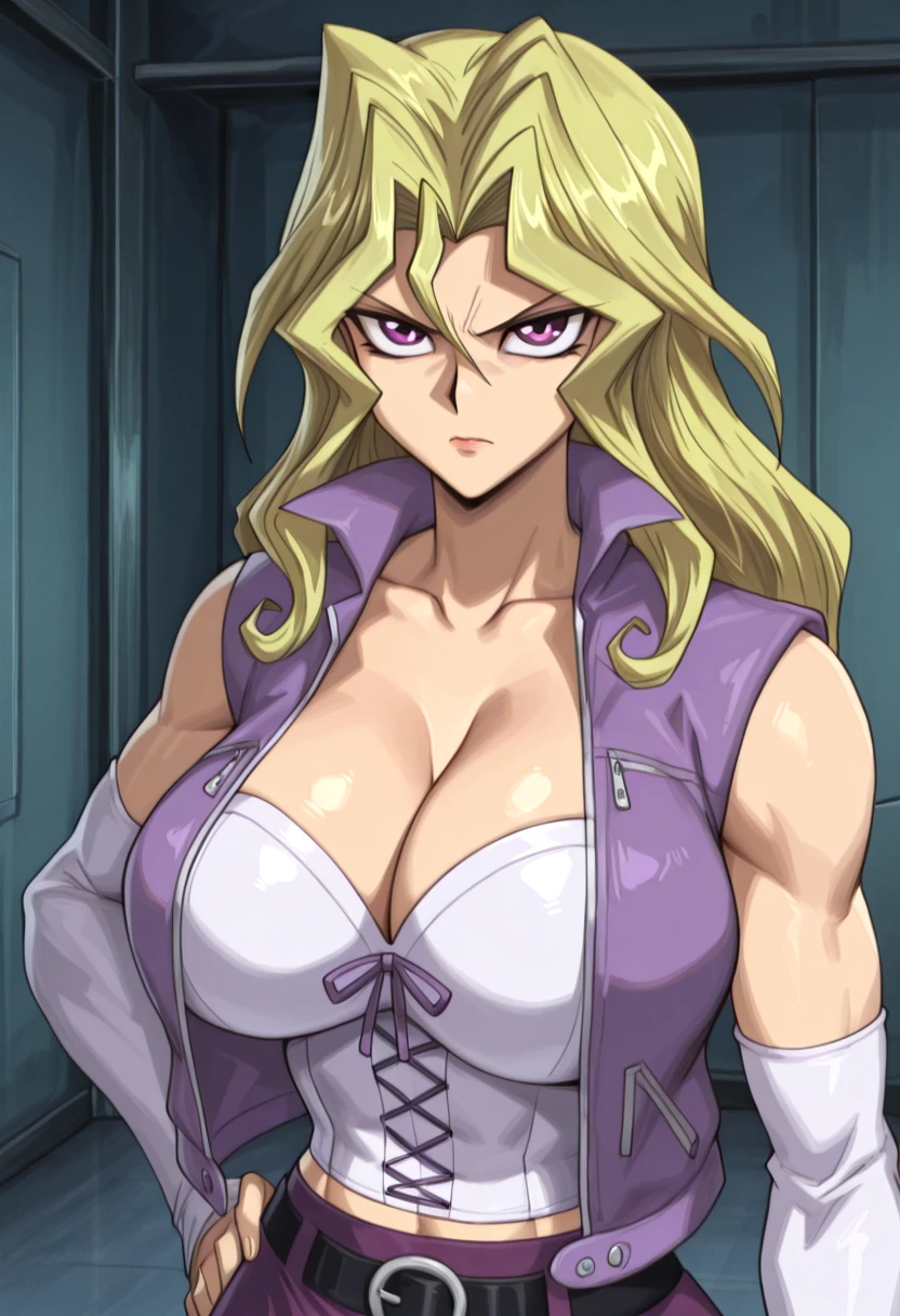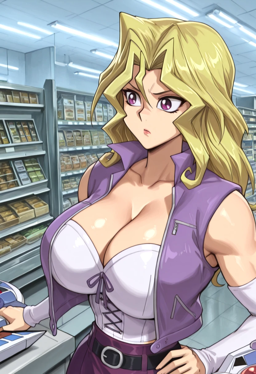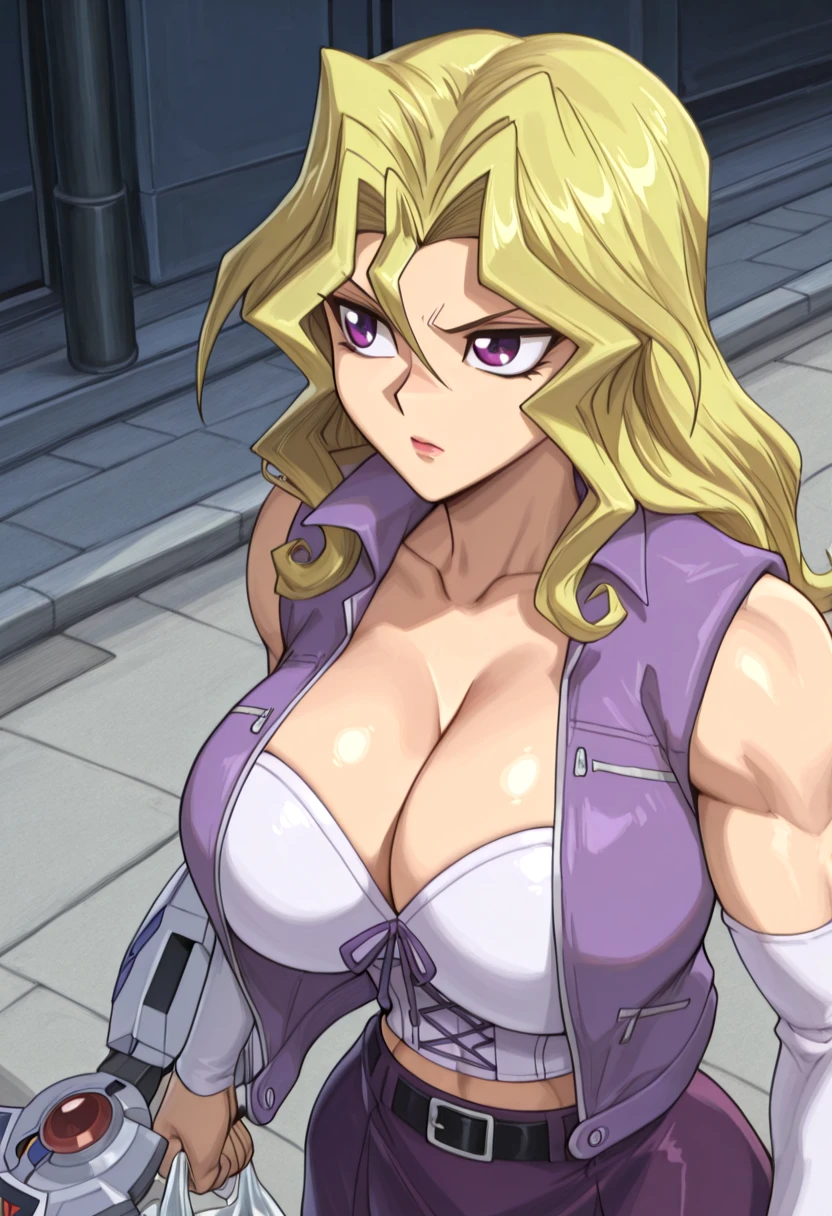 sleeveless vest, cropped vest, white bustier, cleavage, collarbone, purple vest, midriff, detached sleeves, white sleeves, purple skirt, short skirt, black belt, duel disk,