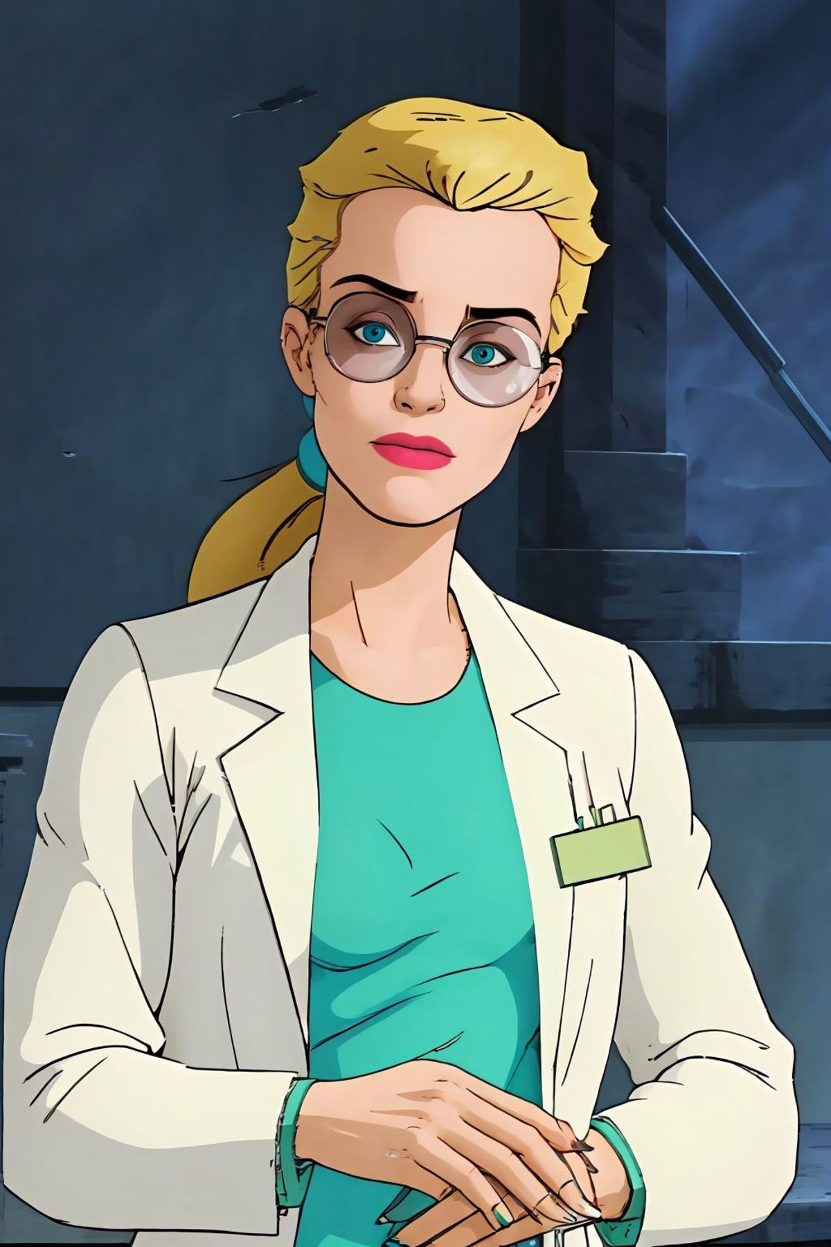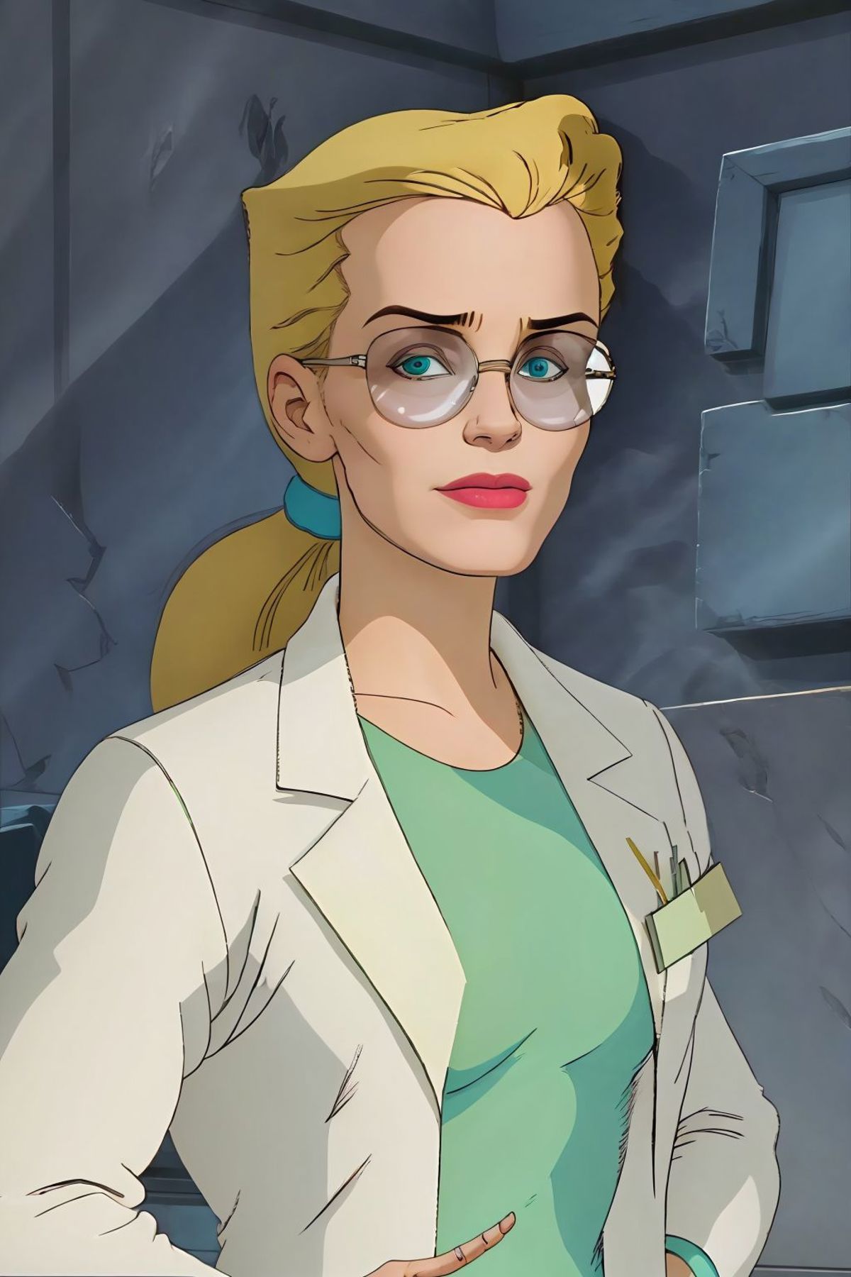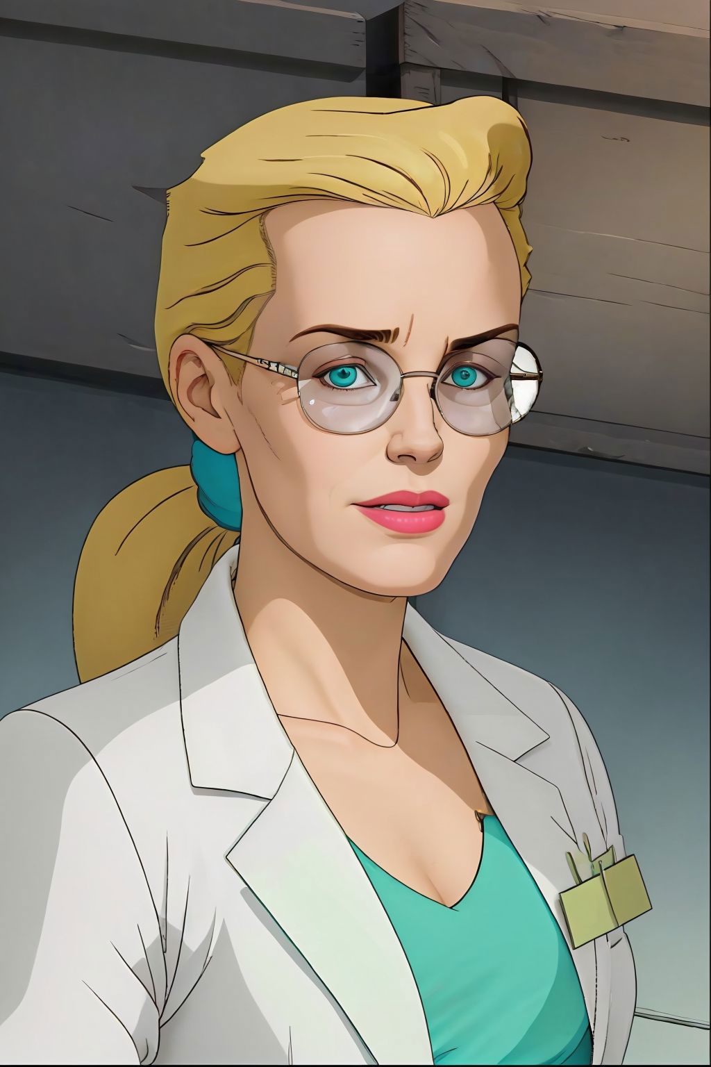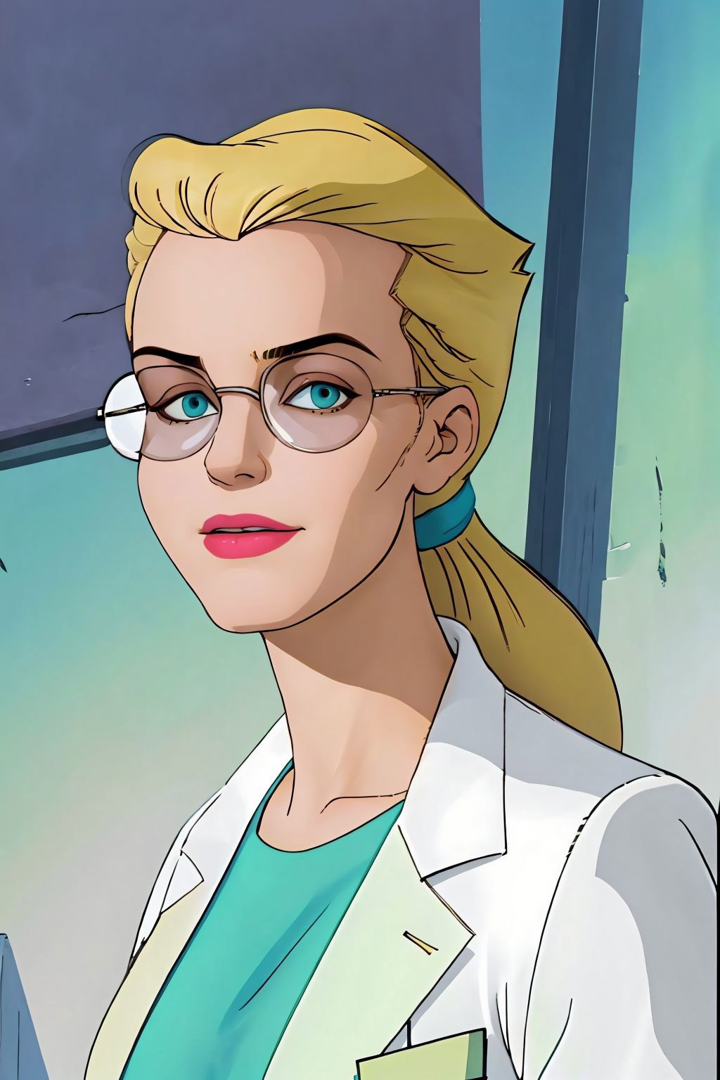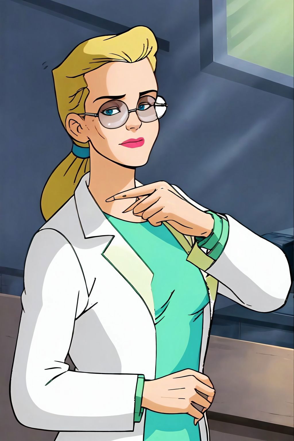 long hair, ponytail, glasses, labcoat, green dress