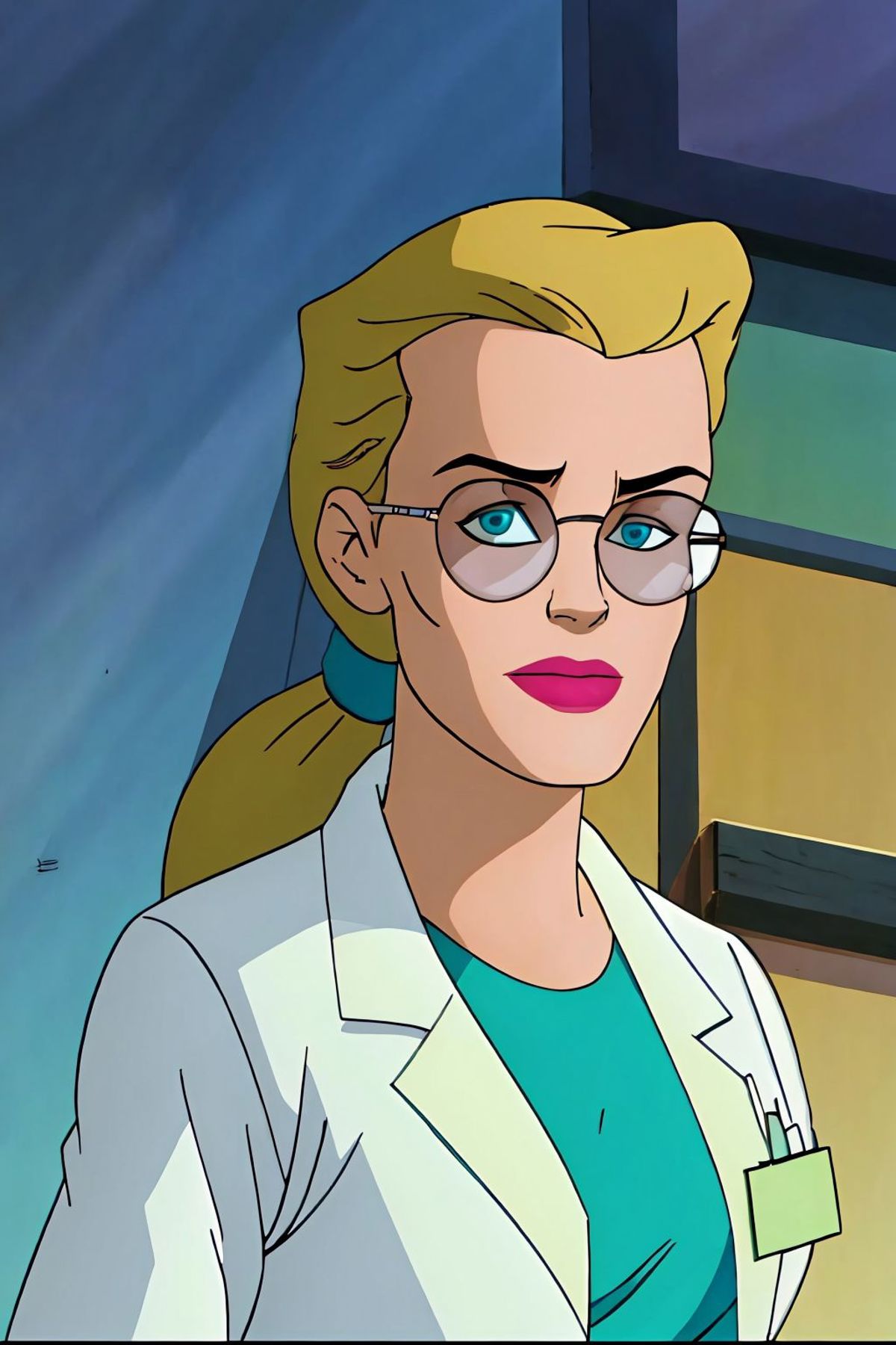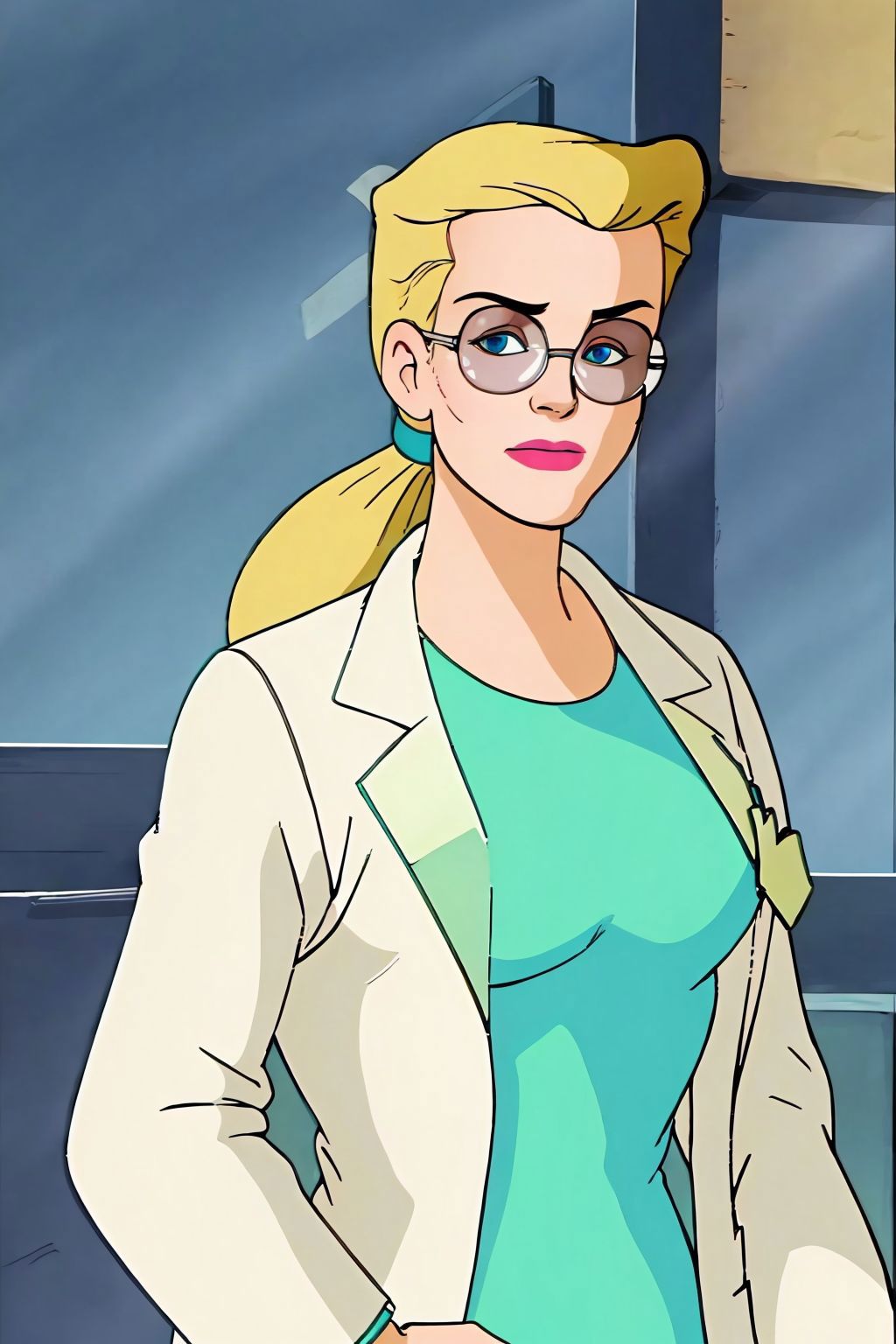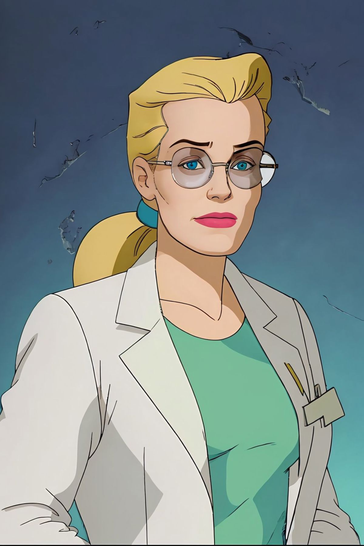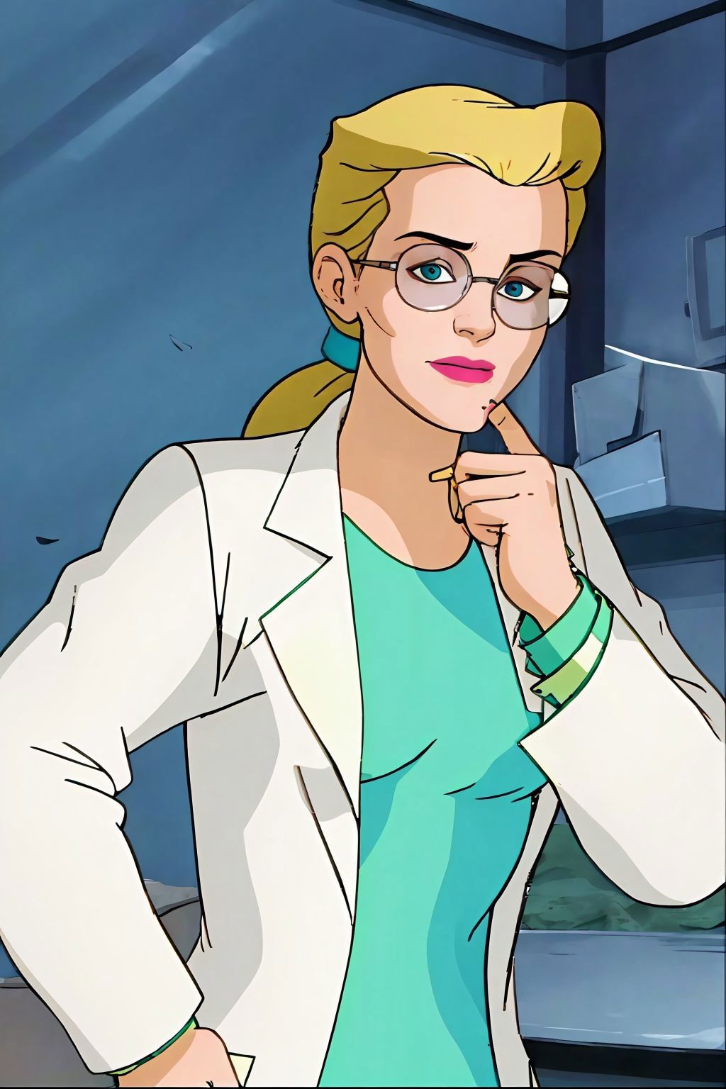 long hair, ponytail, glasses, labcoat, green dress
