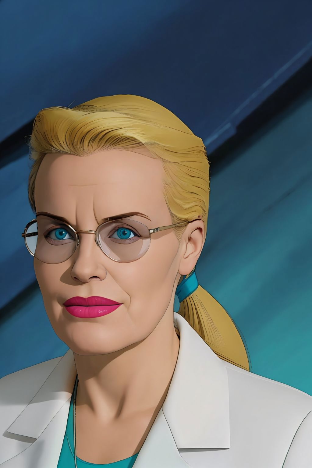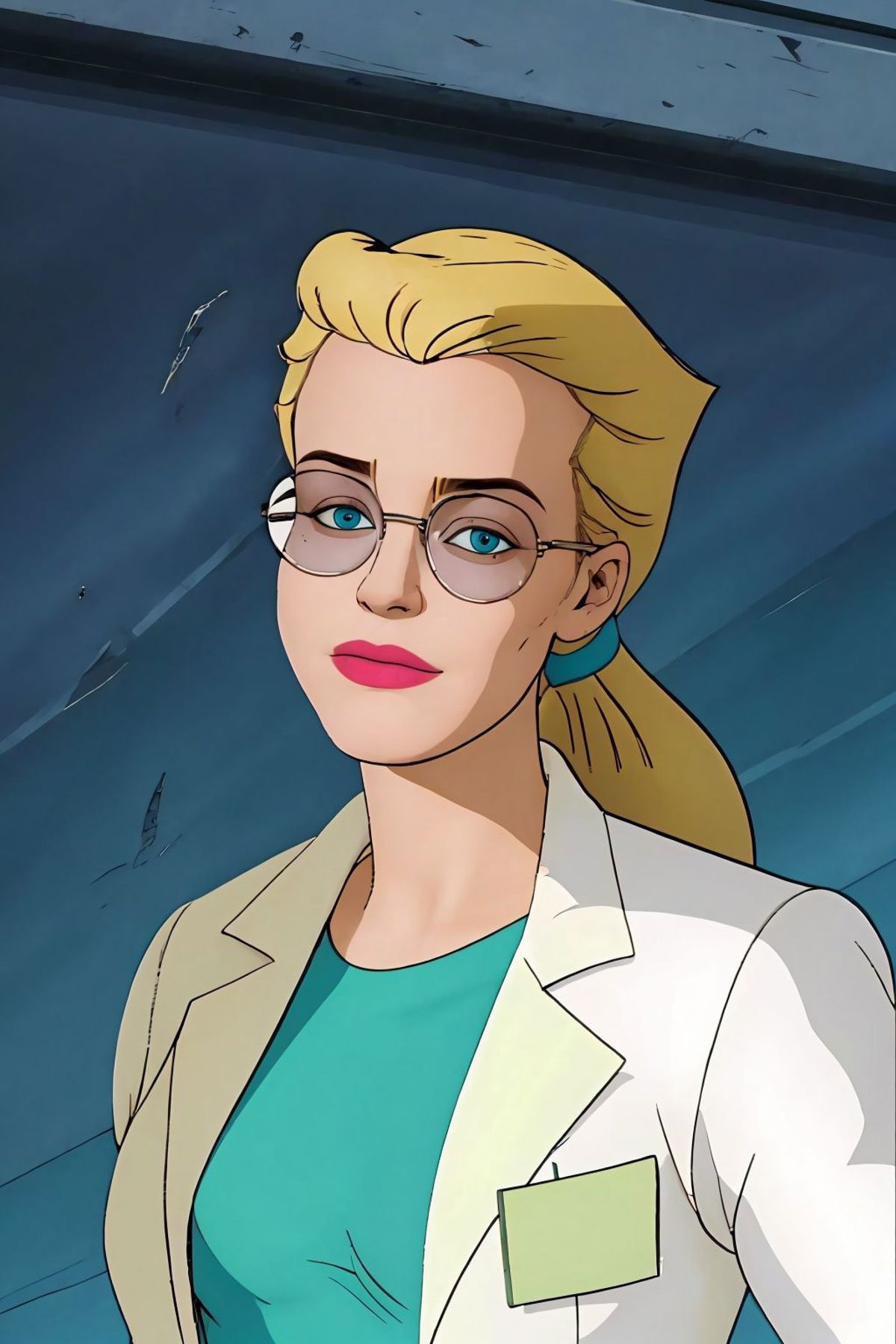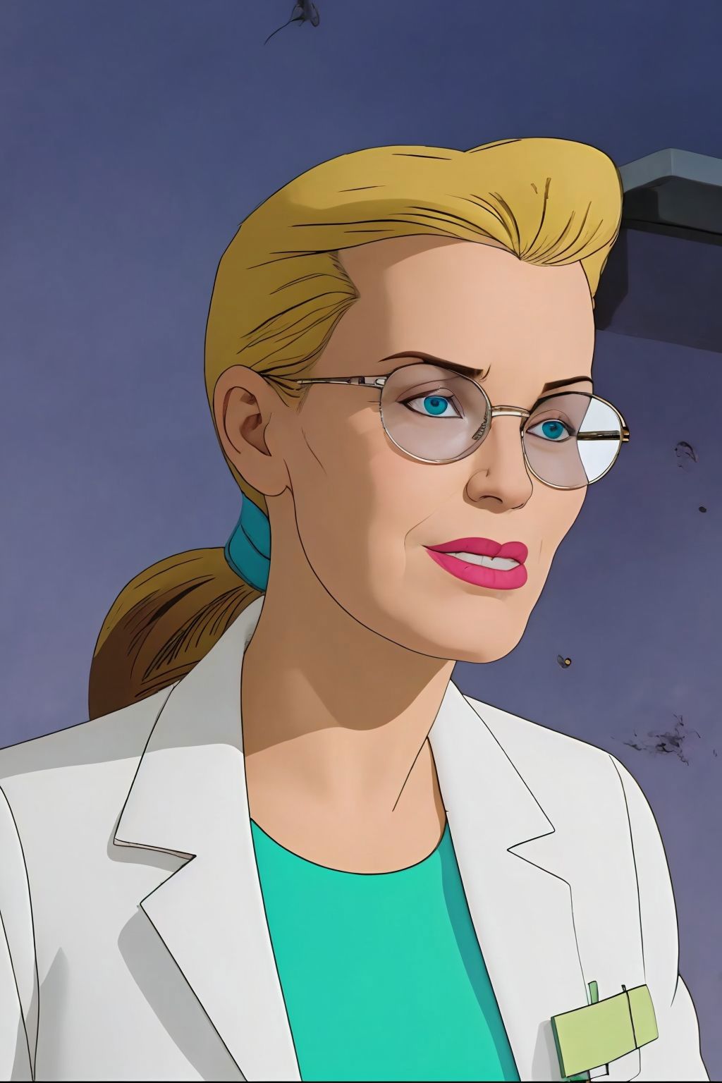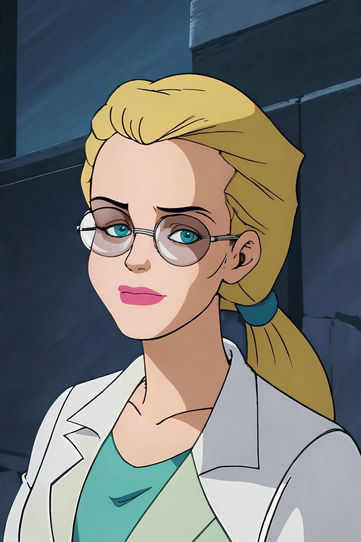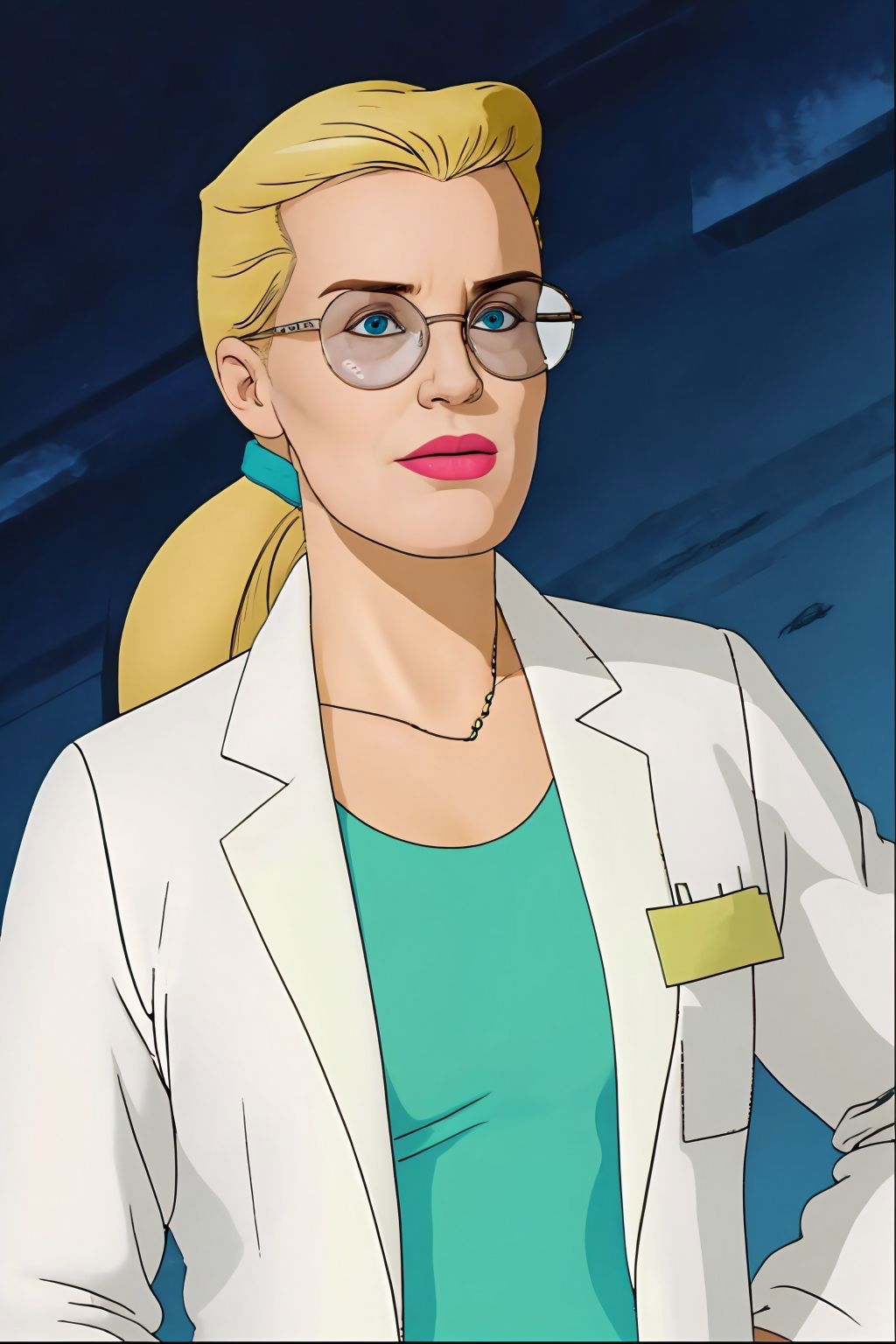 long hair, ponytail, glasses, labcoat, green dress