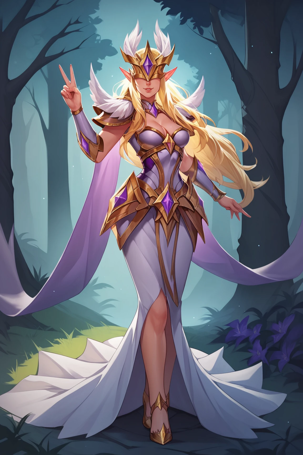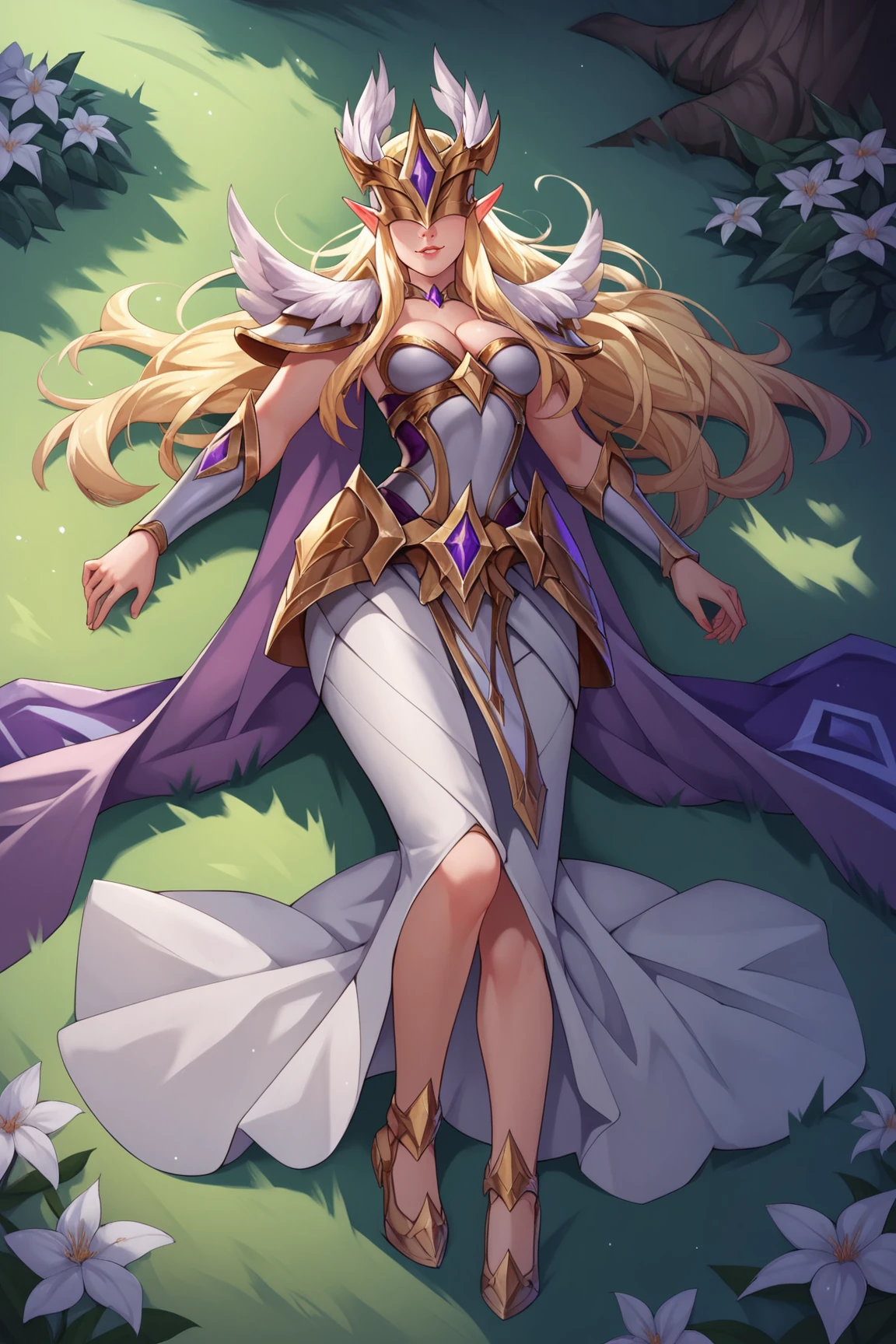 IlumiaAOVXL, blonde hair, sidelocks, long hair, pointy ears, covered eyes, helmet, helmet with purple jewel, large breasts, purple cape, golden armor, shoulder armor, cleavage, breastplate, white dress, armored dress, vambraces, hip vent, white skirt, long skirt, golden shoes, shoes with purple jewel