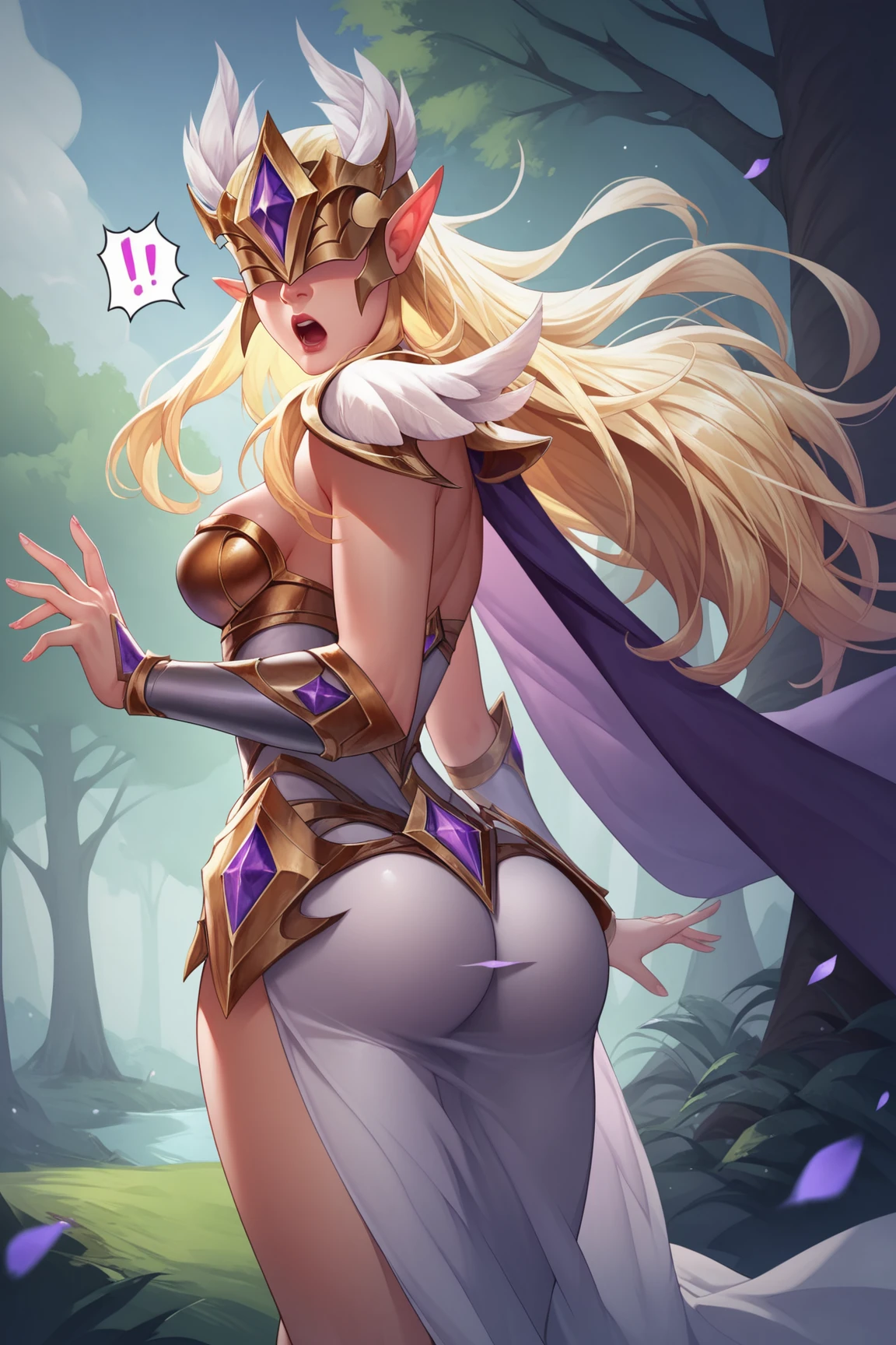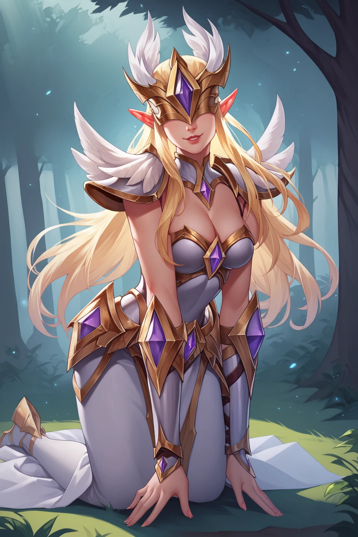 ➜ IlumiaAOVXL, blonde hair, sidelocks, long hair, pointy ears, covered eyes, helmet, helmet with purple jewel, large breasts, purple cape, golden armor, shoulder armor, cleavage, breastplate, white dress, armored dress, vambraces, hip vent, white skirt, long skirt, golden shoes, shoes with purple jewel]--|======[ 💗 My Settings: 💗 ]======|--[