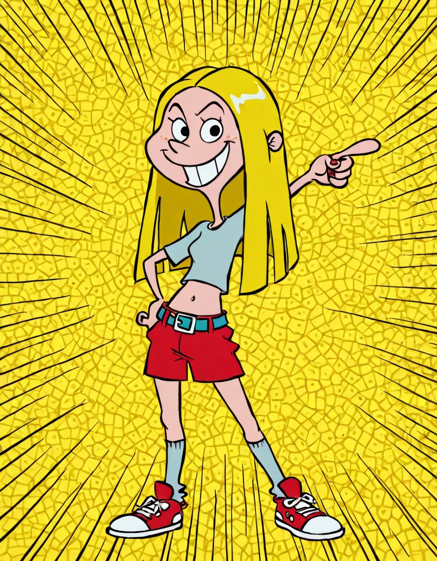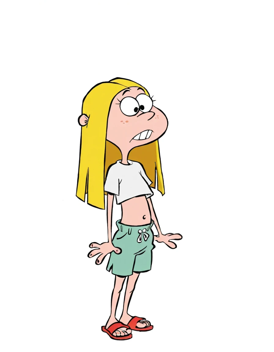 blonde hair, long hair, freckles, buck teeth, yellow socks, grey shirt, red shorts, navel, short sleeves, belt, t-shirt, red footwear, midriff,