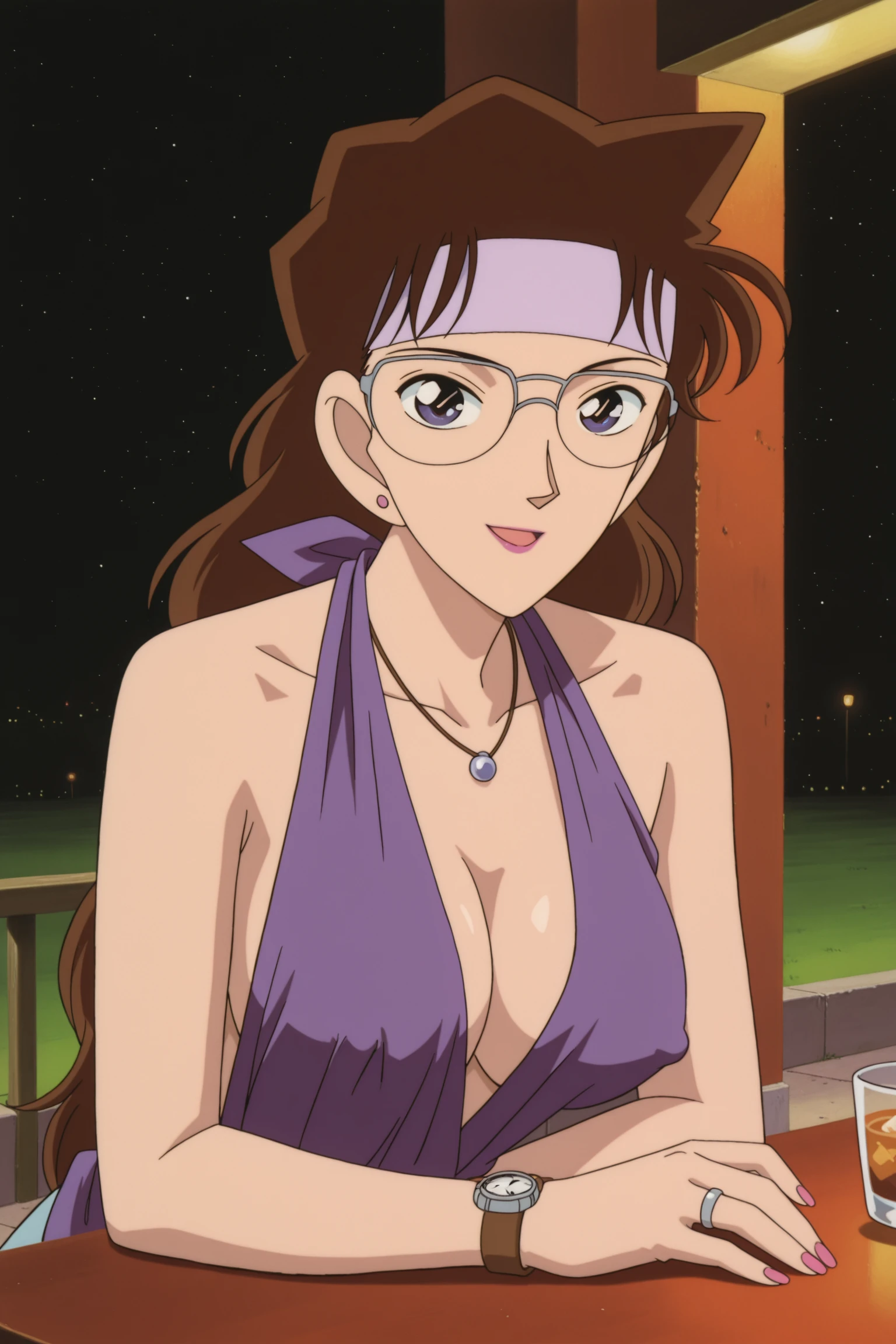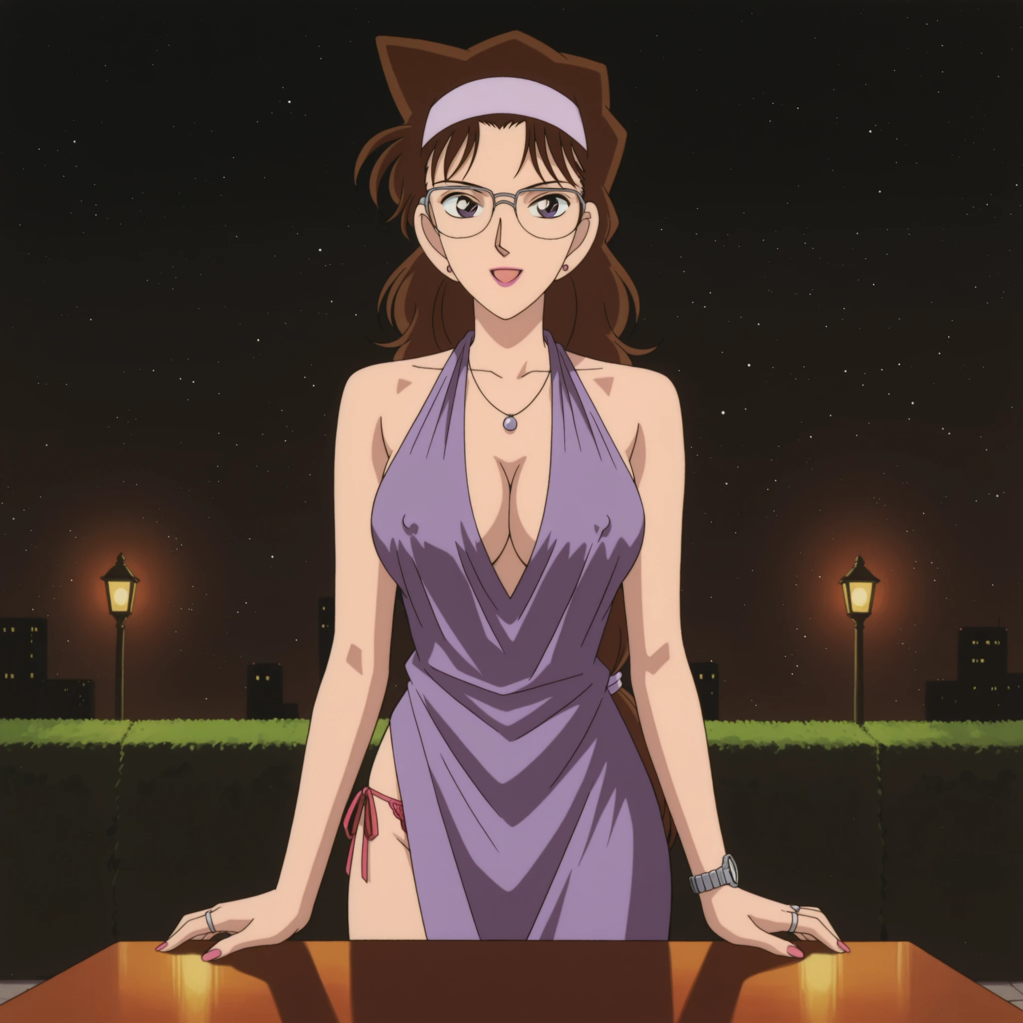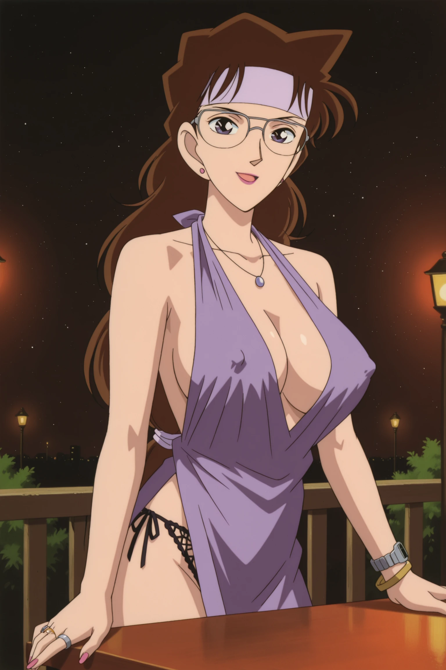 1990s \(style\), Detective_Conan_Retro_Style, detective_conan_retro_for_kamijo_hideko, brown hair, long hair, very long hair, dark eyes, glasses, lipstick, headband, large breasts, earrings, necklace, bracelets, metallic wristwatch, rings, pink nails, long tied dress, tied lace panties, collarbone, cleavage