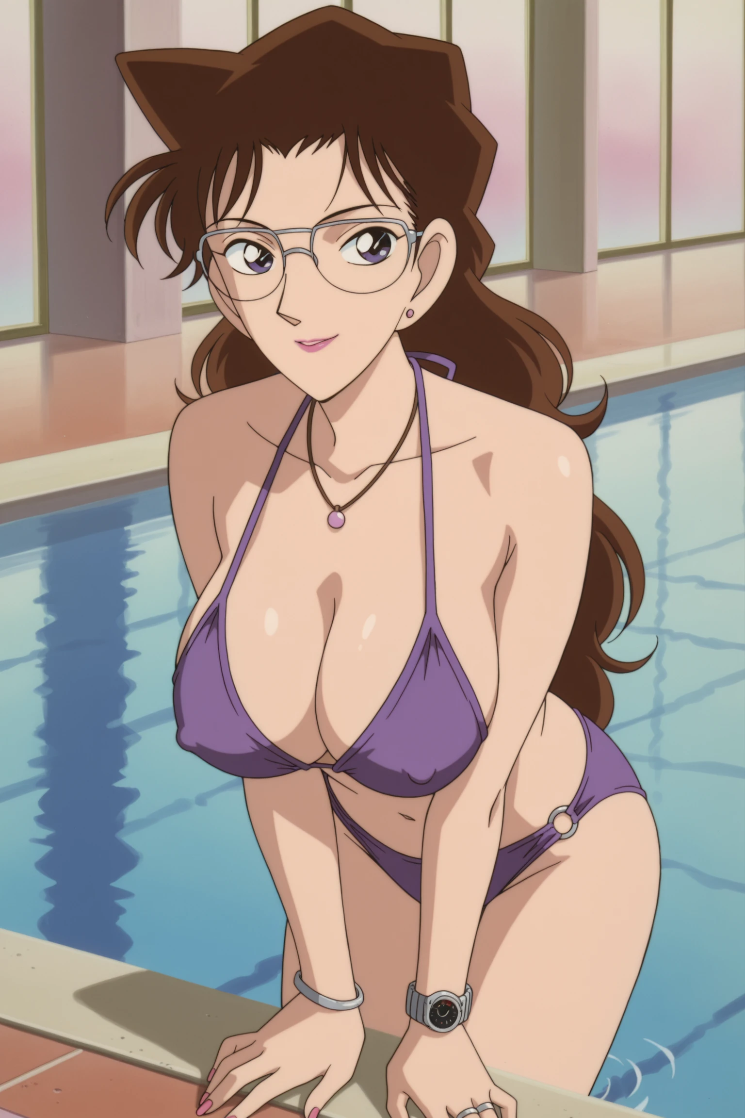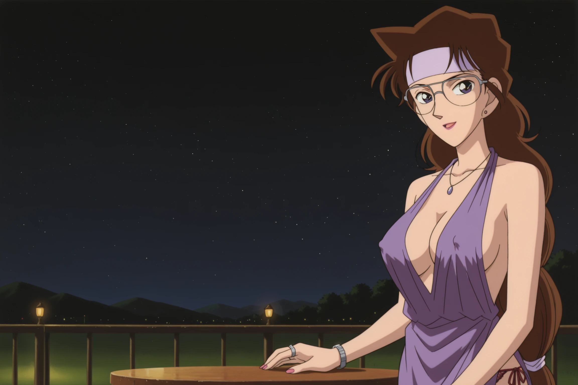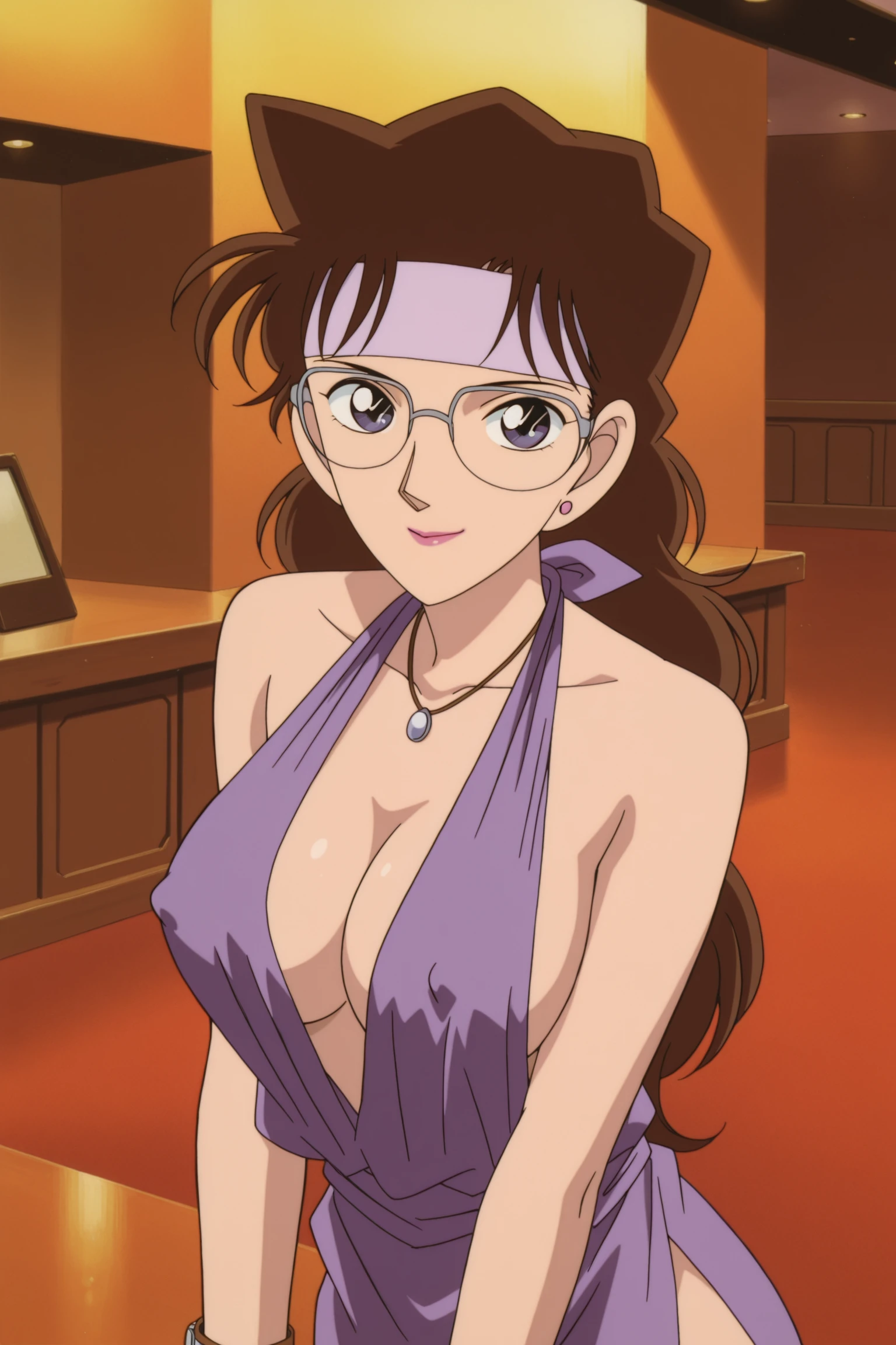 1990s \(style\), Detective_Conan_Retro_Style, detective_conan_retro_for_kamijo_hideko, brown hair, long hair, very long hair, dark eyes, glasses, lipstick, headband, large breasts, earrings, necklace, bracelets, metallic wristwatch, rings, pink nails, long tied dress, tied lace panties, collarbone, cleavage