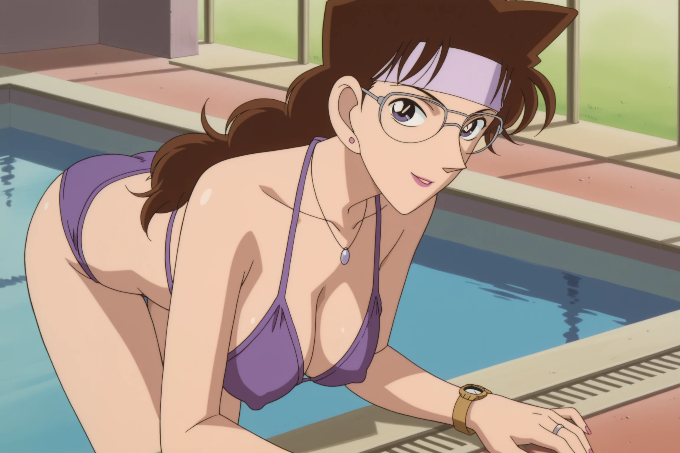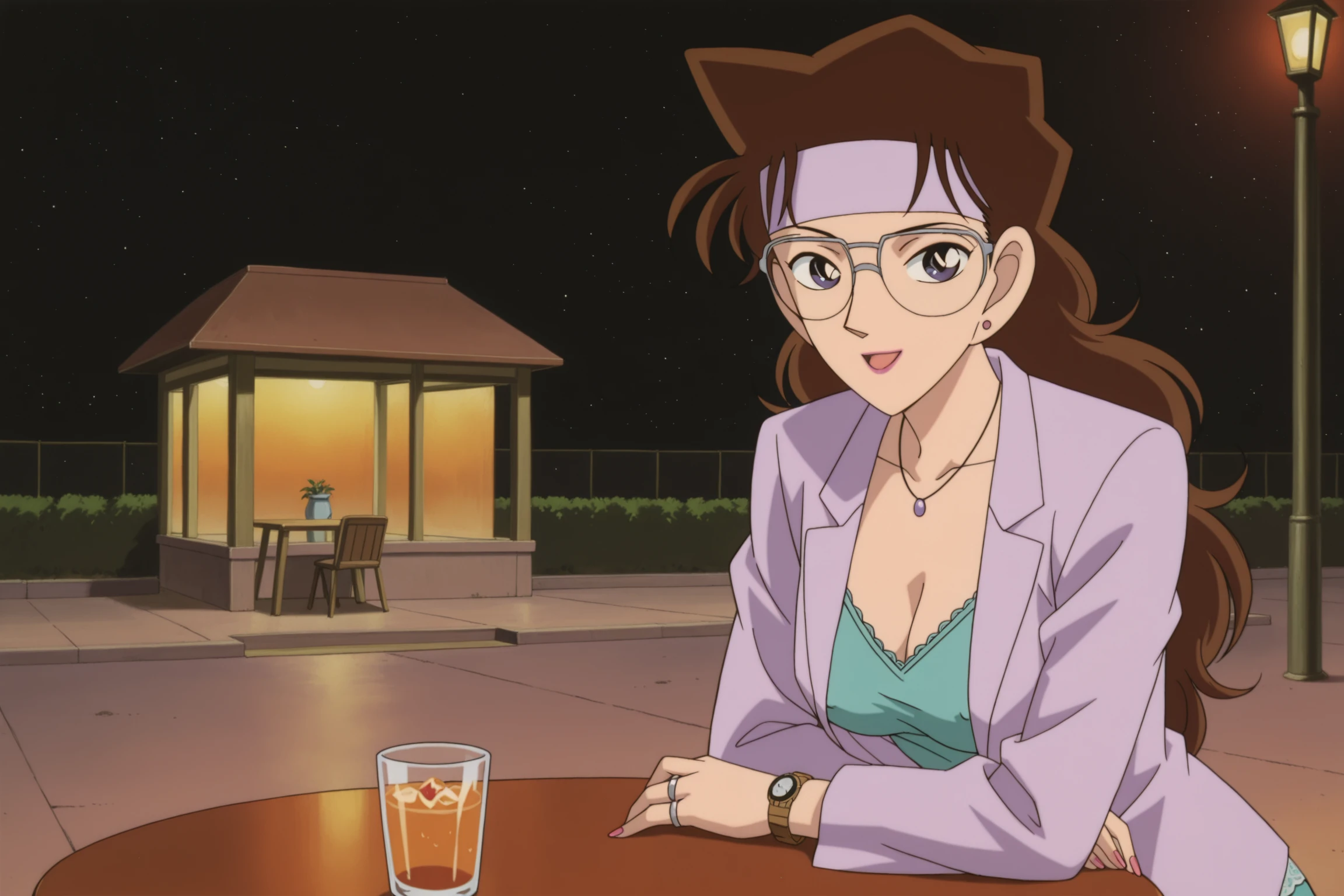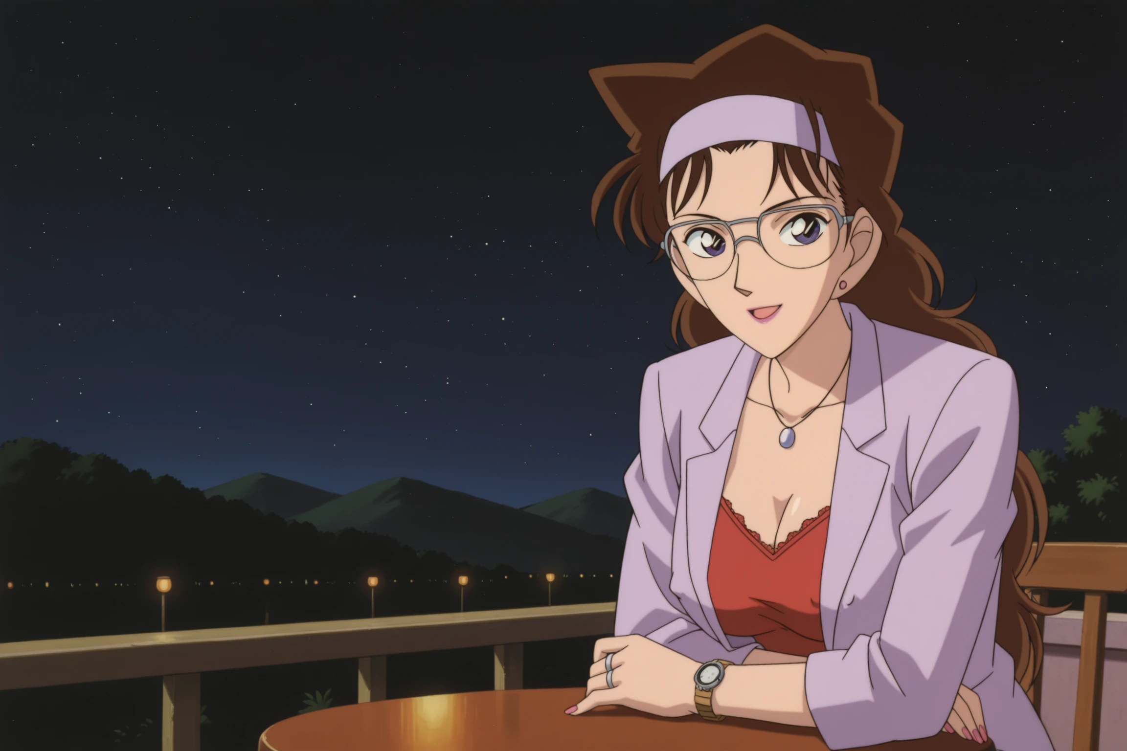 1990s \(style\), Detective_Conan_Retro_Style, detective_conan_retro_for_kamijo_hideko, brown hair, long hair, very long hair, dark eyes, glasses, lipstick, headband, large breasts, earrings, necklace, bracelets, metallic wristwatch, rings, pink nails, jacket, very low cut camisole, miniskirt, tied lace panties, collarbone, cleavage
