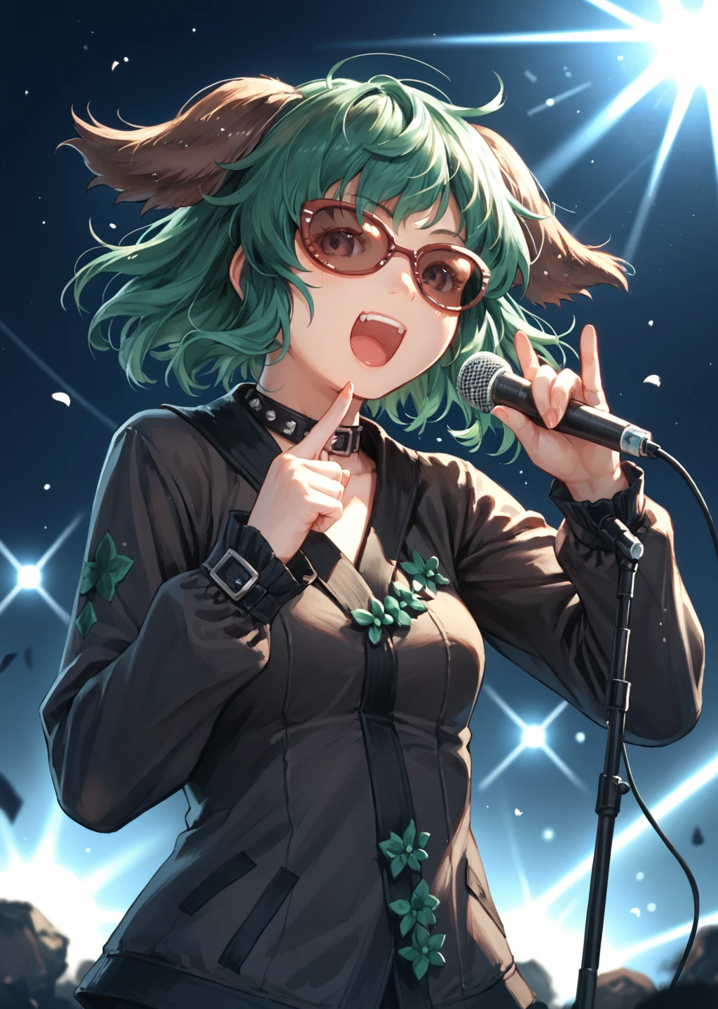 kyokaso, goth_outfit, 1girl, animal ears, tail, green hair, sunglasses