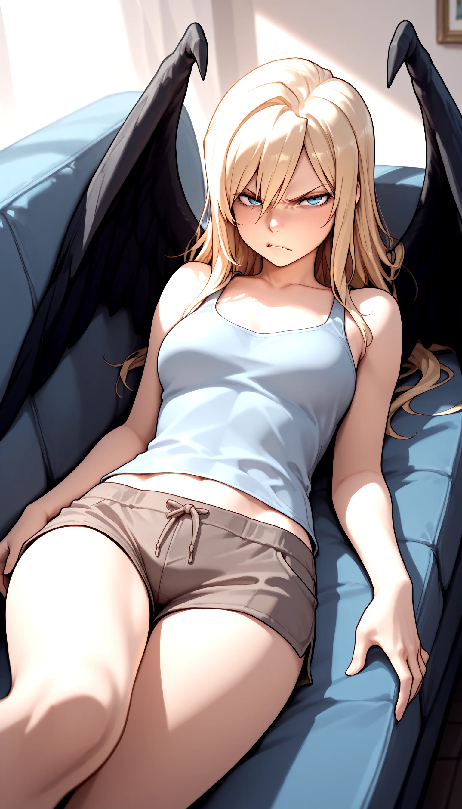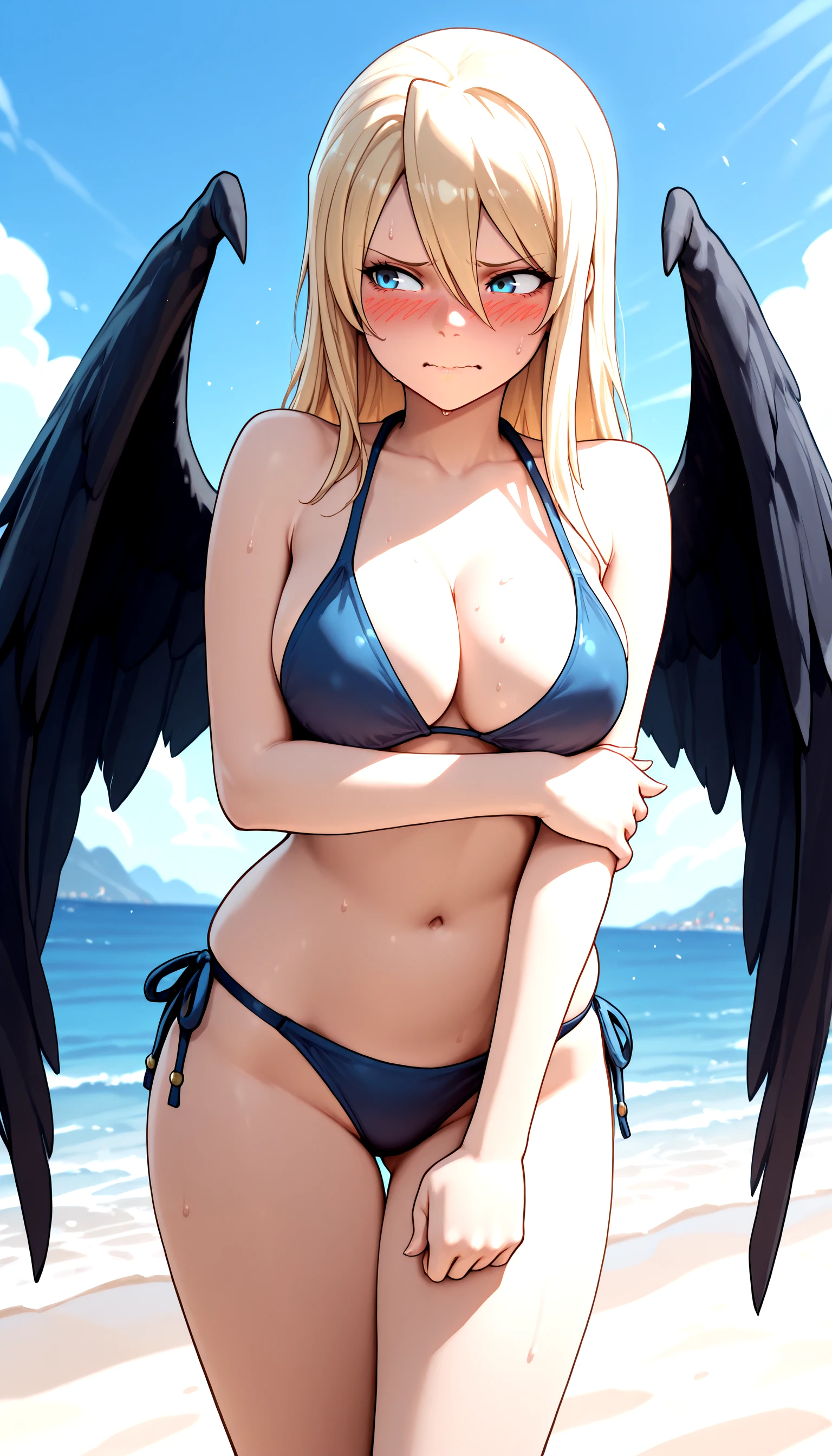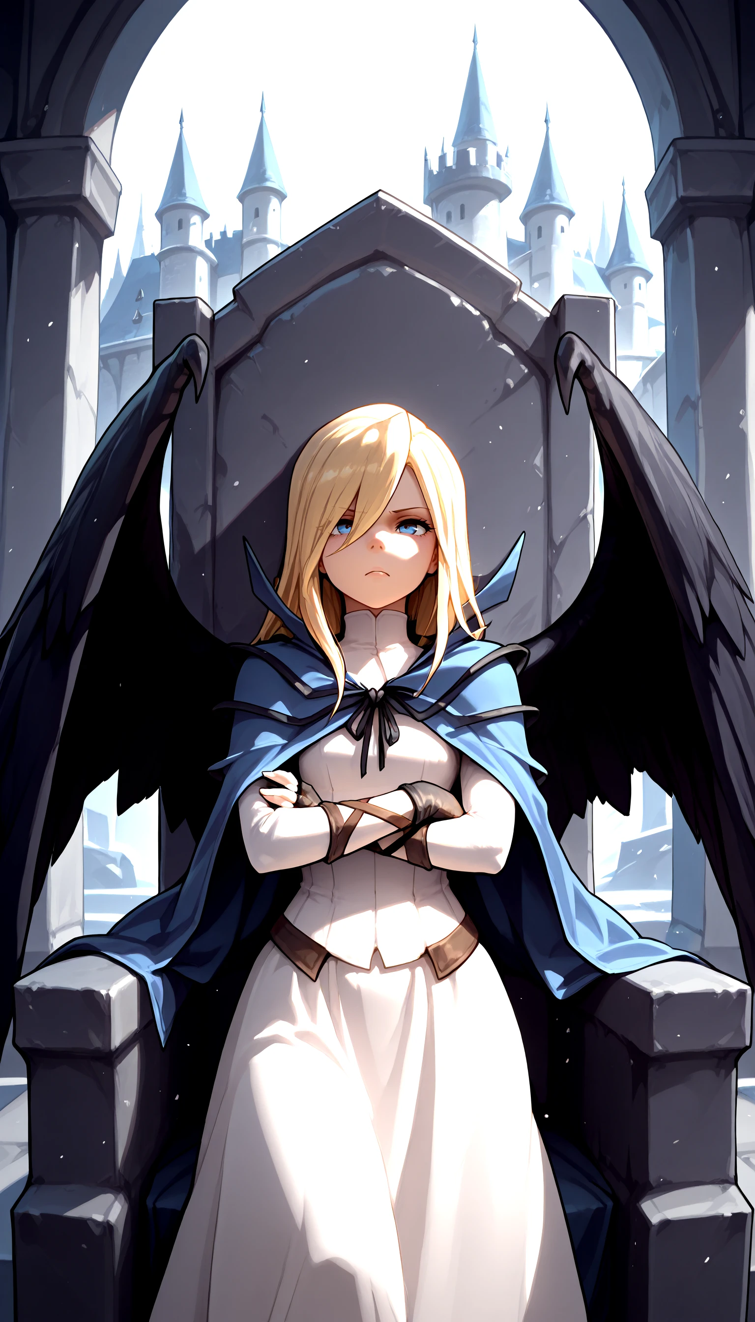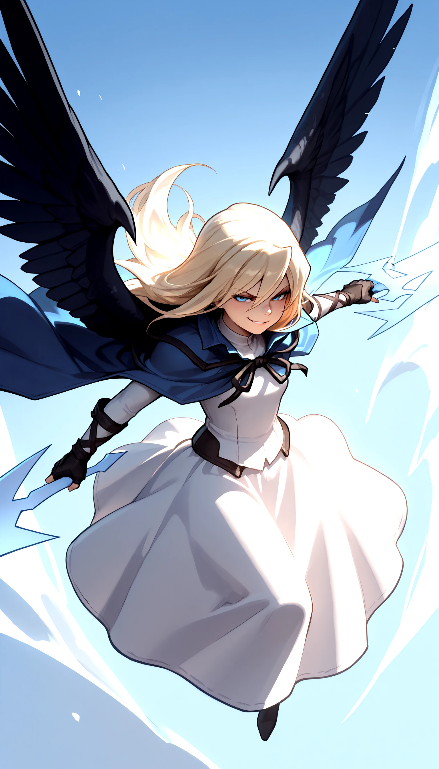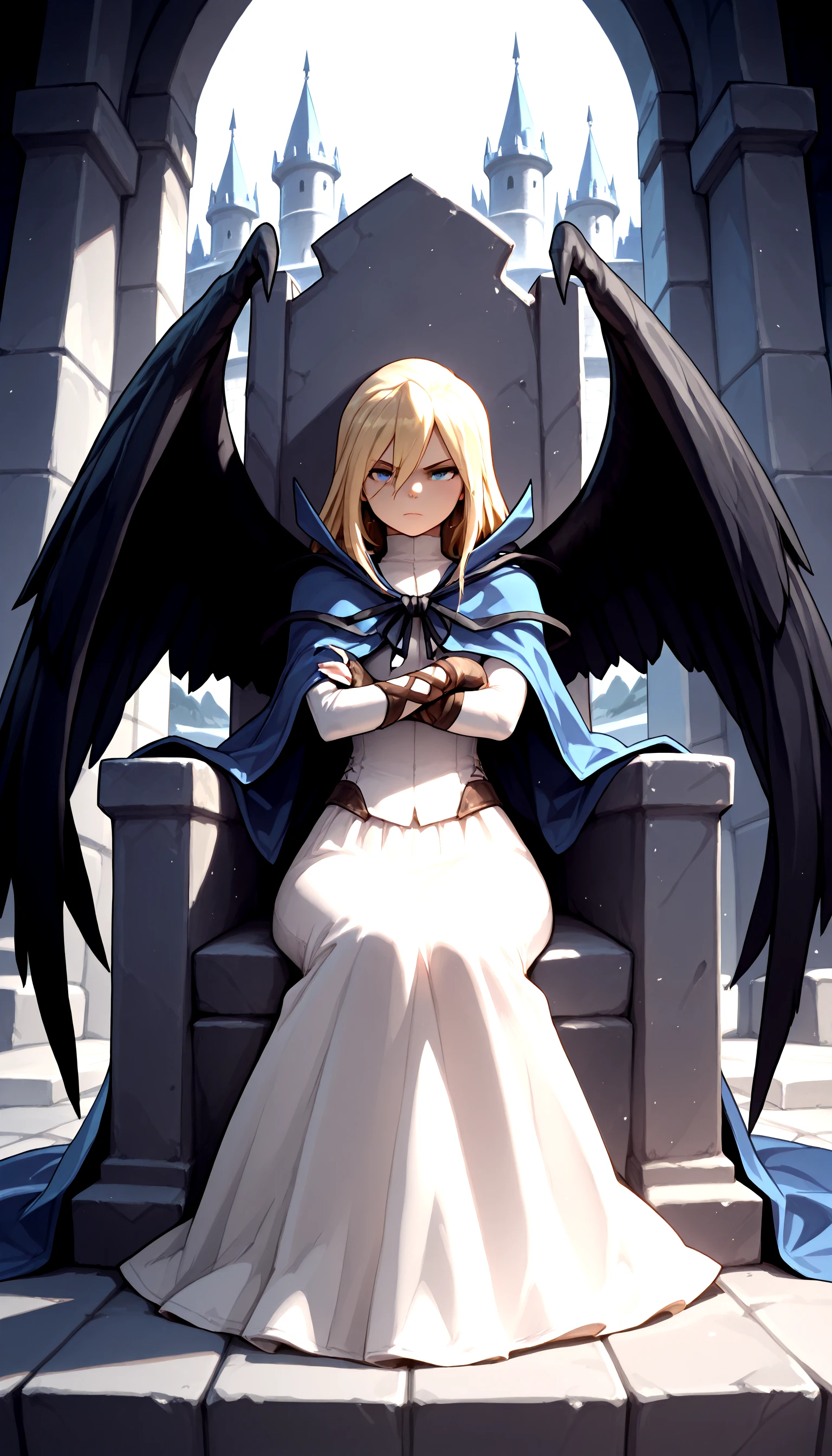 black_wings, blonde_hair, long_hair, blue_cape, white_dress, gloves,std_outfit, malice_rtpl,