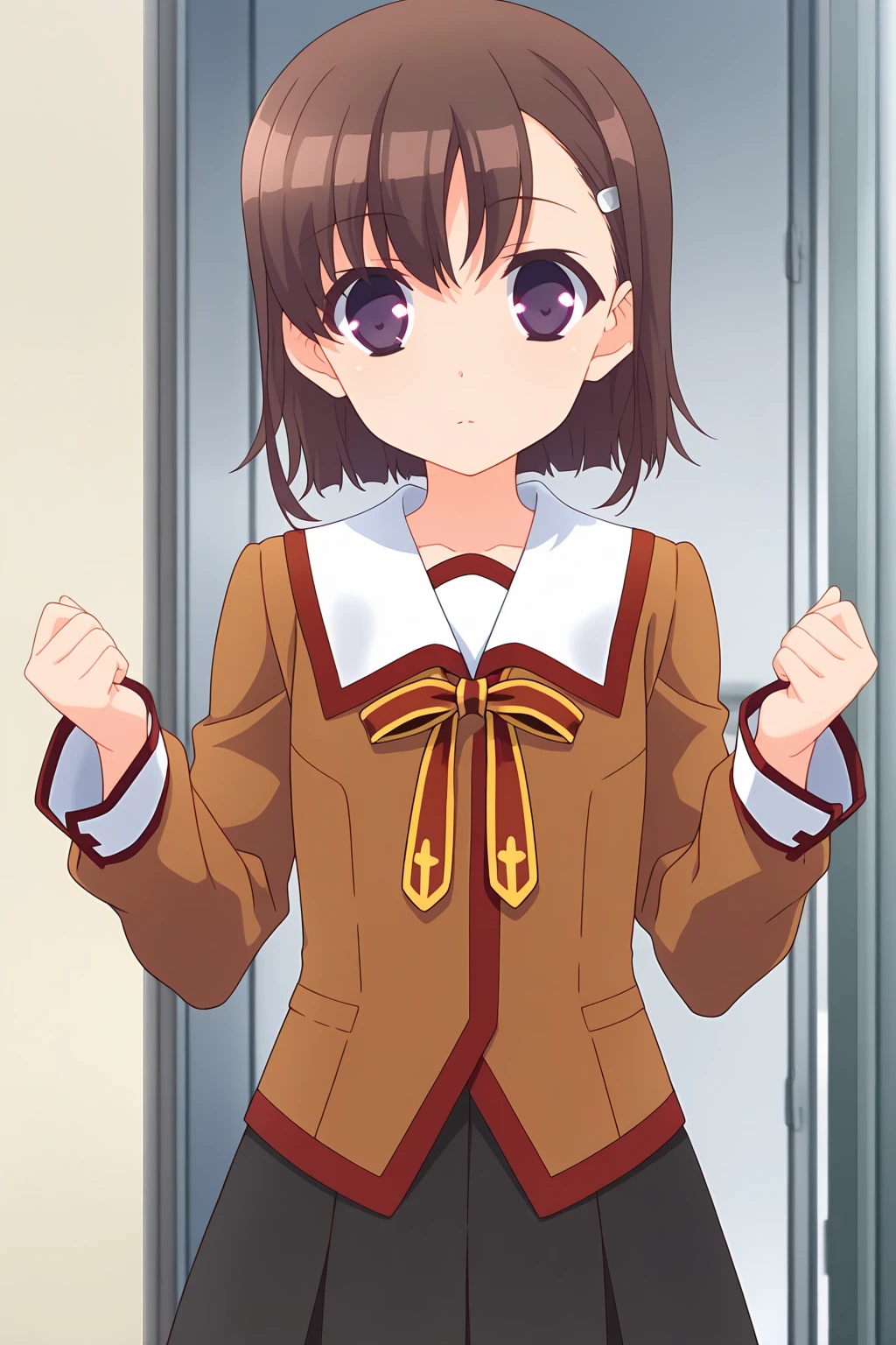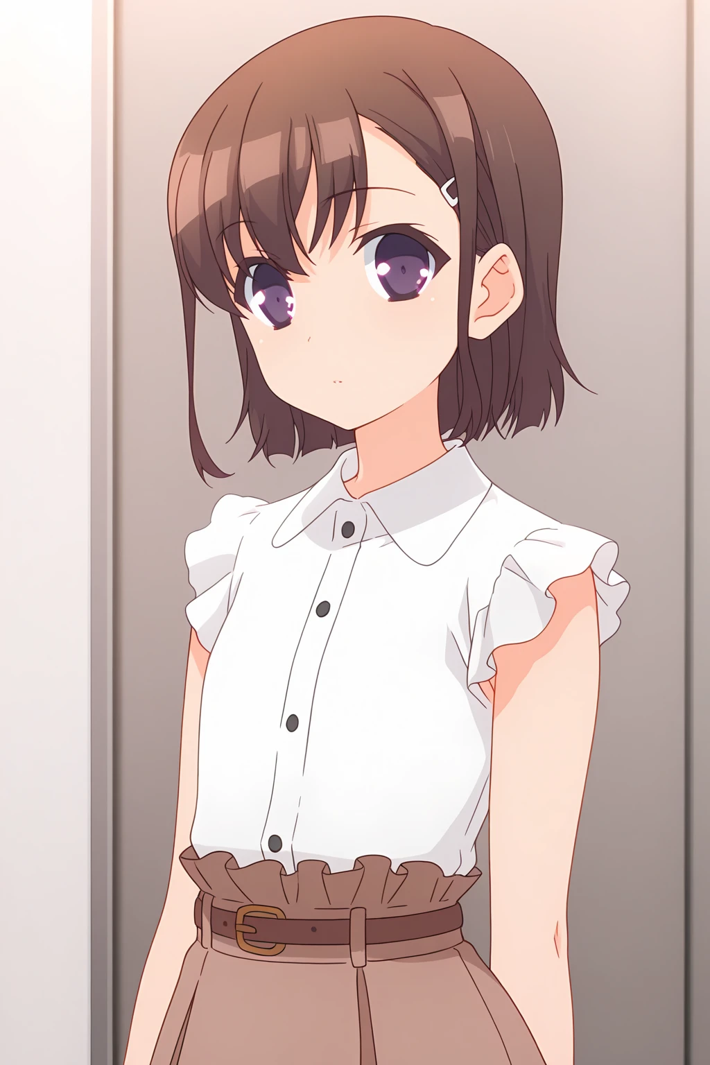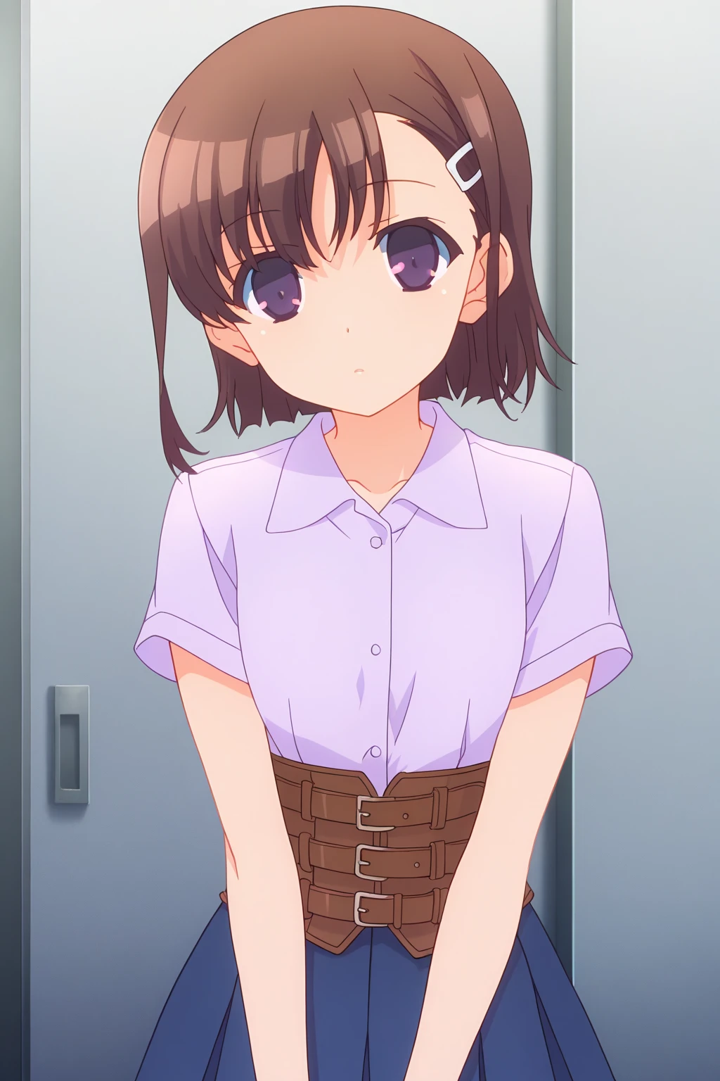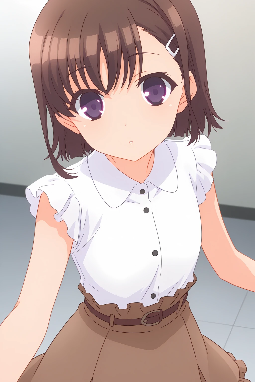 mimi katsura, 1girl, purple eyes, short hair, brown hair, asymmetrical bangs, sidelocks, hair ornament, white hairclip,