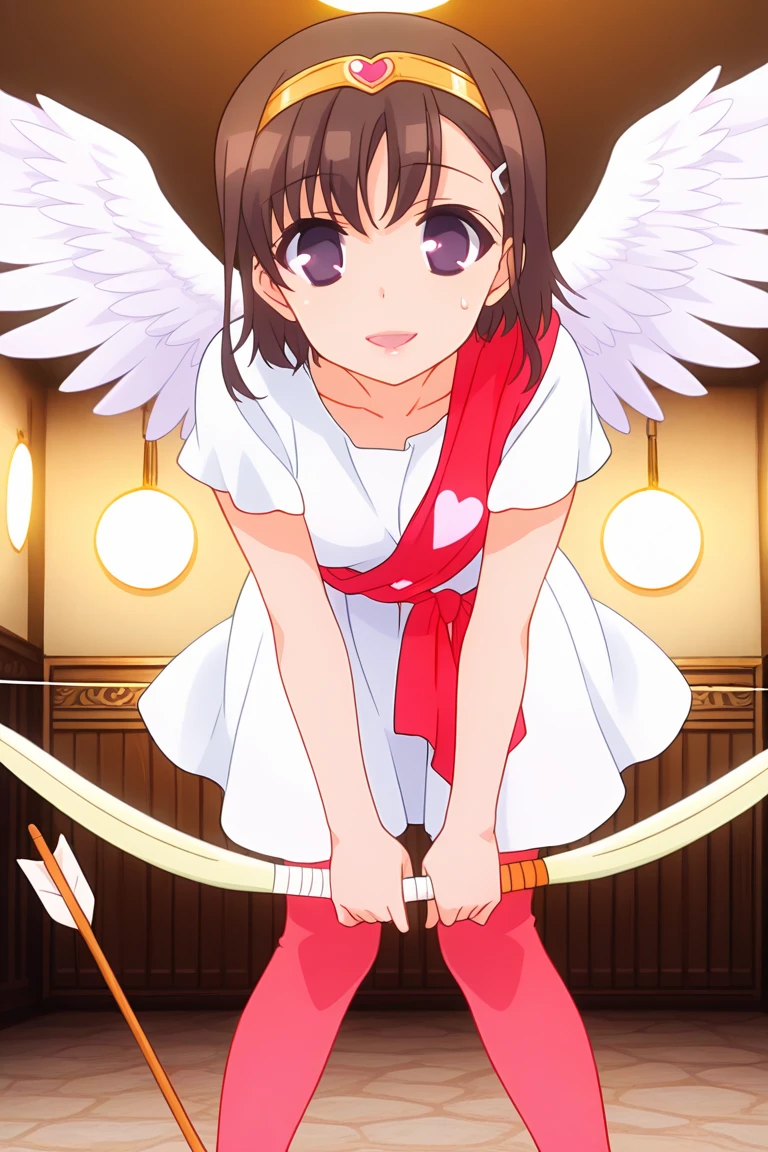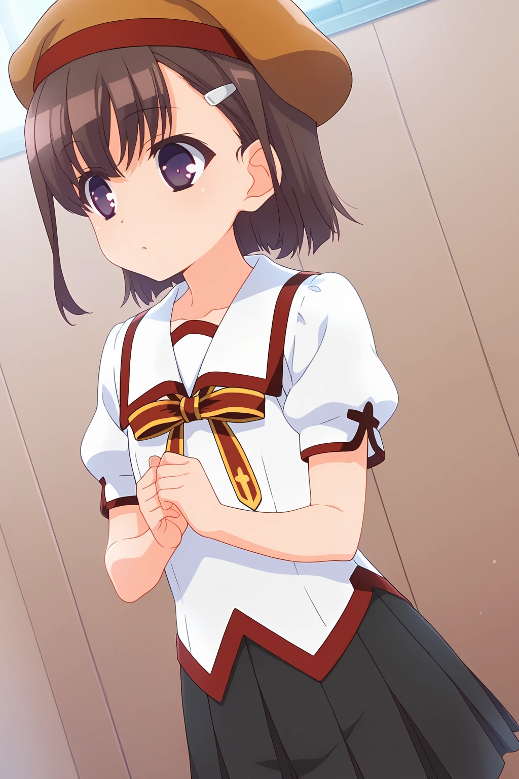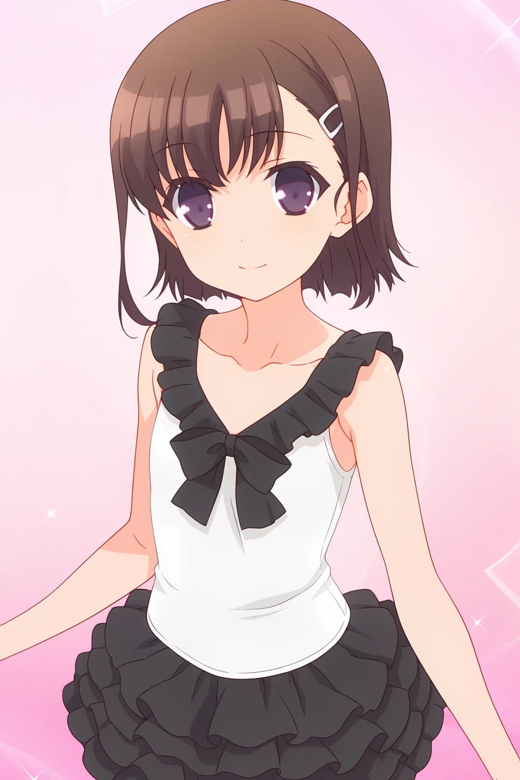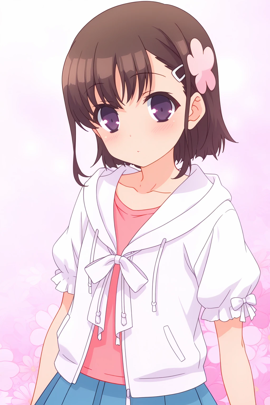 mimi katsura, 1girl, purple eyes, short hair, brown hair, asymmetrical bangs, sidelocks, hair ornament, white hairclip,