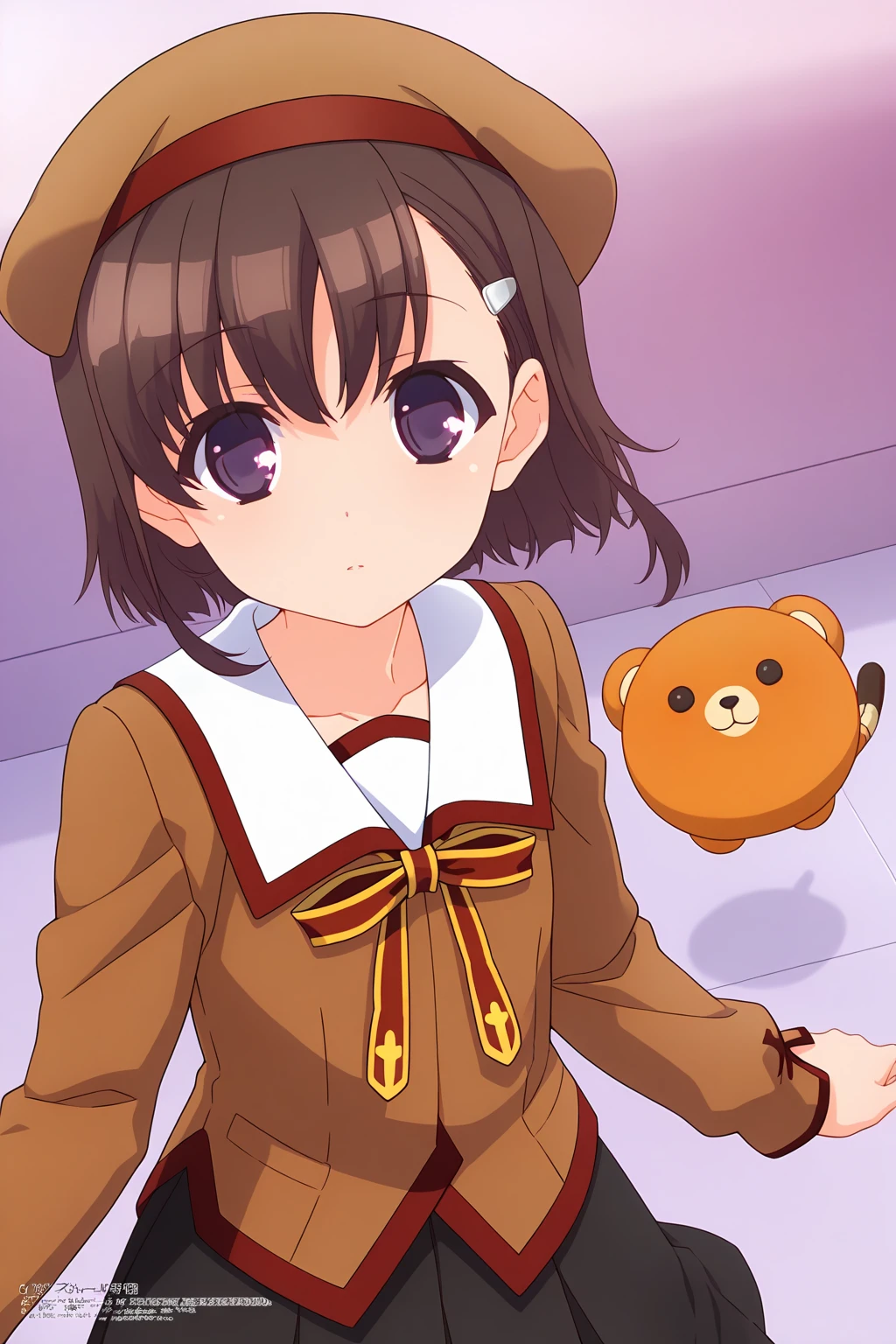 skirt, ribbon, school uniform, serafuku, sailor collar, homurahara academy school uniform, sailor fuku, brown jacket, long sleeves, white sailor collar, red trim, red bow, yellow bow, neck ribbon, black skirt, pleated skirt
