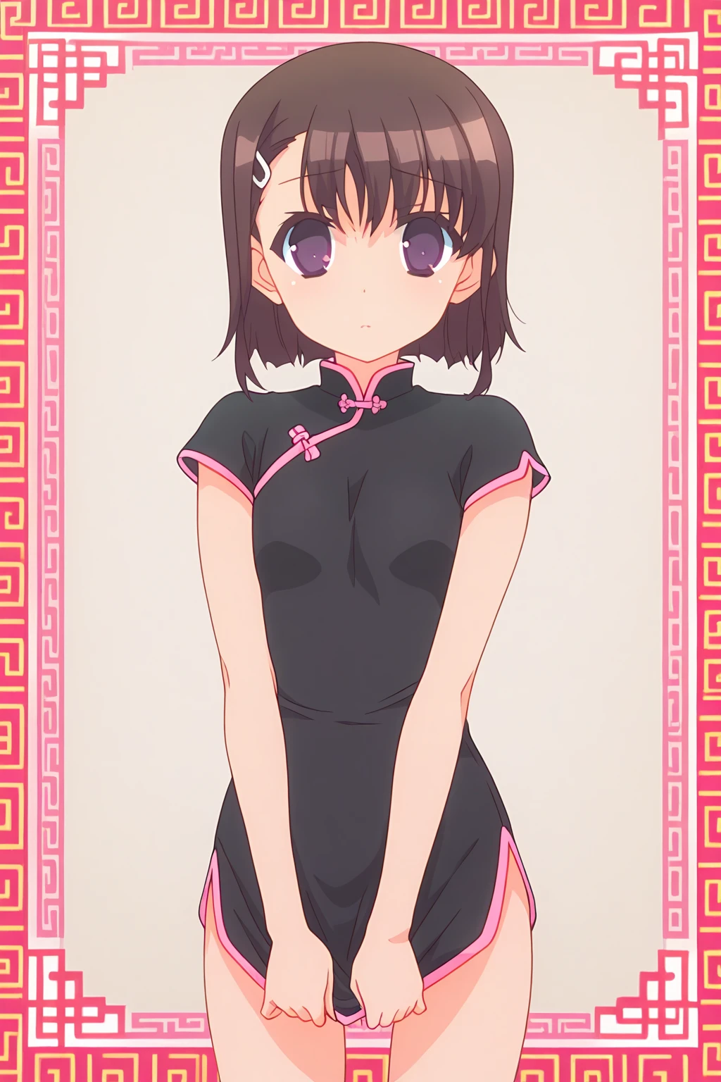 dress, short sleeves, black dress, black qipao, chinese dress, pink trim, clothes pull, side slit, microdress, dress tug