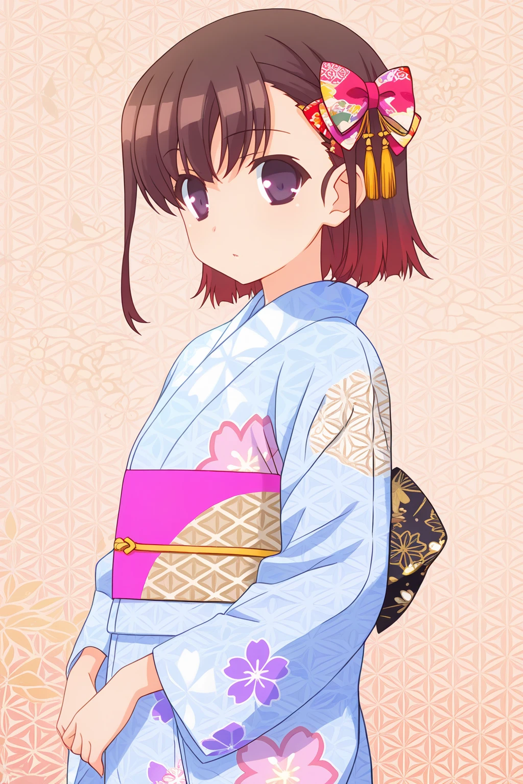 yukata, light blue yukata, floral print, long sleeves, bow, ribbon, hair ribbon, hair bow, sash, obi, pink obi, kanzashi, red hair ornament, asa no ha (pattern), sayagata, shippou (pattern)