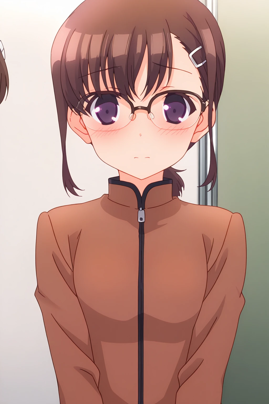 ponytail, short ponytail, hair tie, glasses, bespectacled, rimless eyewear, raised eyebrows, opaque glasses, over-rim eyewear, long sleeves, brown jacket, mandarin collar, zipper, high collar, furrowed brow