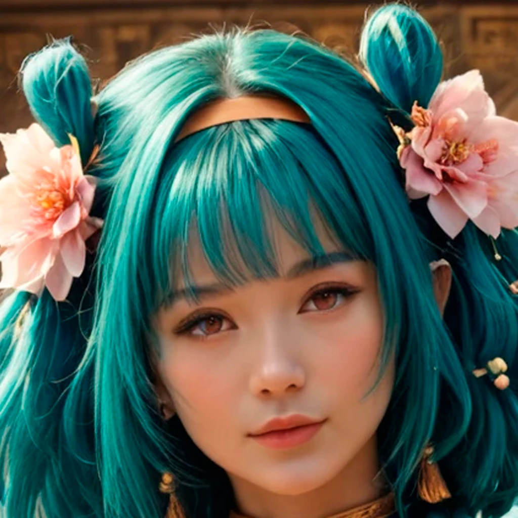 score_9, photorealistic, hyper realistic, ultra detailed, high quality. Lingzi_Ailan, teal green hair, medium hair, slightly wavy hair, straight bangs, golden hairband, braided side strands, a hair ornament with a flower and a ribbon on each side, red eyes, teal green eyebrows, , thin waist, wide , soft mauve scarf, gold brooch, blue dress, oriental fantasy dress, gold accents, shoulders, long sleeves, detached sleeves, flowing mauve sash, white peacock feather layered skirt, mauve ruffle on the skirt, white thigh-high stockings, blue ballet flats. daytime, elegant garden. sitting, legs crossed, pose, sensual expression. cinematic composition, dynamic angle, cinematic lighting, soft natural light.