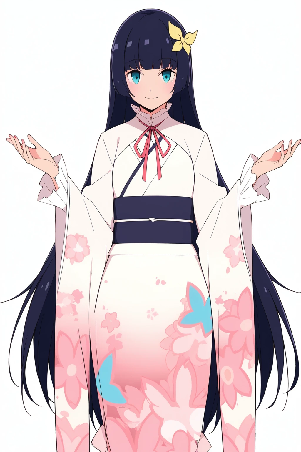 Not working: Clothes: japanese clothes, obi, sash, wide sleeves, long sleeves, neck ribbon, white kimono, pink nails, cowboy shot, straight-on, frilled kimono, neck ribbon, frilled sleeves, butterfly hair ornament,