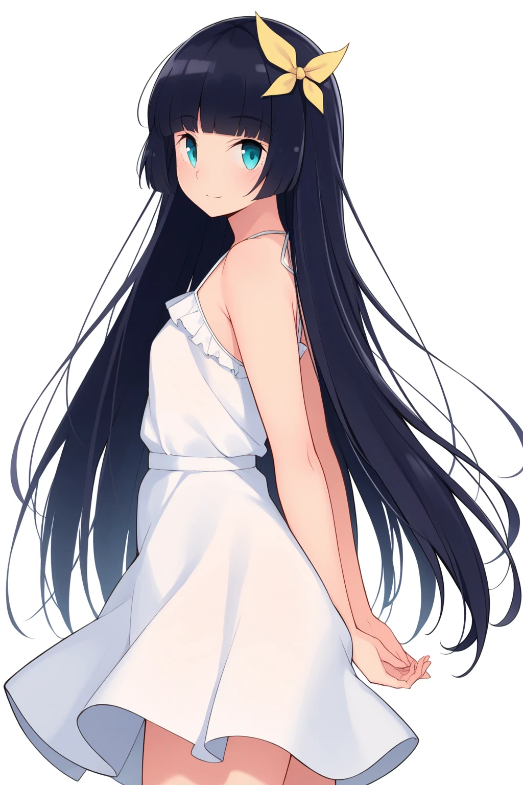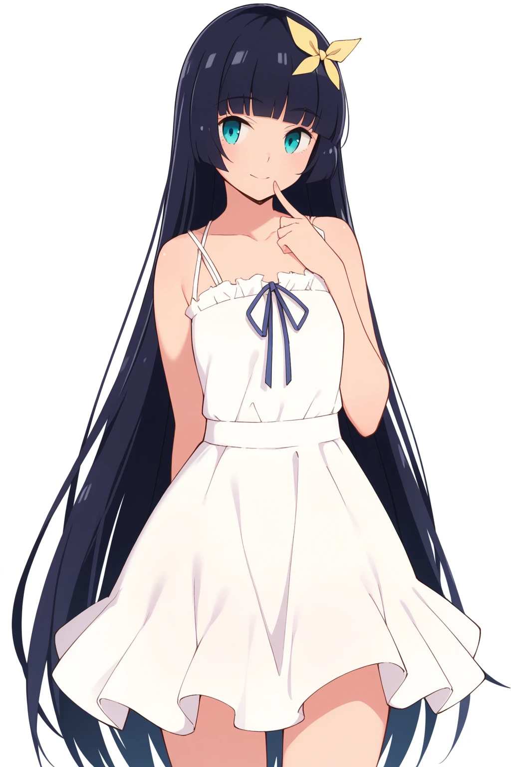 Character tags: komagata hanabi, very long hair, black hair, hime cut, blunt bangs, aqua eyes, hair ribbon,