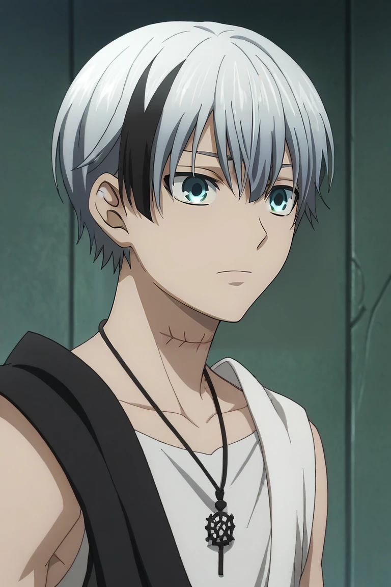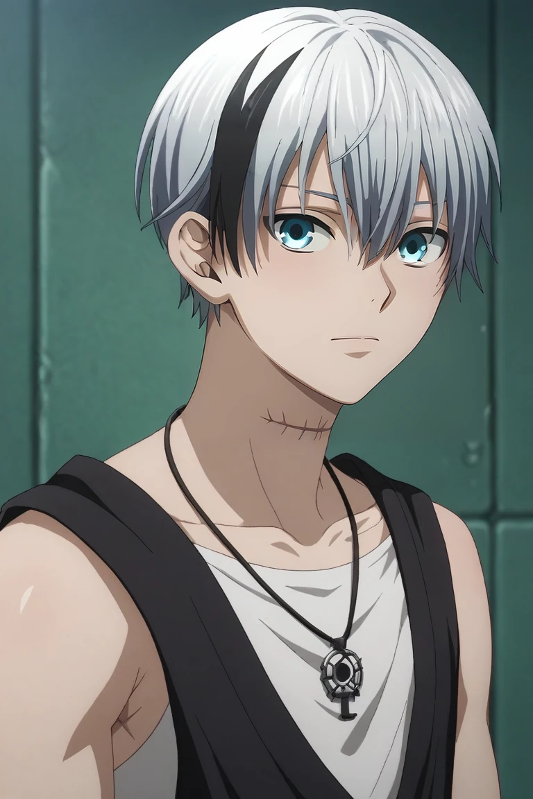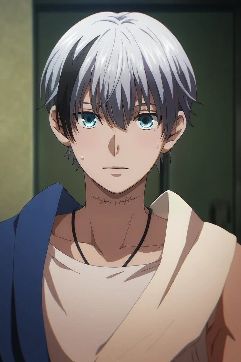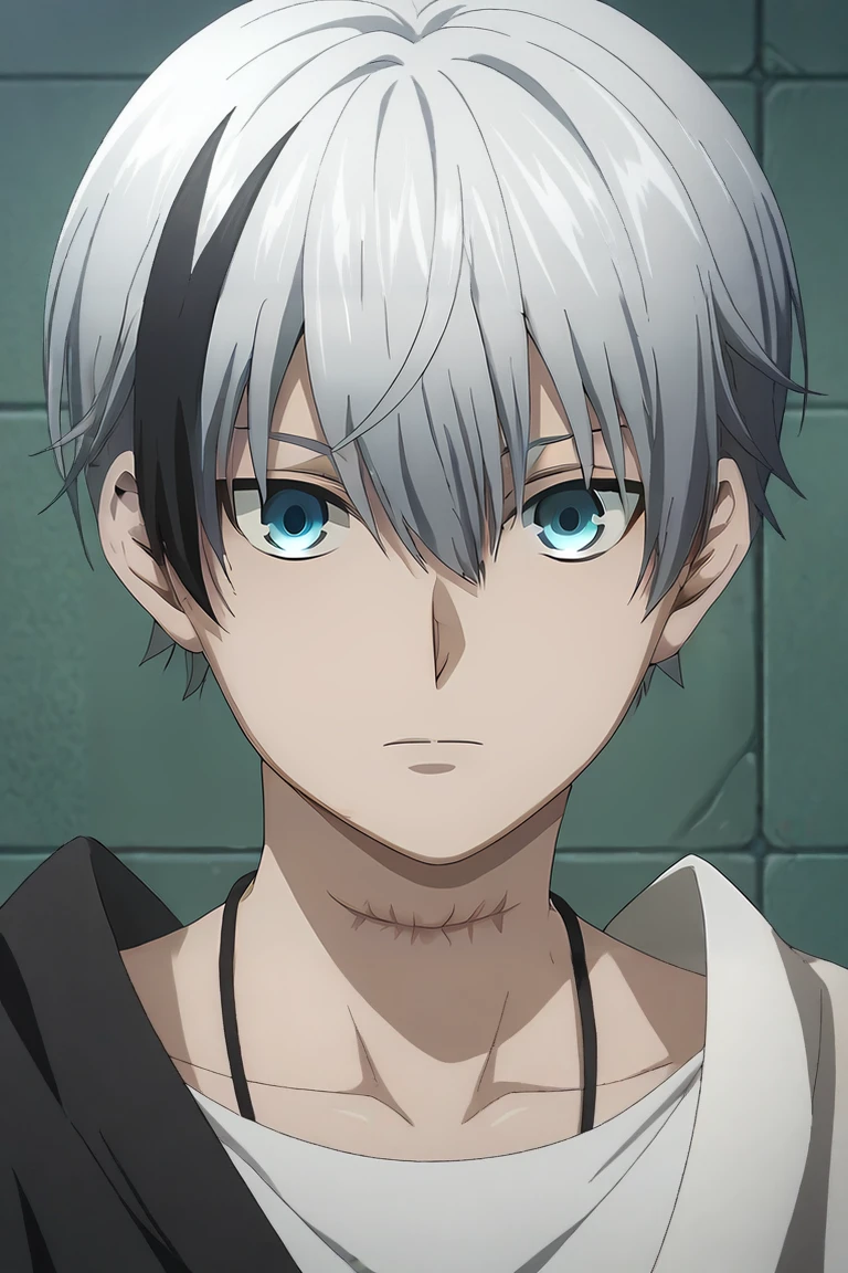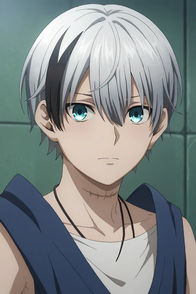 polka_shinoyama, grey hair, blue eyes, two-tone hair, black hair, short hair, hair between eyes, streaked hair, bangs, scar