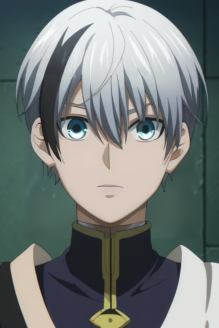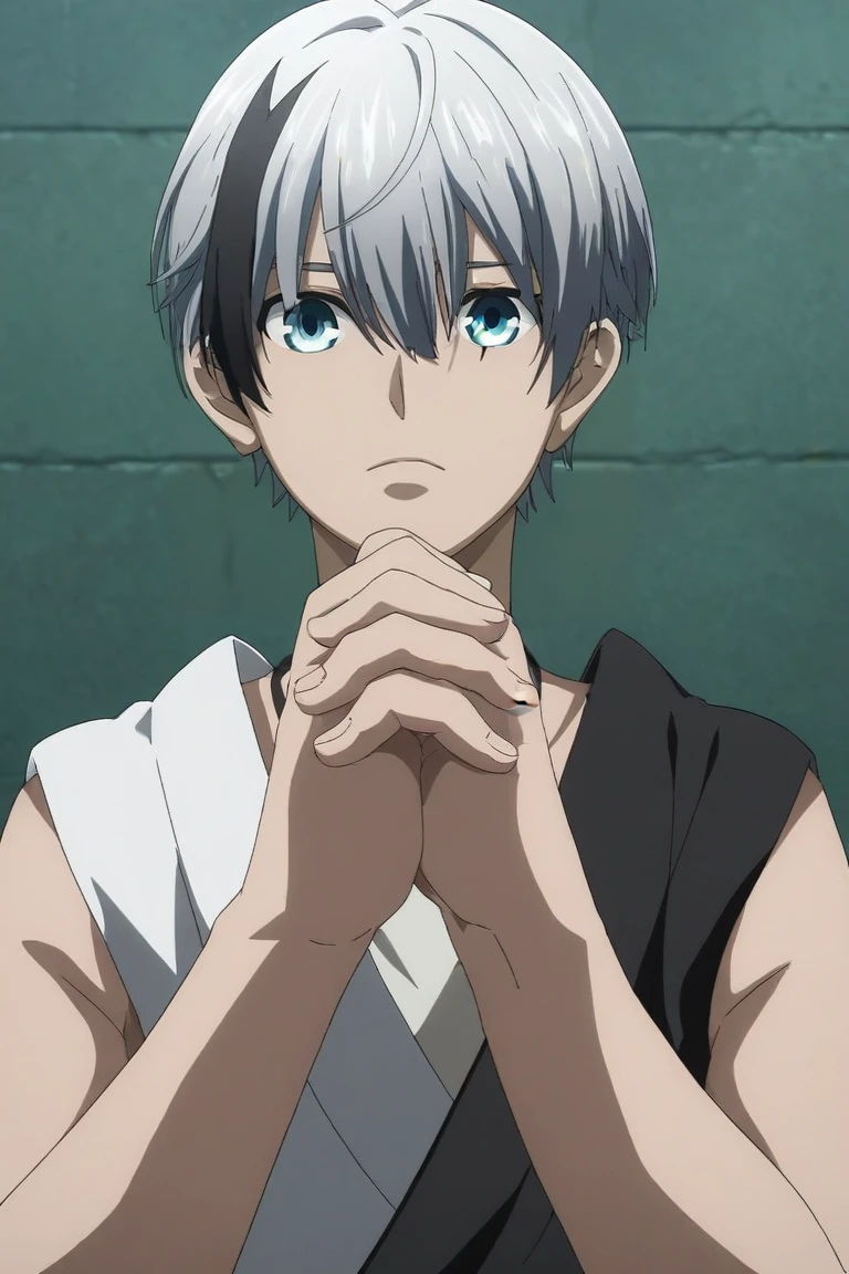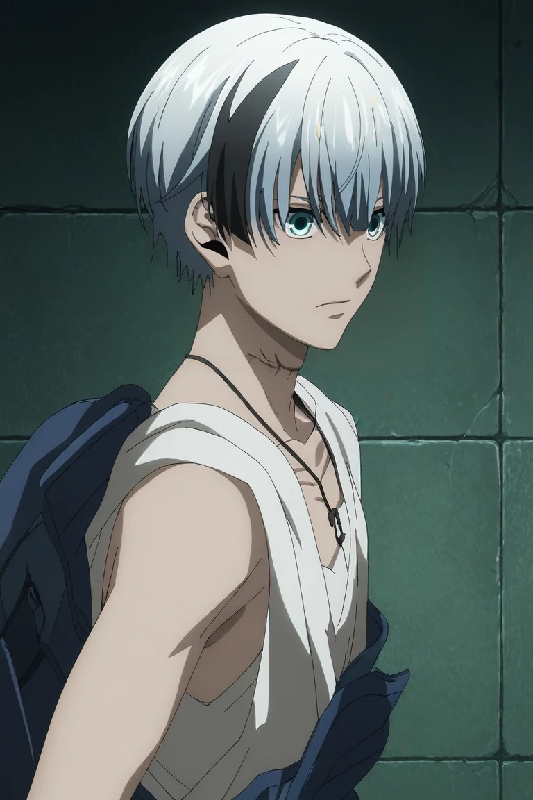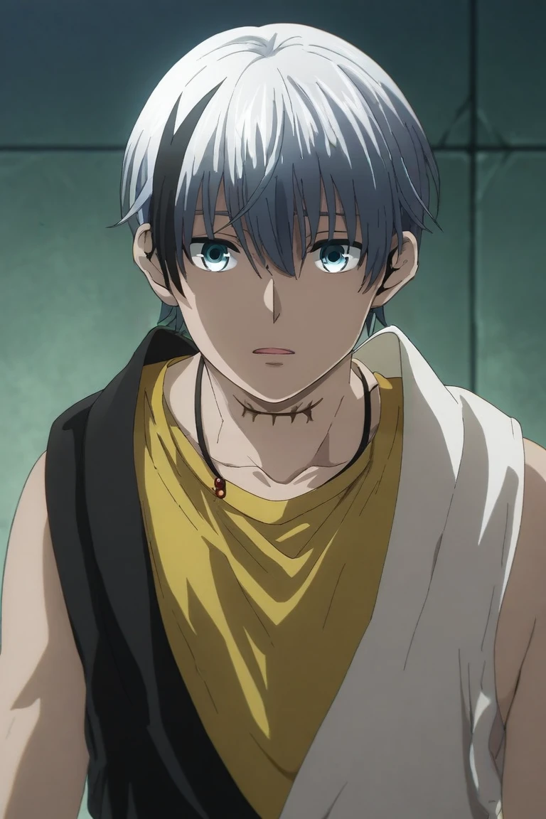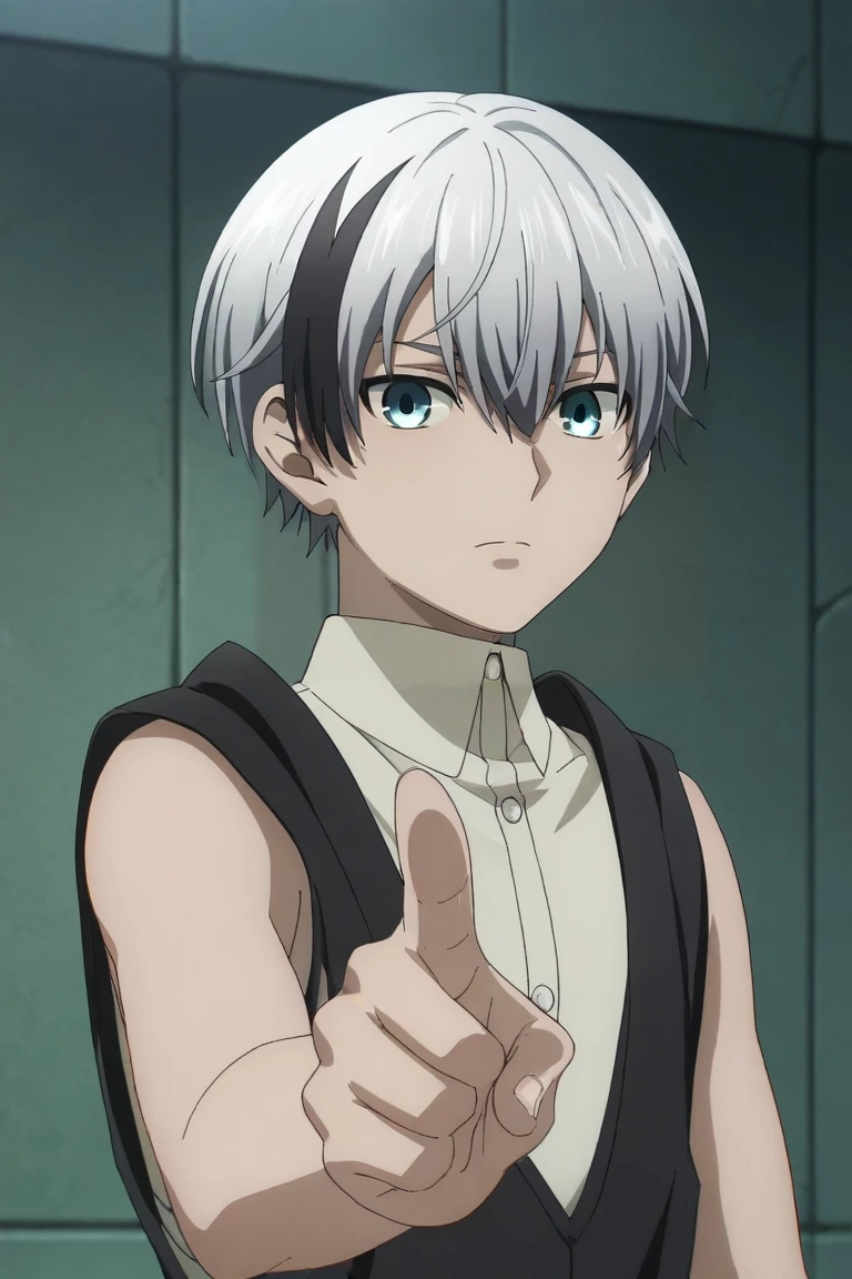 polka_shinoyama, grey hair, blue eyes, two-tone hair, black hair, short hair, hair between eyes, streaked hair, bangs, scar