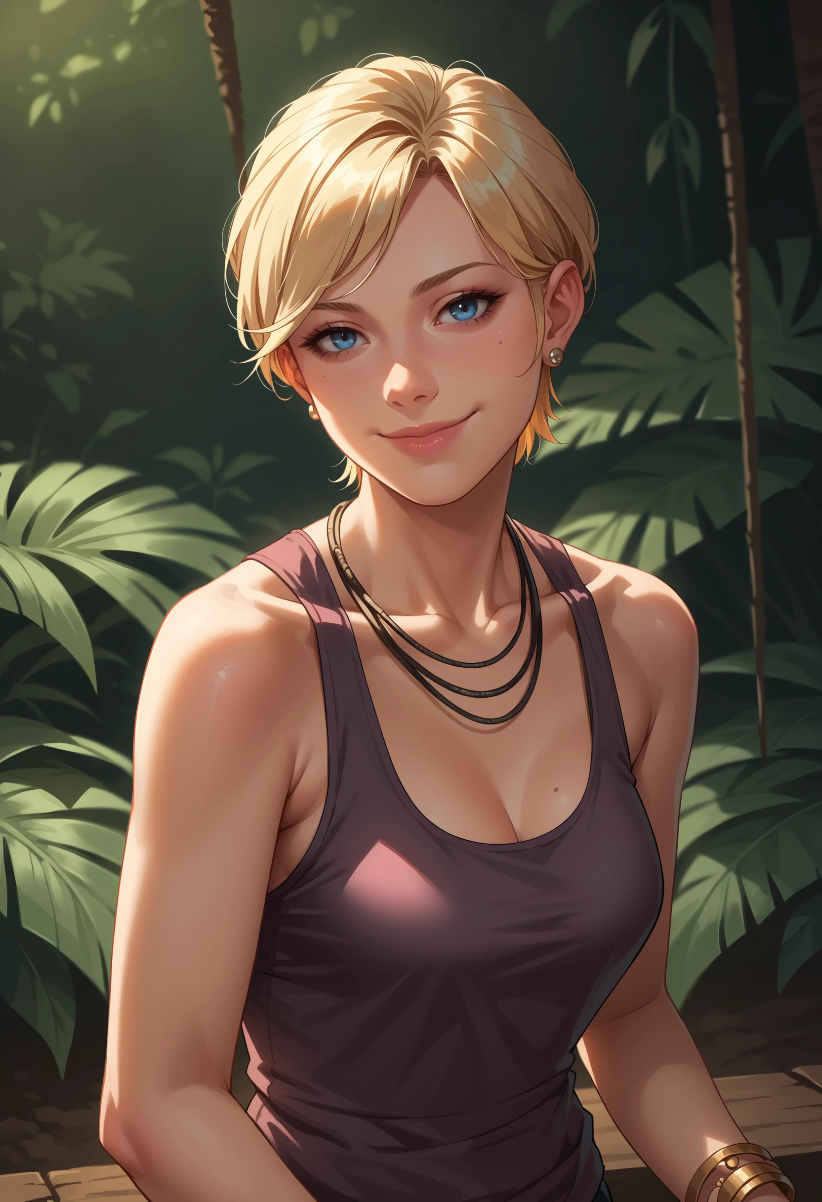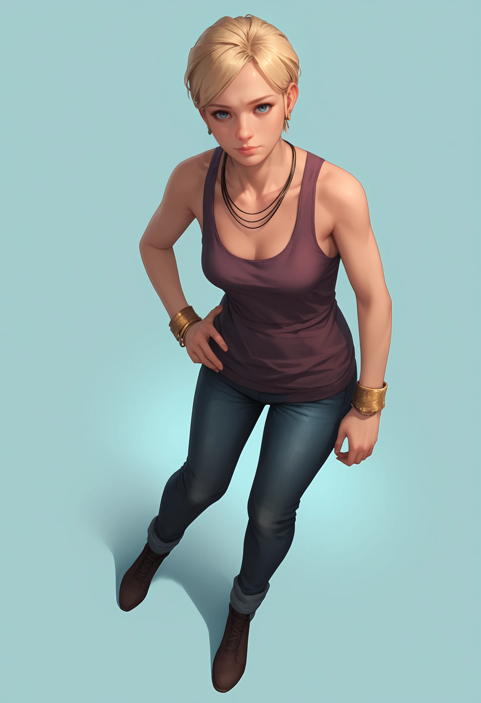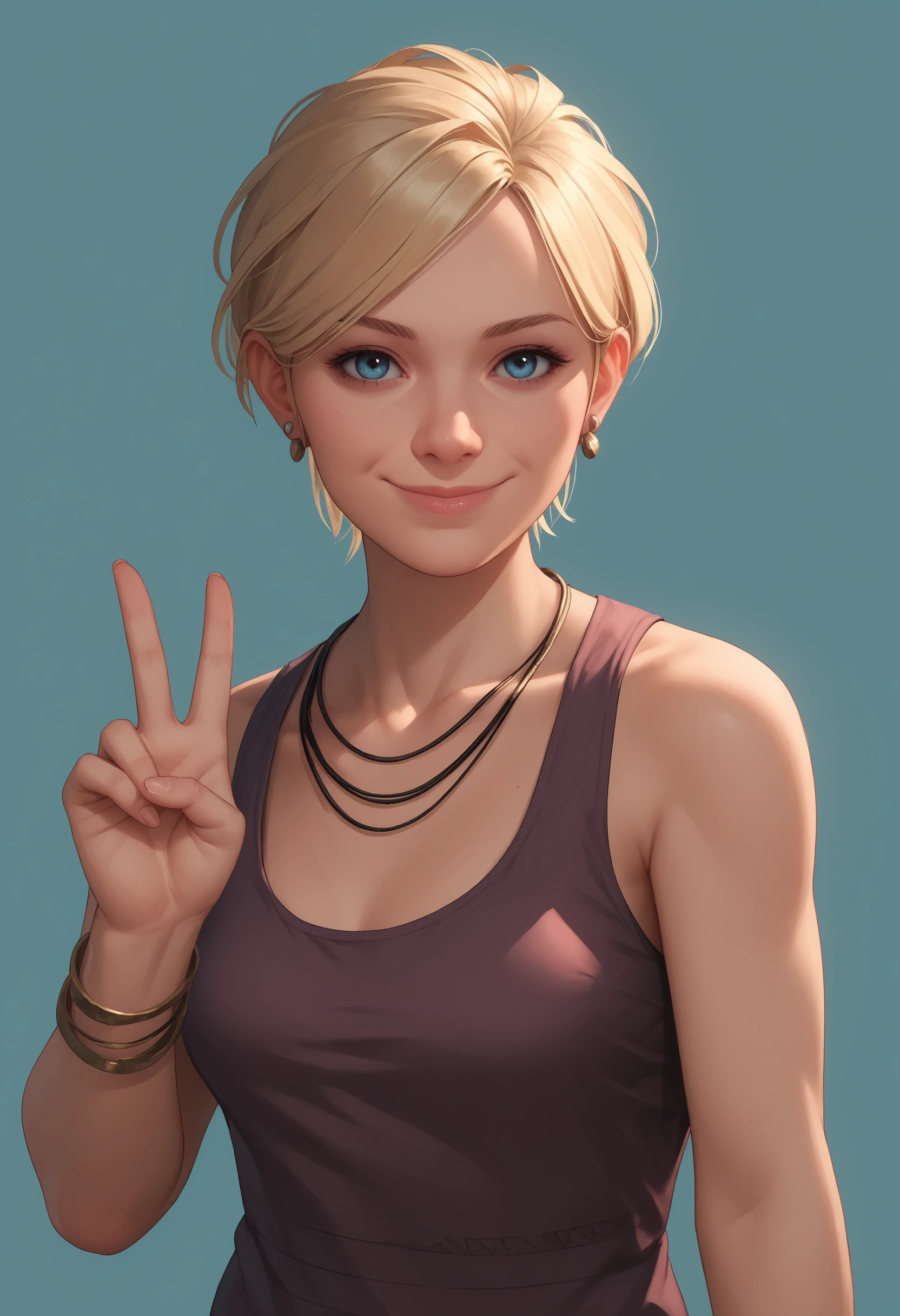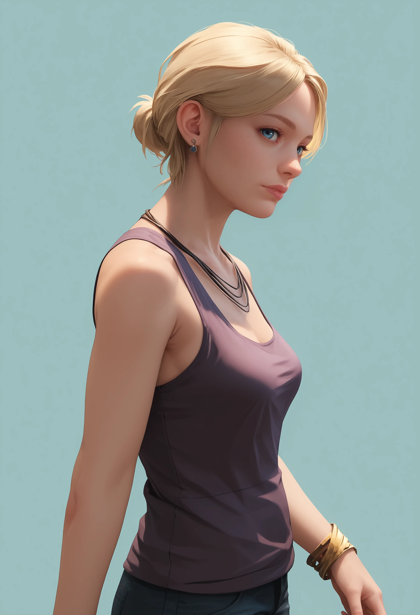 1girl, blonde hair, blue eyes, short hair, breasts, tank top, pants, bracelet, jewelry, necklace, earrings