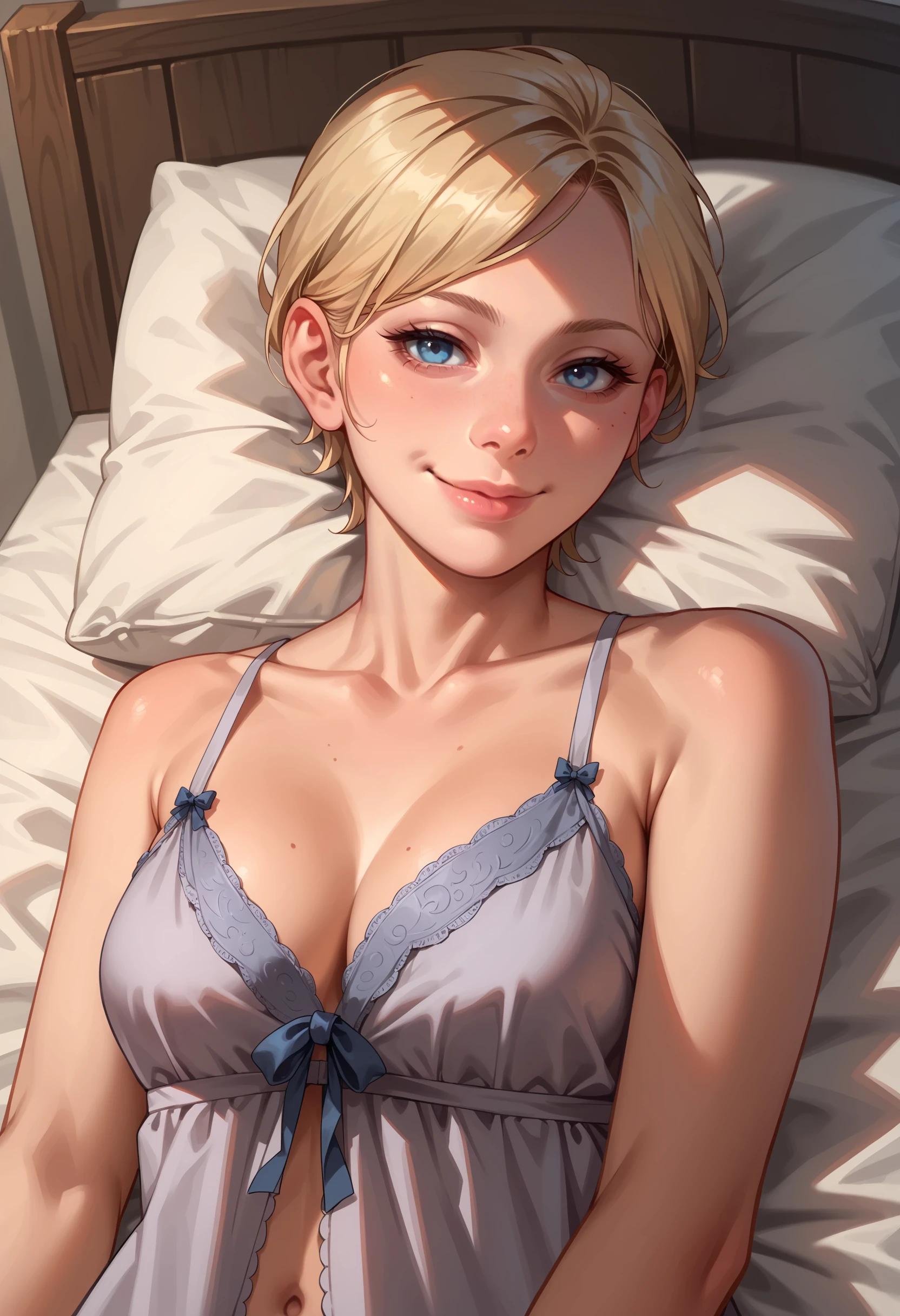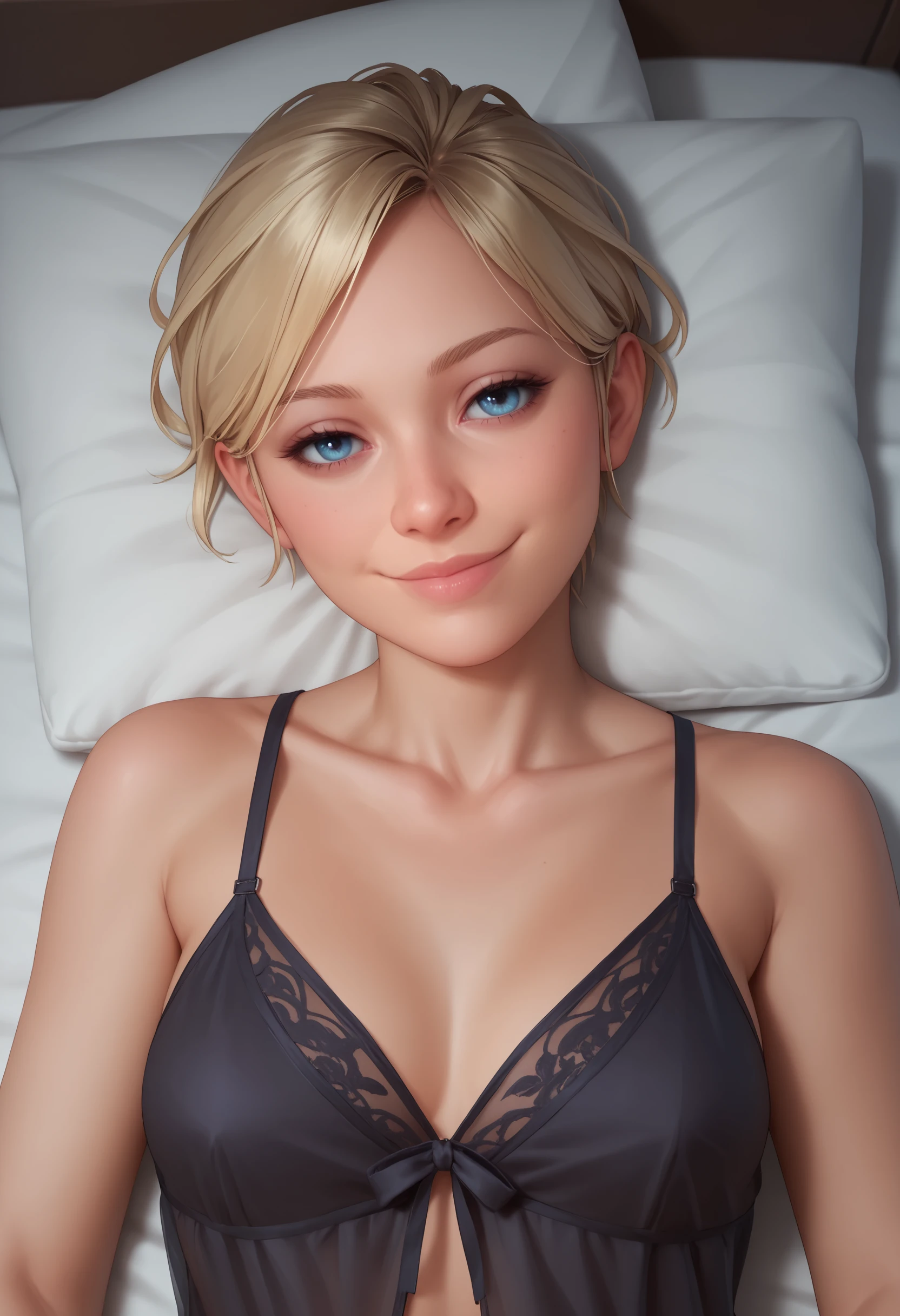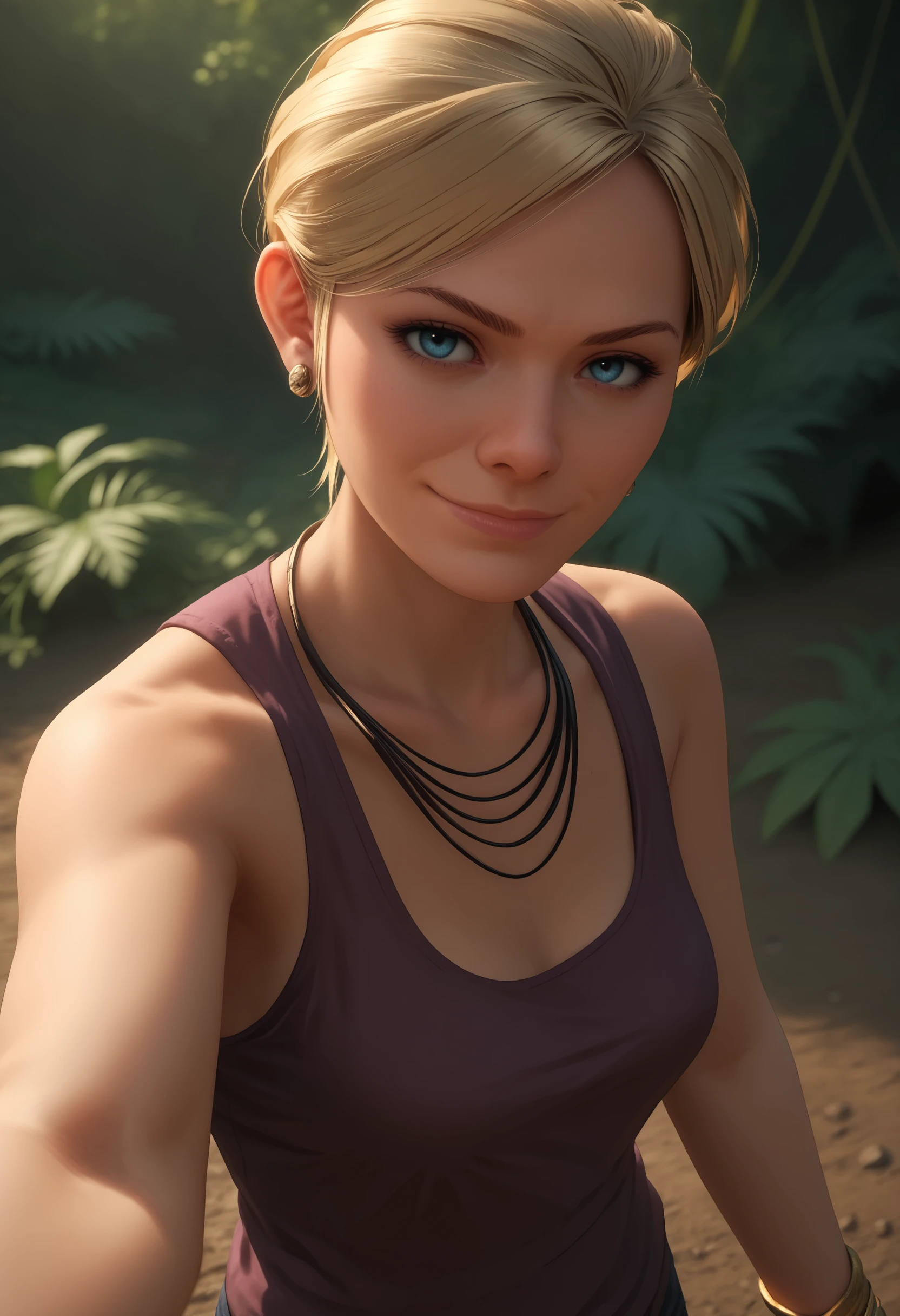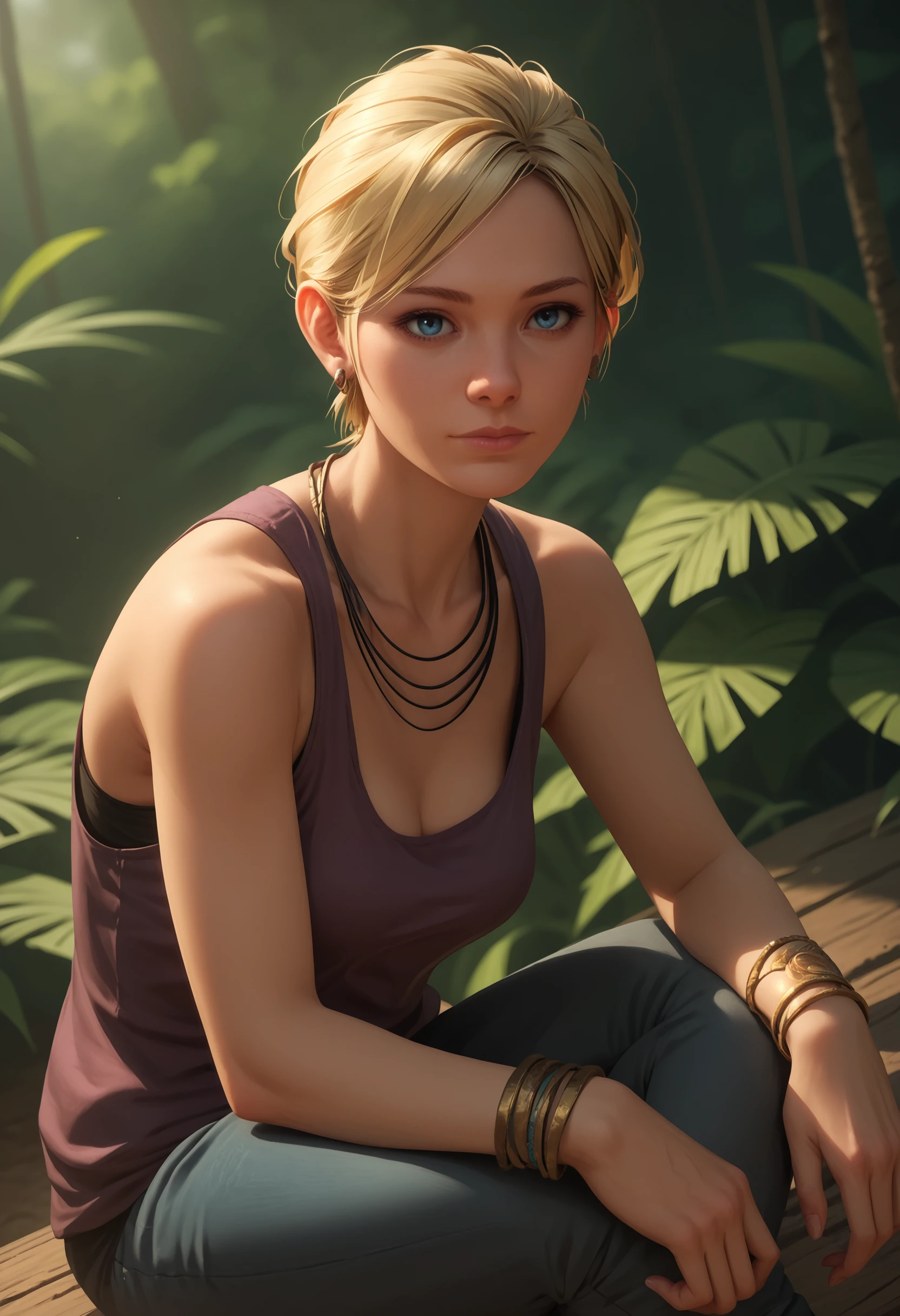 1girl, blonde hair, blue eyes, short hair, breasts, tank top, pants, bracelet, jewelry, necklace, earrings