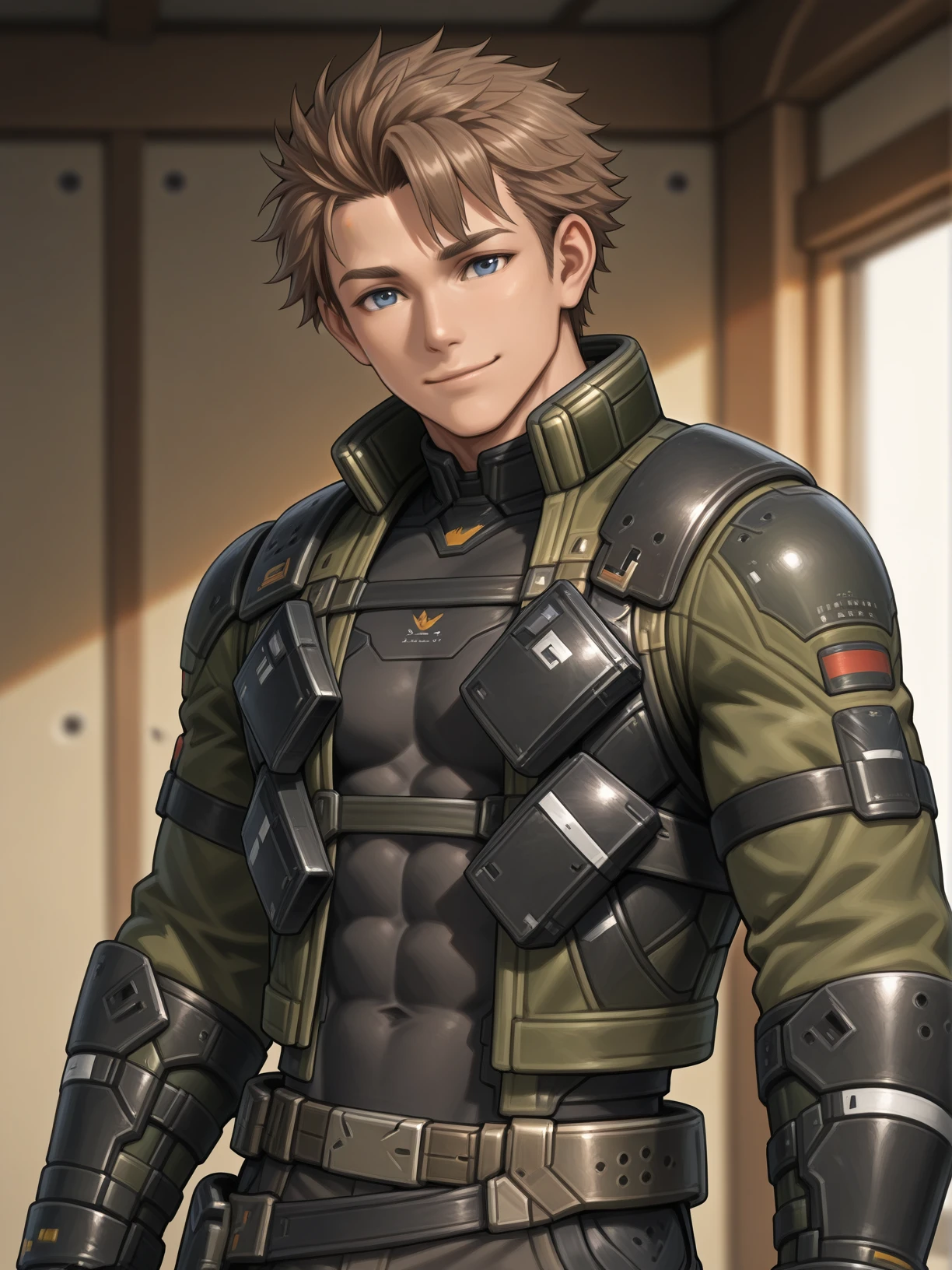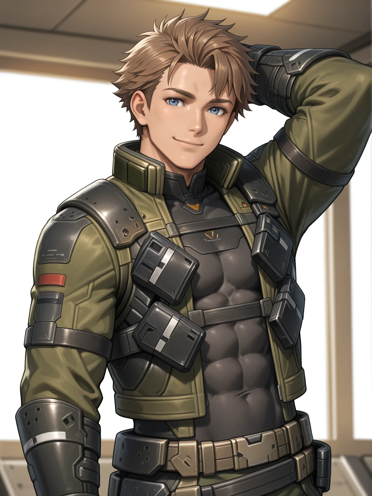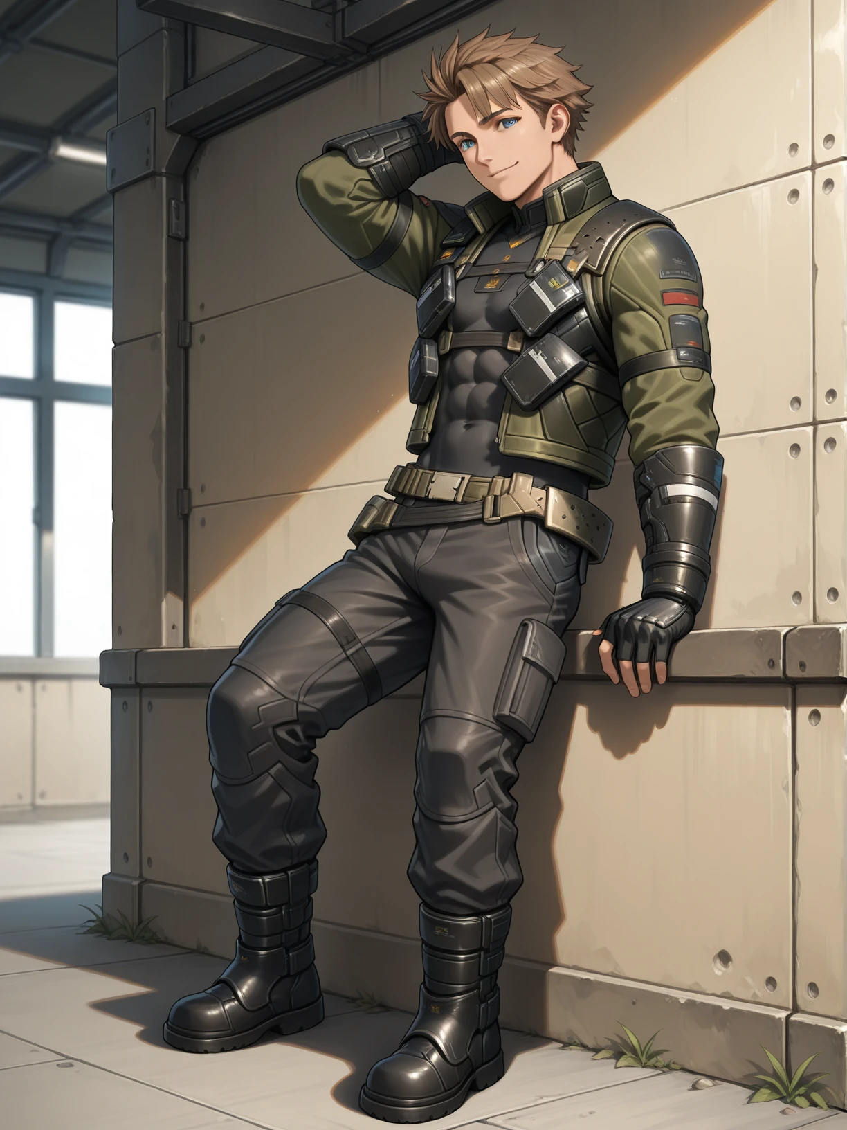 gwin, 1boy, brown hair, short spiky hair, blue eyes, tactical outfit, military style, green jacket, black shirt, armored gloves, utility belt, cargo pants, black boots