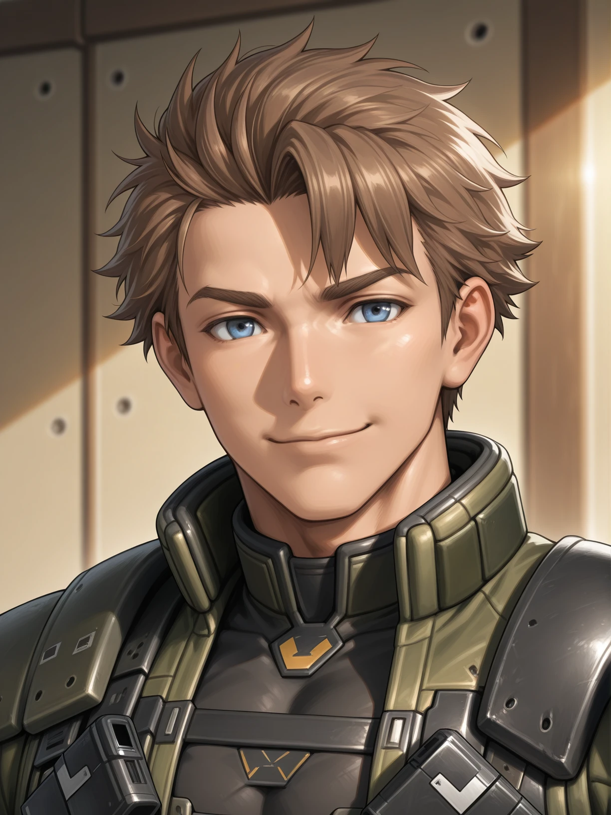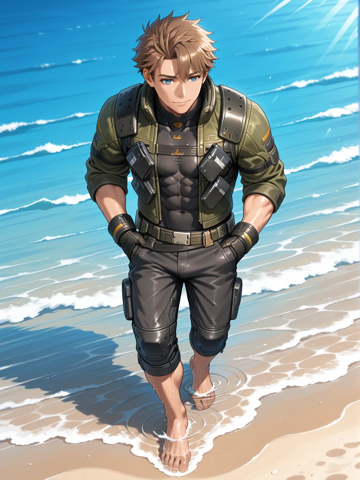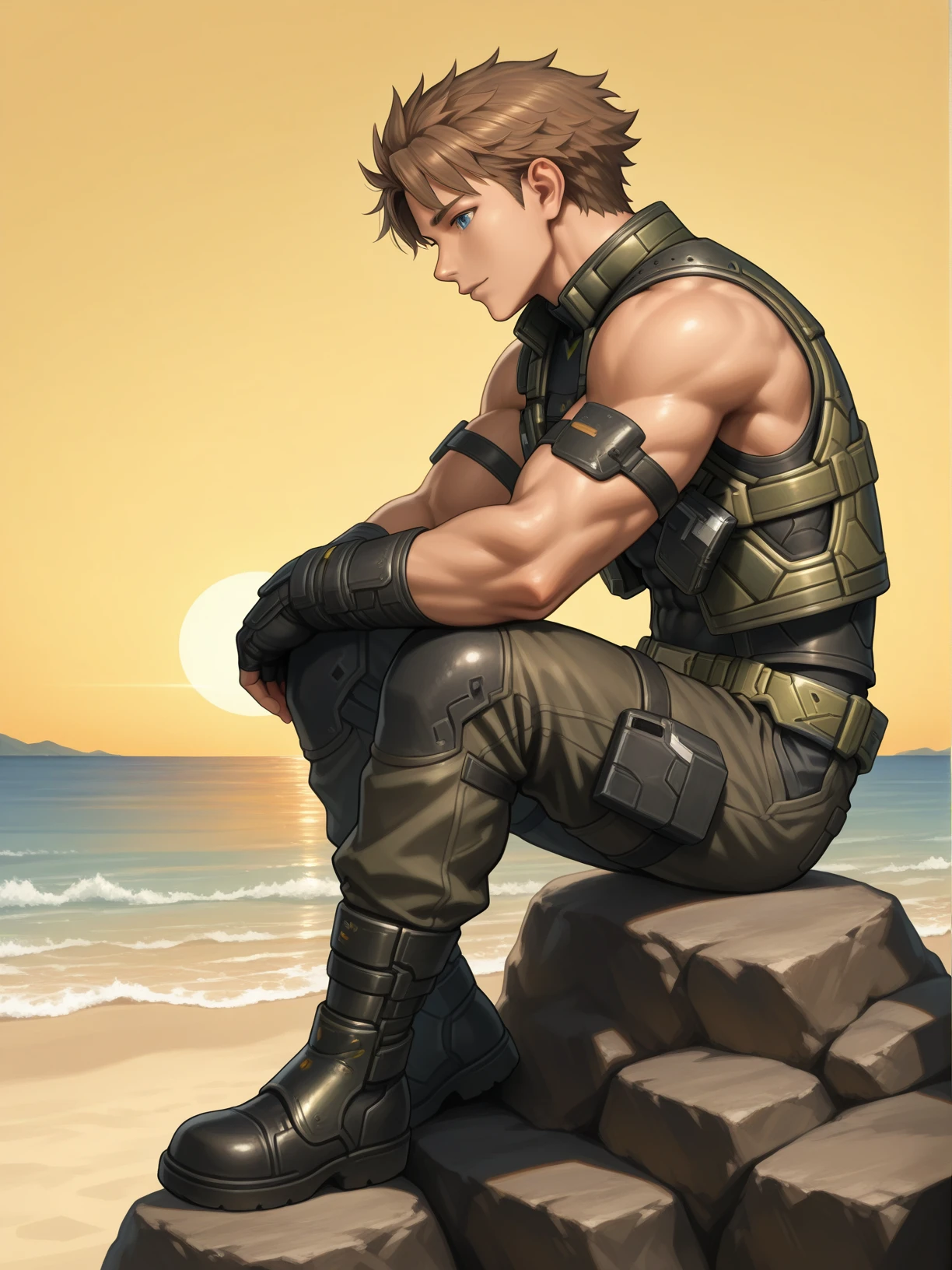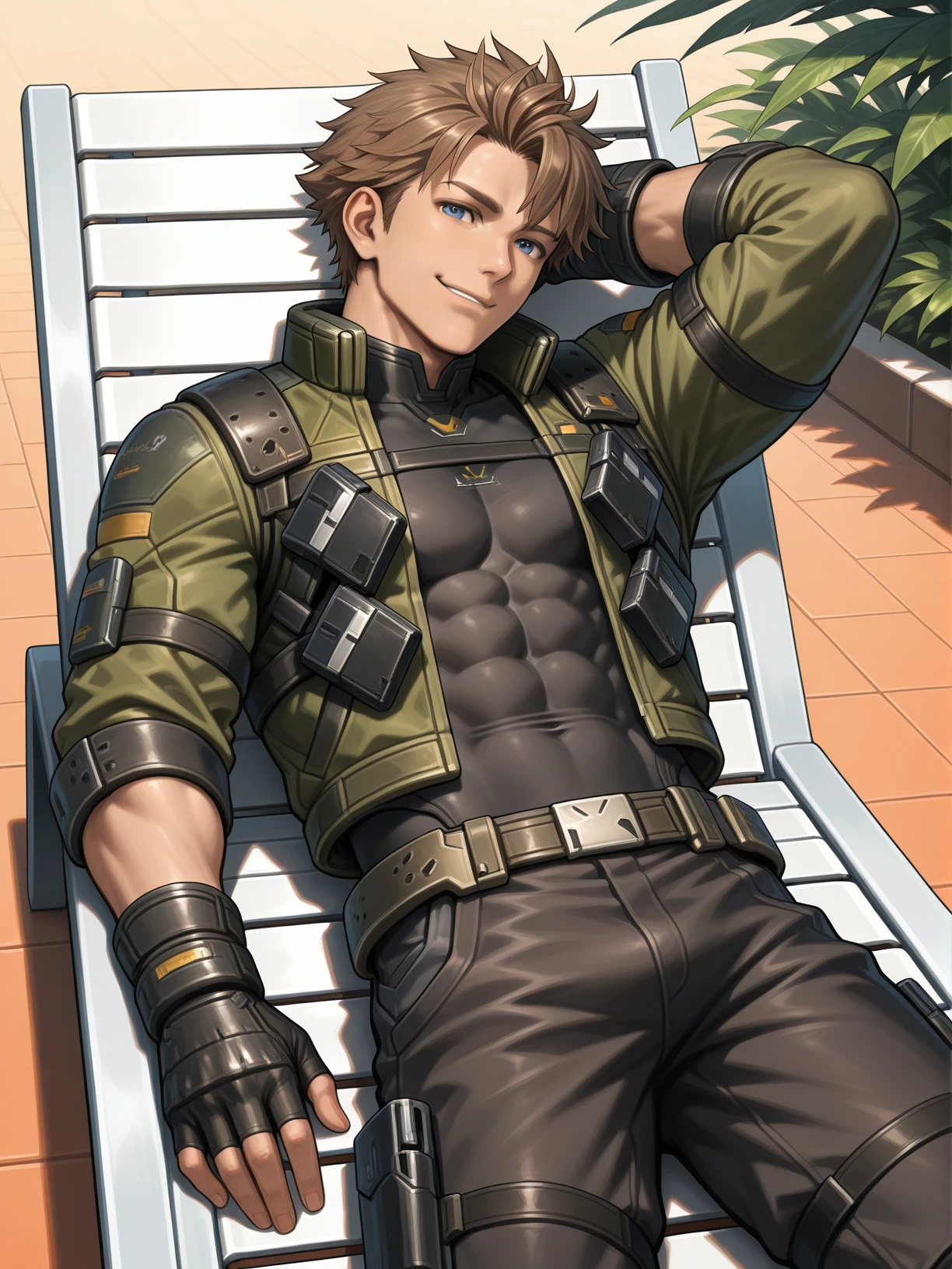 gwin, 1boy, brown hair, short spiky hair, blue eyes, tactical outfit, military style, green jacket, black shirt, armored gloves, utility belt, cargo pants, black boots