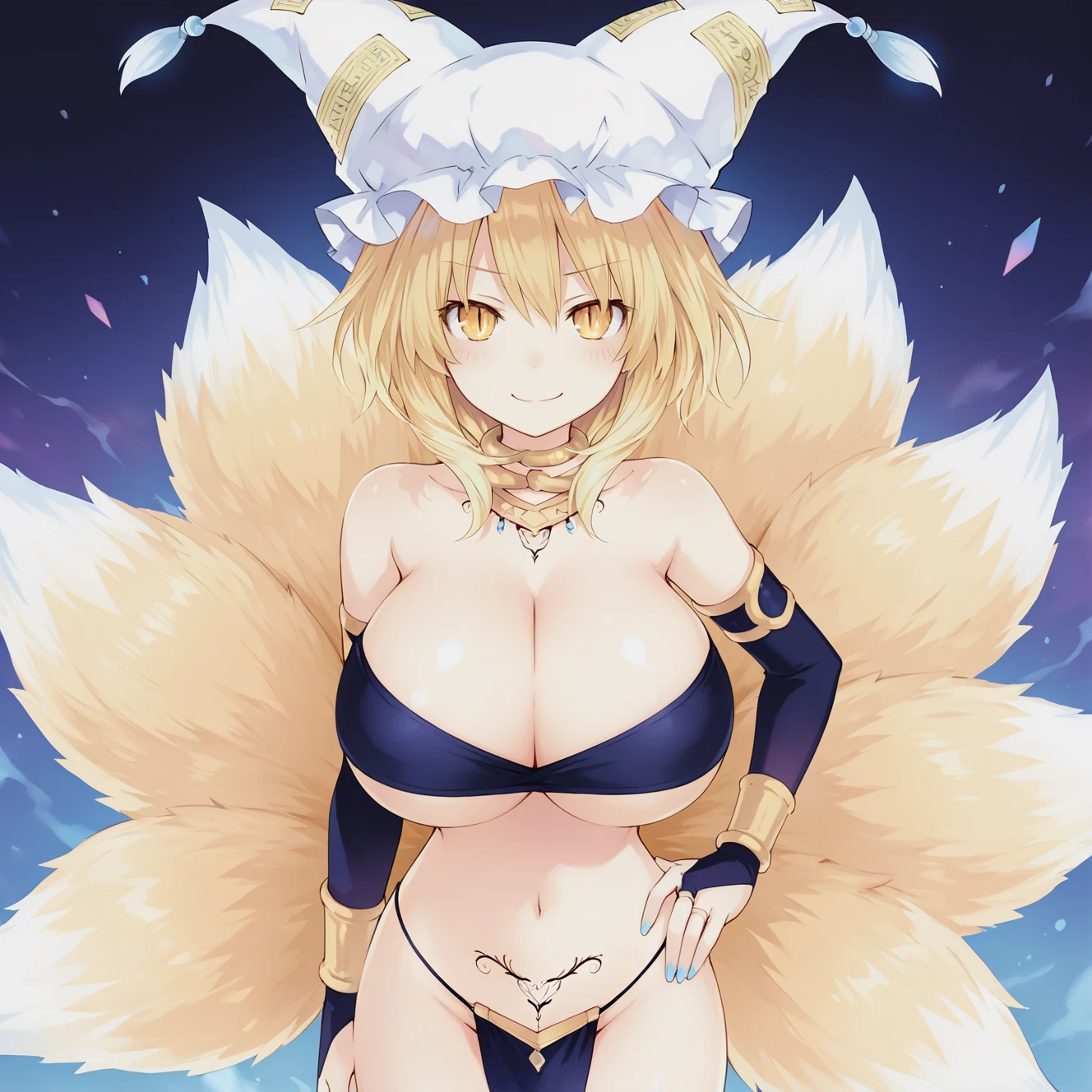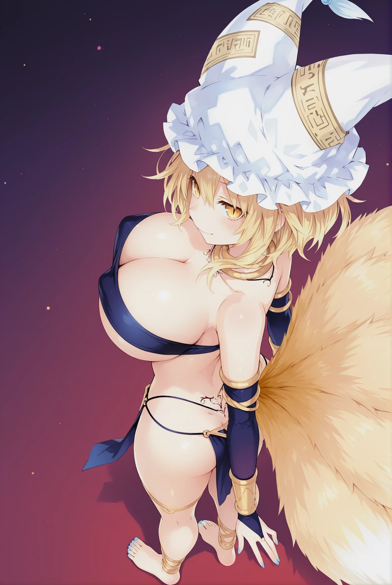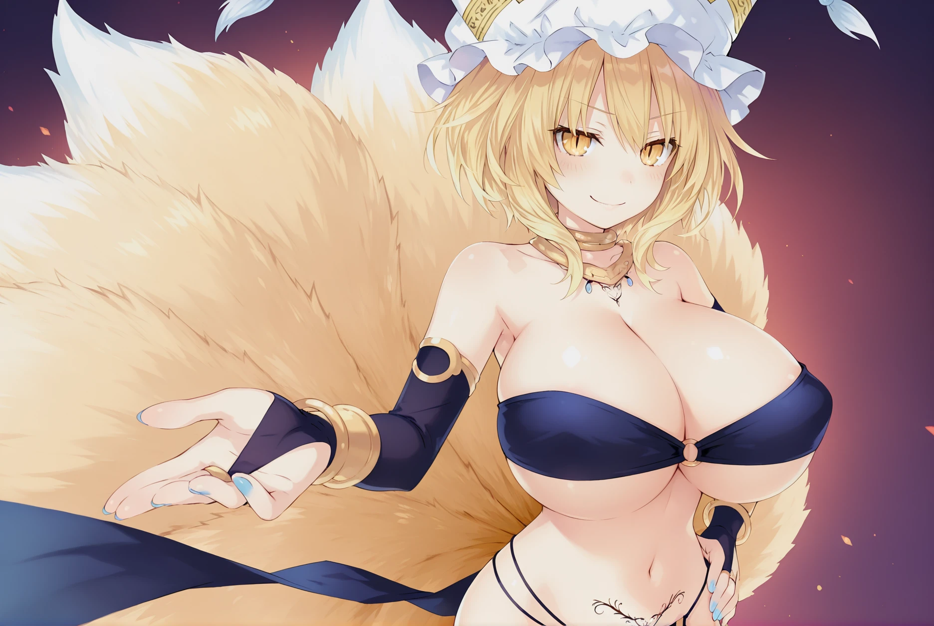 Ran Yakumo,1girl,fox tail,tail,yakumo ran,tattoo,pubic tattoo,multiple tails,breasts,solo,blonde hair,yellow eyes,barefoot,short hair,navel,mob cap,loincloth,fox ears,nail polish,jewelry,pelvic curtain,blue nails,toenails,toenail polish,revealing clothes,animal hat,slit pupils,bridal gauntlets,neck ring, huge breasts,cleavage,