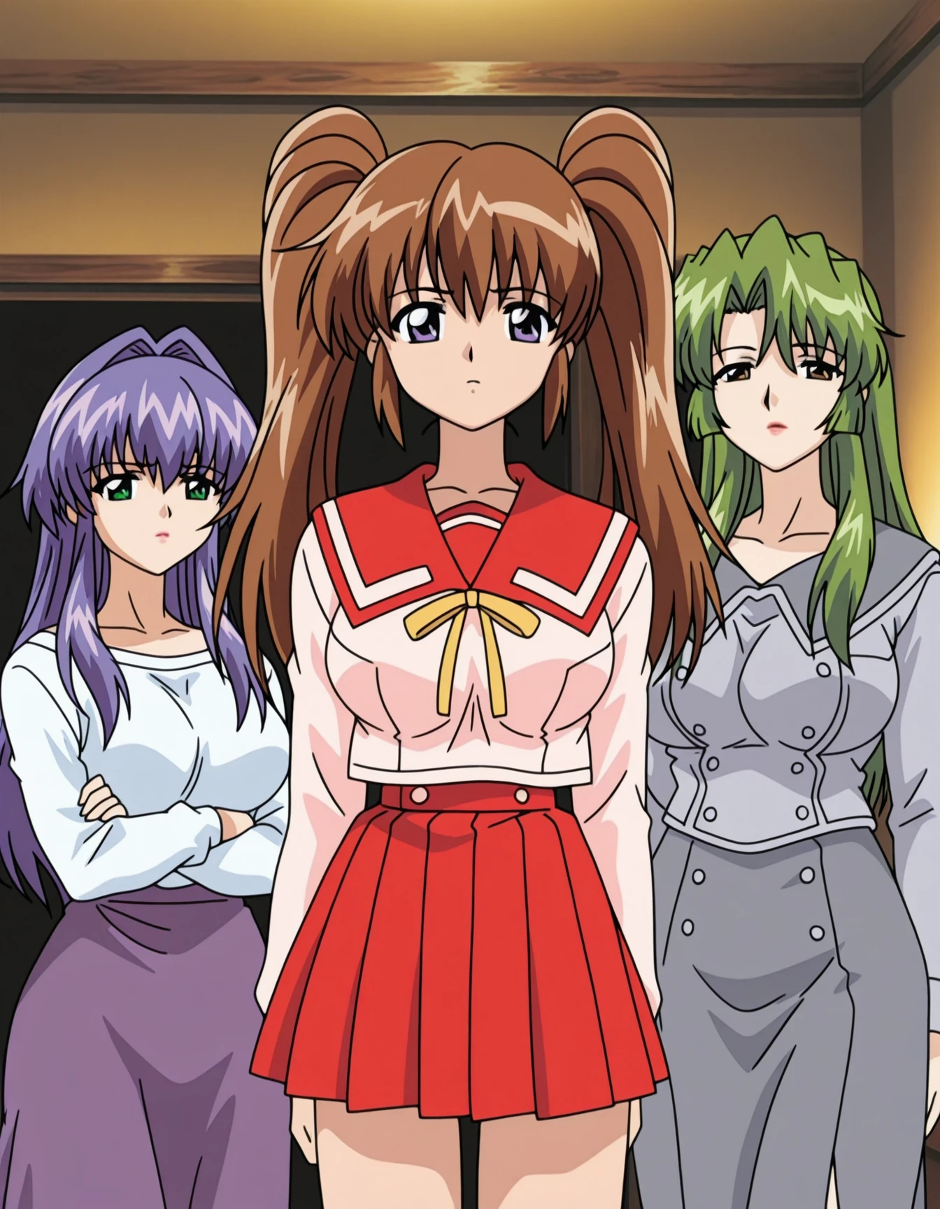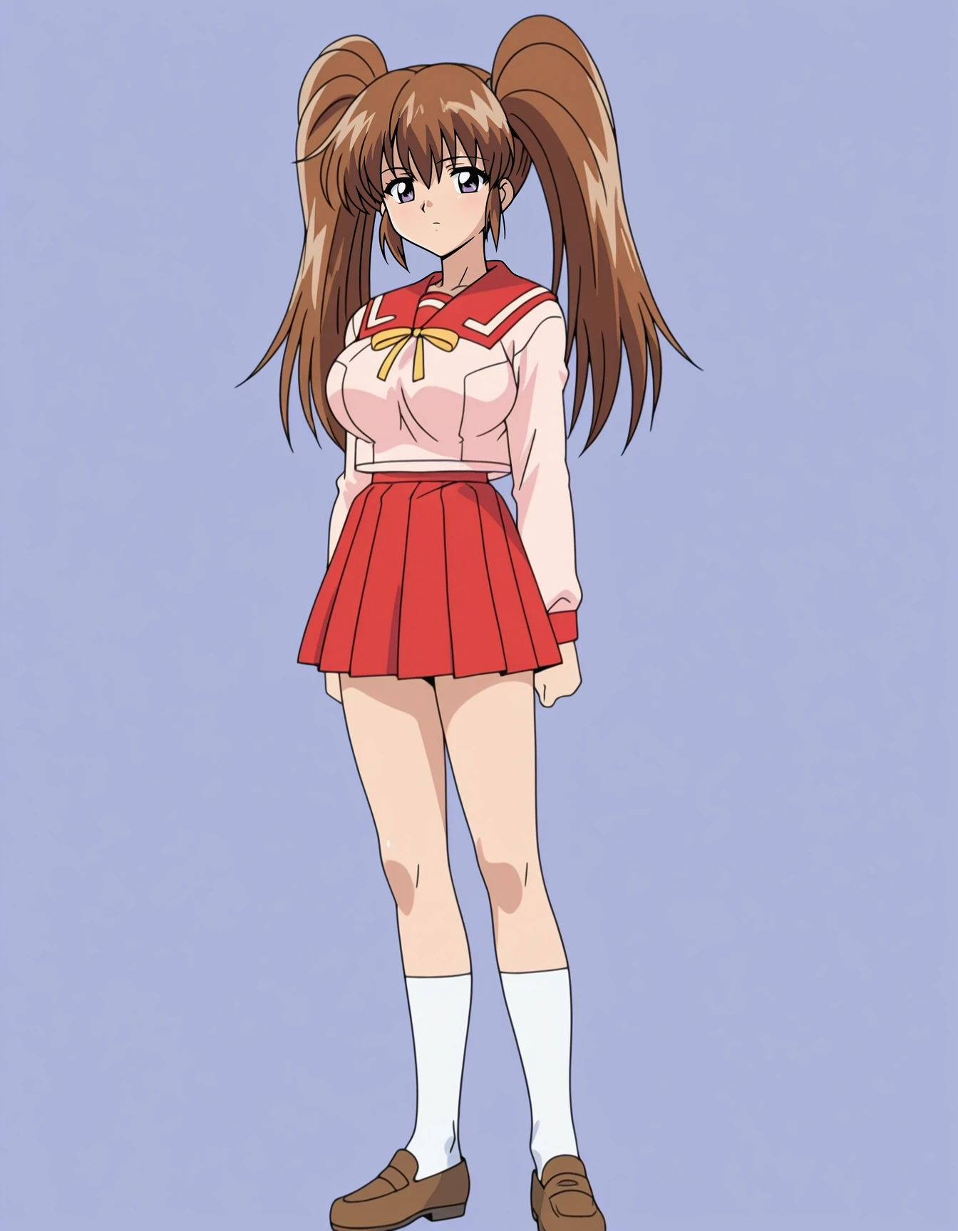 mai_rnr,mai_mikirn,long_hair,twintails,brown_hair,purple_eyes,large_breasts,school_uniform,serafuku,long_sleeves,yellow_ribbon,red_pleated_skirt,white_socks,loafers