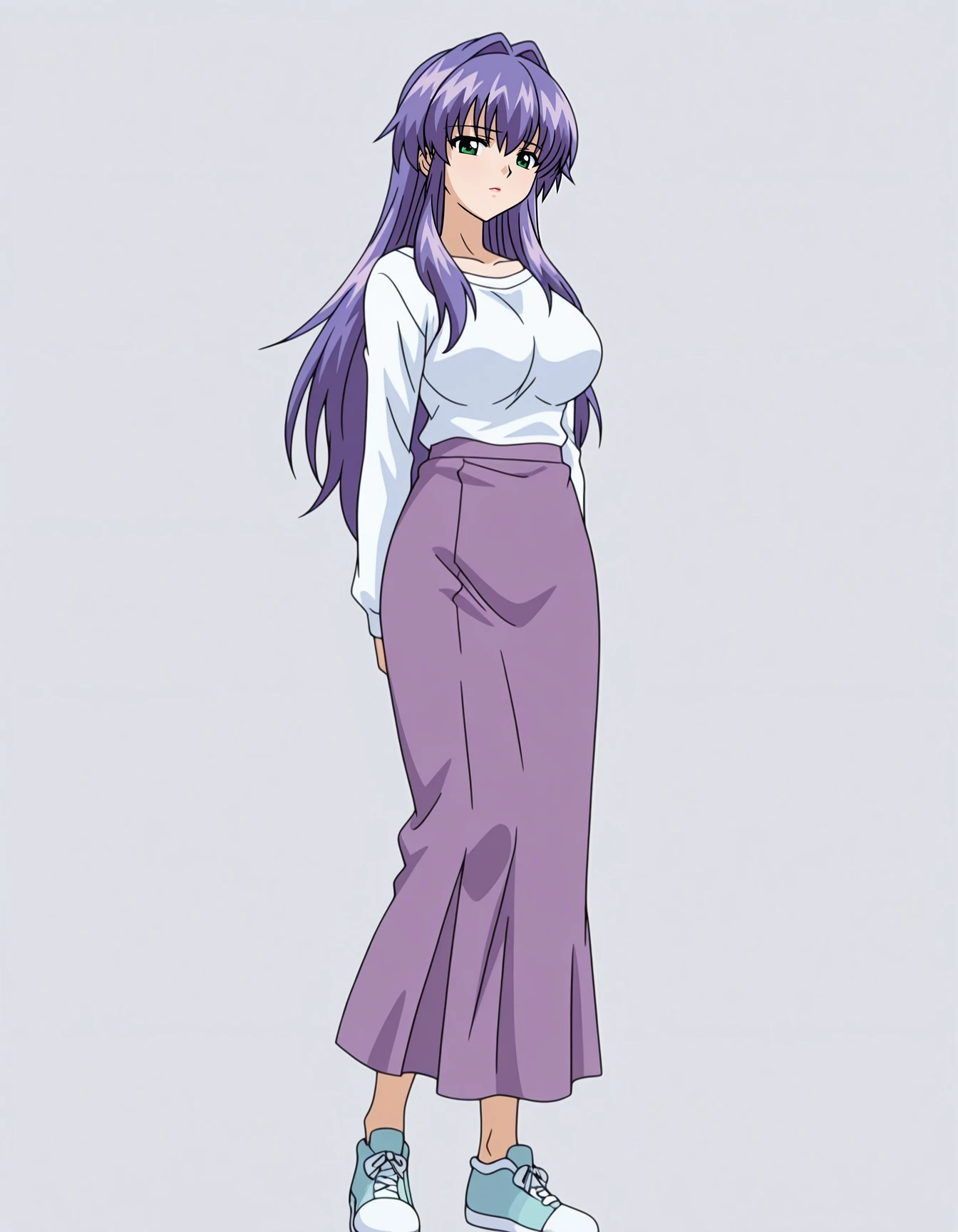 mai_rnr,mai_hirokorn,mature_female,long_hair,sidelocks,purple_hair,green_eyes,lipstick,white_shirt,purple_skirt,long_skirt,sneakers