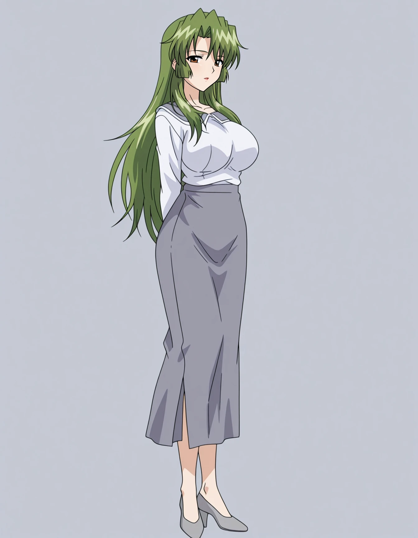 mai_rnr,mai_shizuern,mature_female,very_long_hair,parted_bangs,green_hair,brown_eyes,red_lips,long_sleeves,large_breasts,white_shirt,grey_collar,buttons,grey_skirt,long_skirt,grey_high_heels