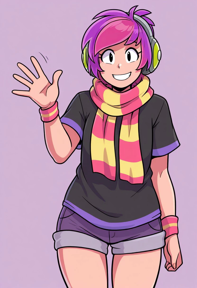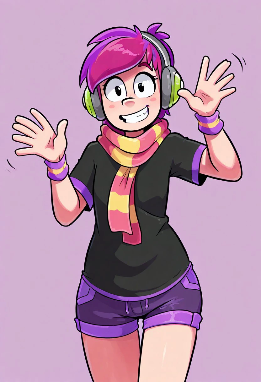 black shirt, shorts, scarf