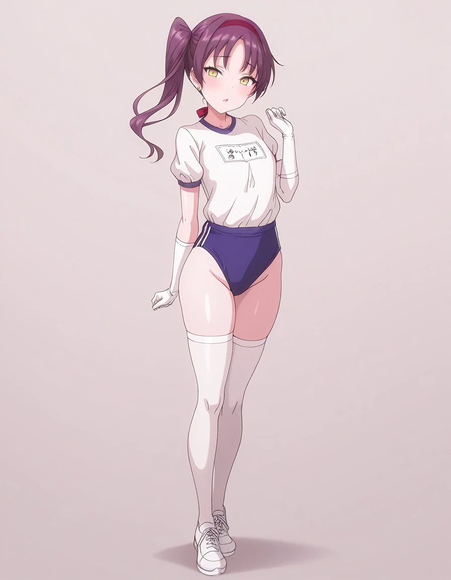 mai_kegp,mai_krgbgb1,long_hair,side_ponytail,purple_hair,yellow_eyes,earrings,red_hairband,red_headband,hair_ribbon,gym_uniform,gym_shirt,white_shirt,blue_buruma