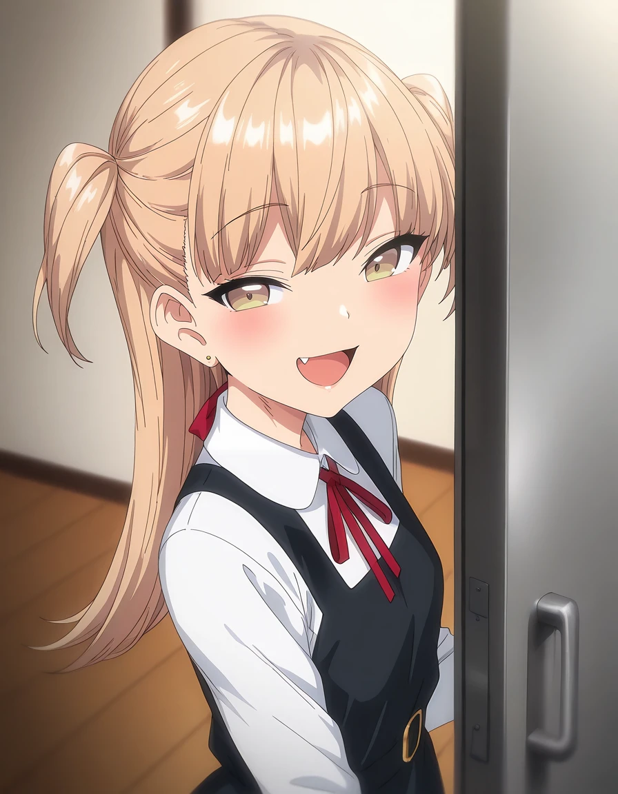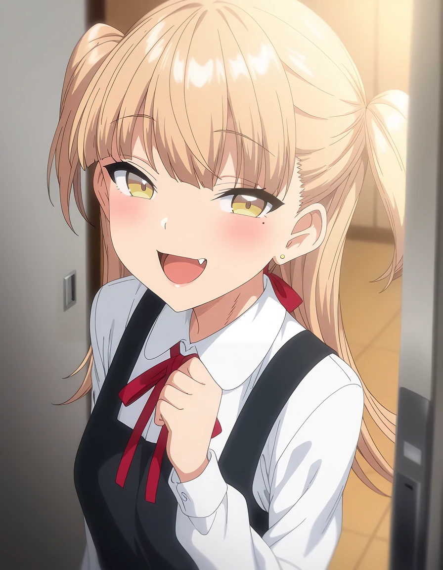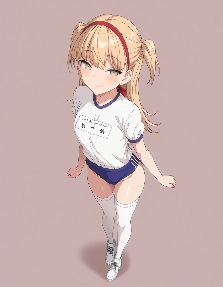 mai_kegp,mai_krgpsskp,long_hair,blonde_hair,green_eyes,two_side_up,stud_earrings,mole_under_eye,gym_uniform,gym_shirt,white_shirt,blue_buruma