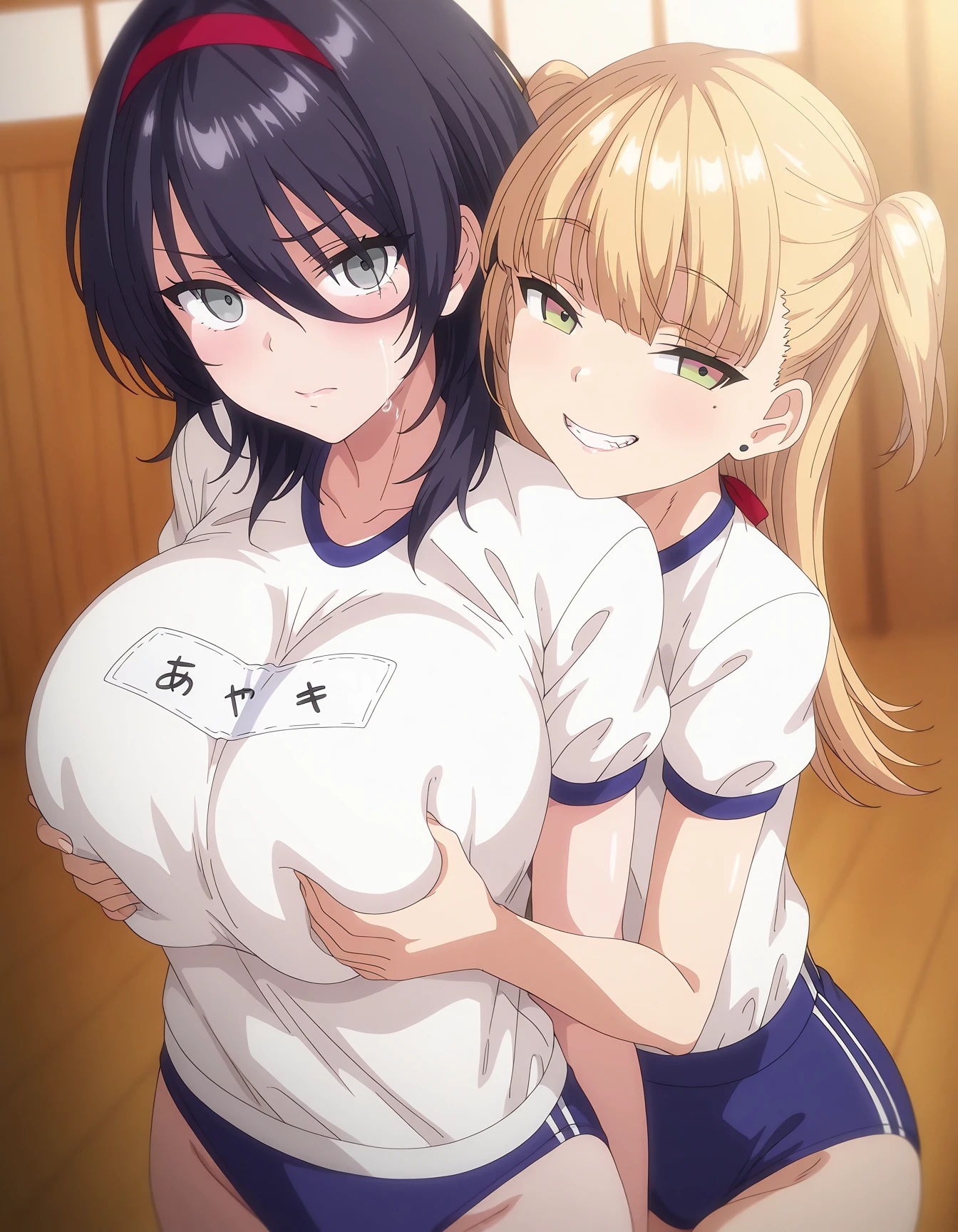 mai_kegp,mai_Ibukikp,medium_hair,black_hair,grey_eyes,hair_between_eyes,large_breasts,red_hairband,gym_uniform,gym_shirt,white_shirt,blue_buruma,white_thighhighs,crop_topI didn't remember the names of the other characters because I was engrossed in pornography...