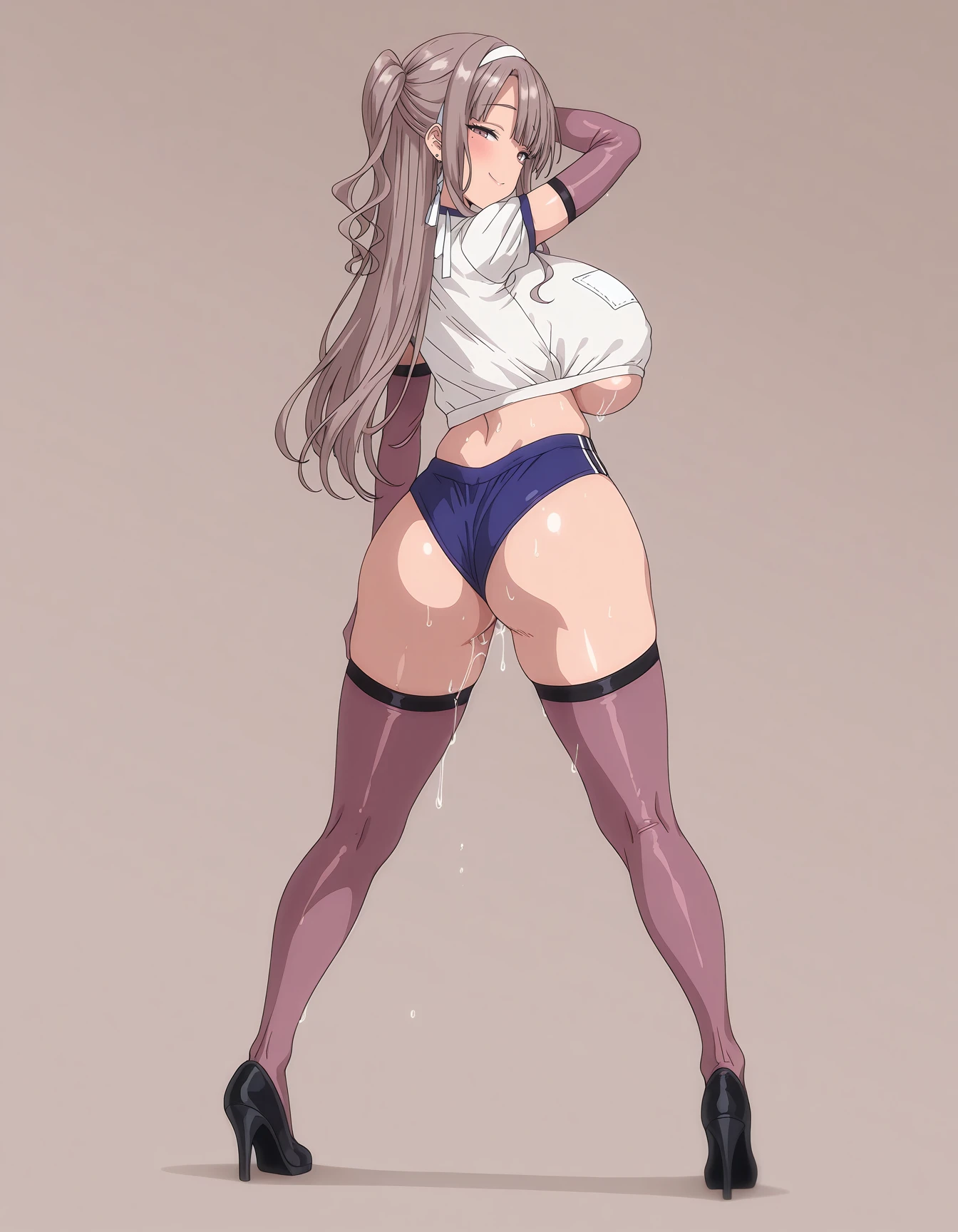 mai_kegp,mai_koharukp,long_hair,brown_hair,large_breasts,white_hairband,gym_uniform,gym_shirt,white_shirt,blue_buruma,black_thighhighs,underboob