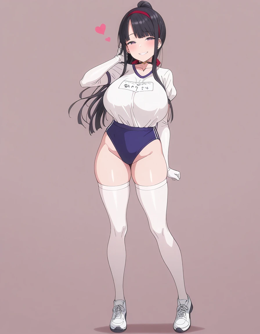 mai_kegp,mai_krbgbb2,long_hair,sidelocks,blunt_bangs,asymmetrical_bangs,ponytail,black_hair,purple_eyes,large_breasts,red_hairband,heart_choker,gym_uniform,gym_shirt,white_shirt,blue_buruma