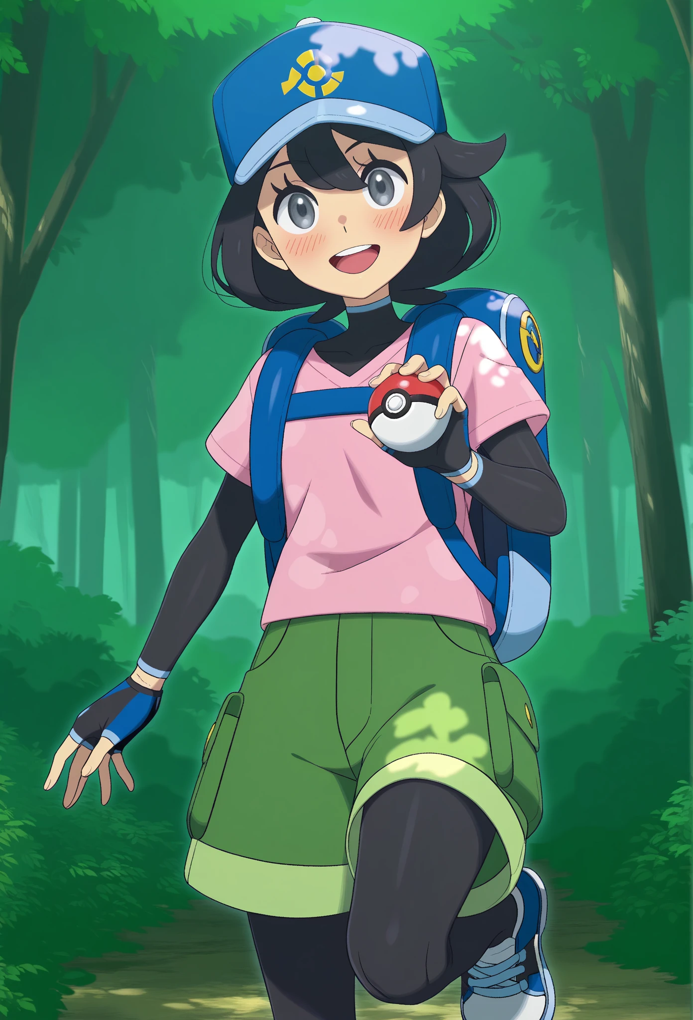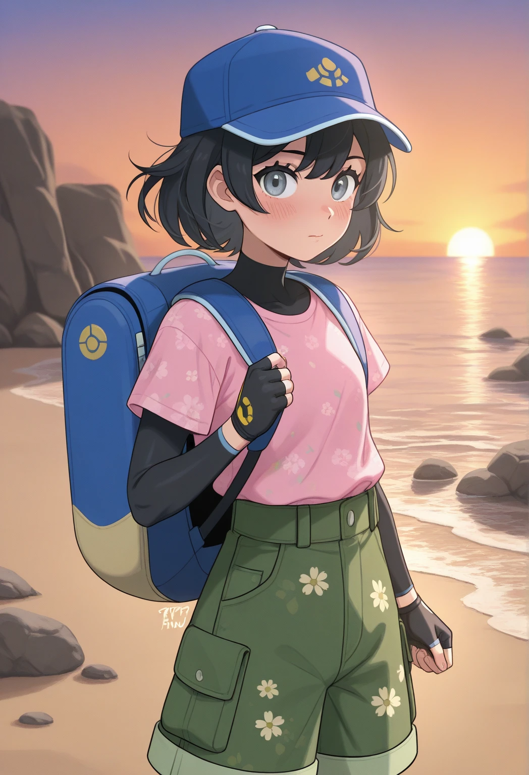 fppwaw, 1girl, solo, black hair, grey eyes, blue cap, pink shirt, black , fingerless gloves, green shorts, pink sneakers, backpack