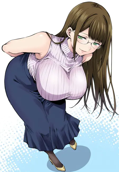 yuzuki hanyu, long brown hair, straight bangs, glasses, green eyes, large breasts, wide hips, mature woman, manga, world's end harem