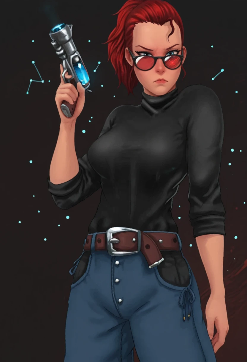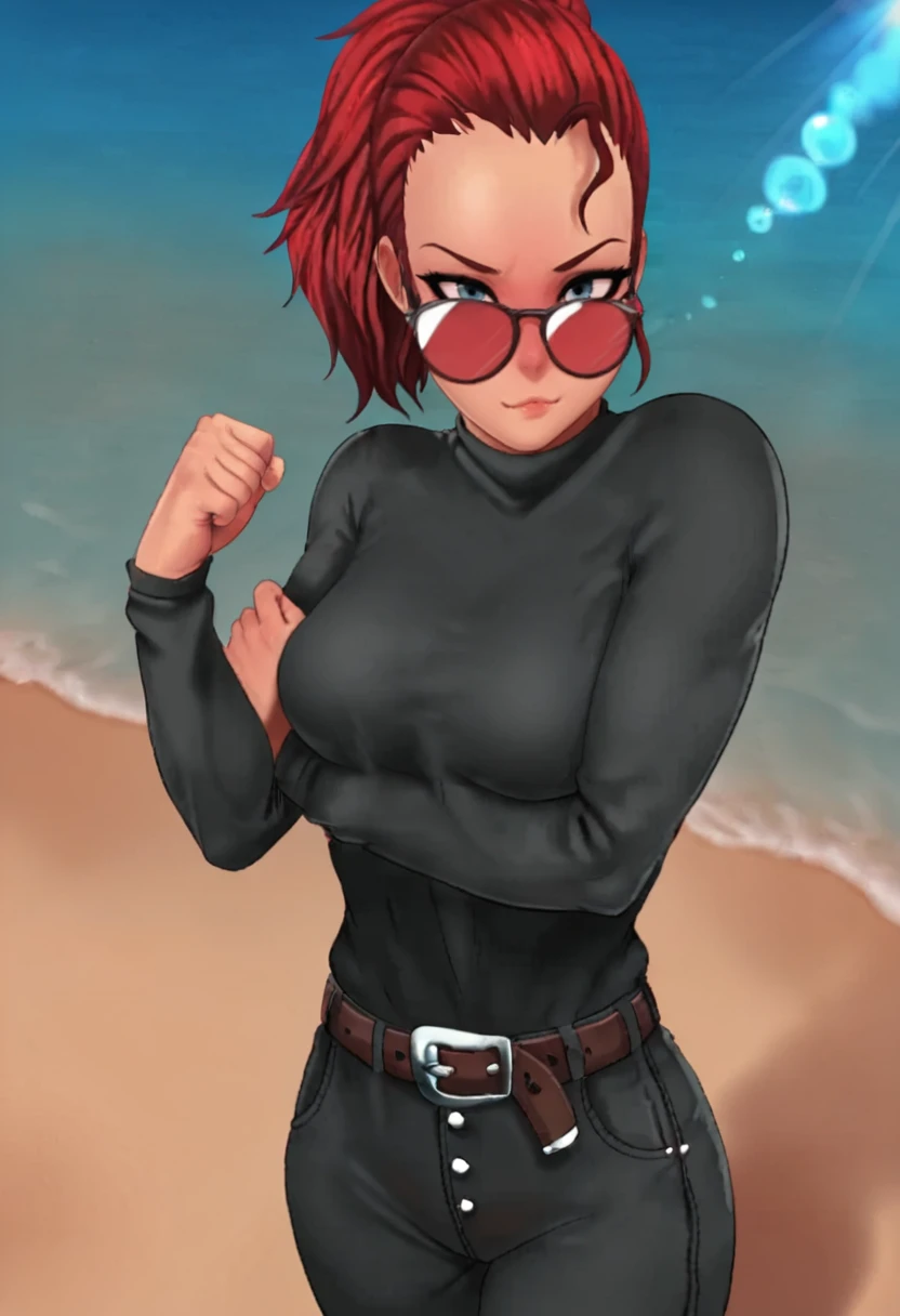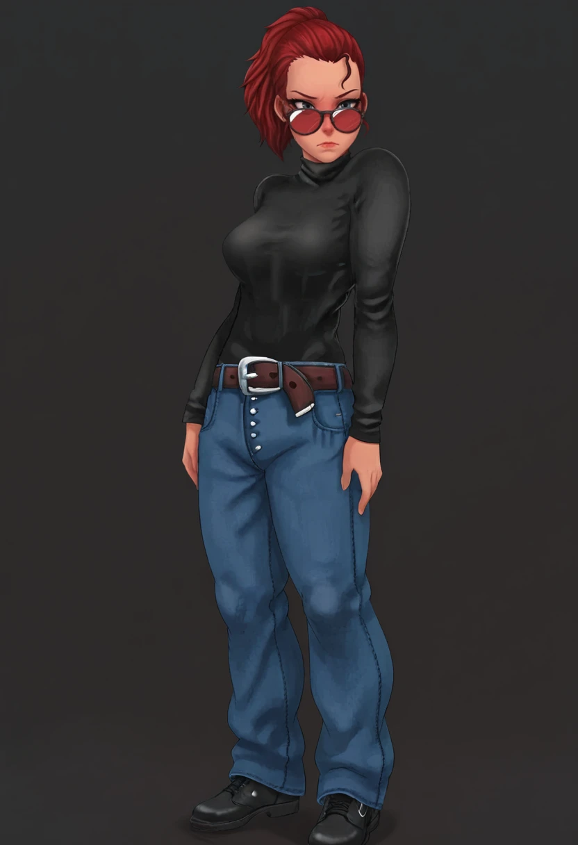 belt buckle, black sweater, jeans, red-tinted eyewear, red hair