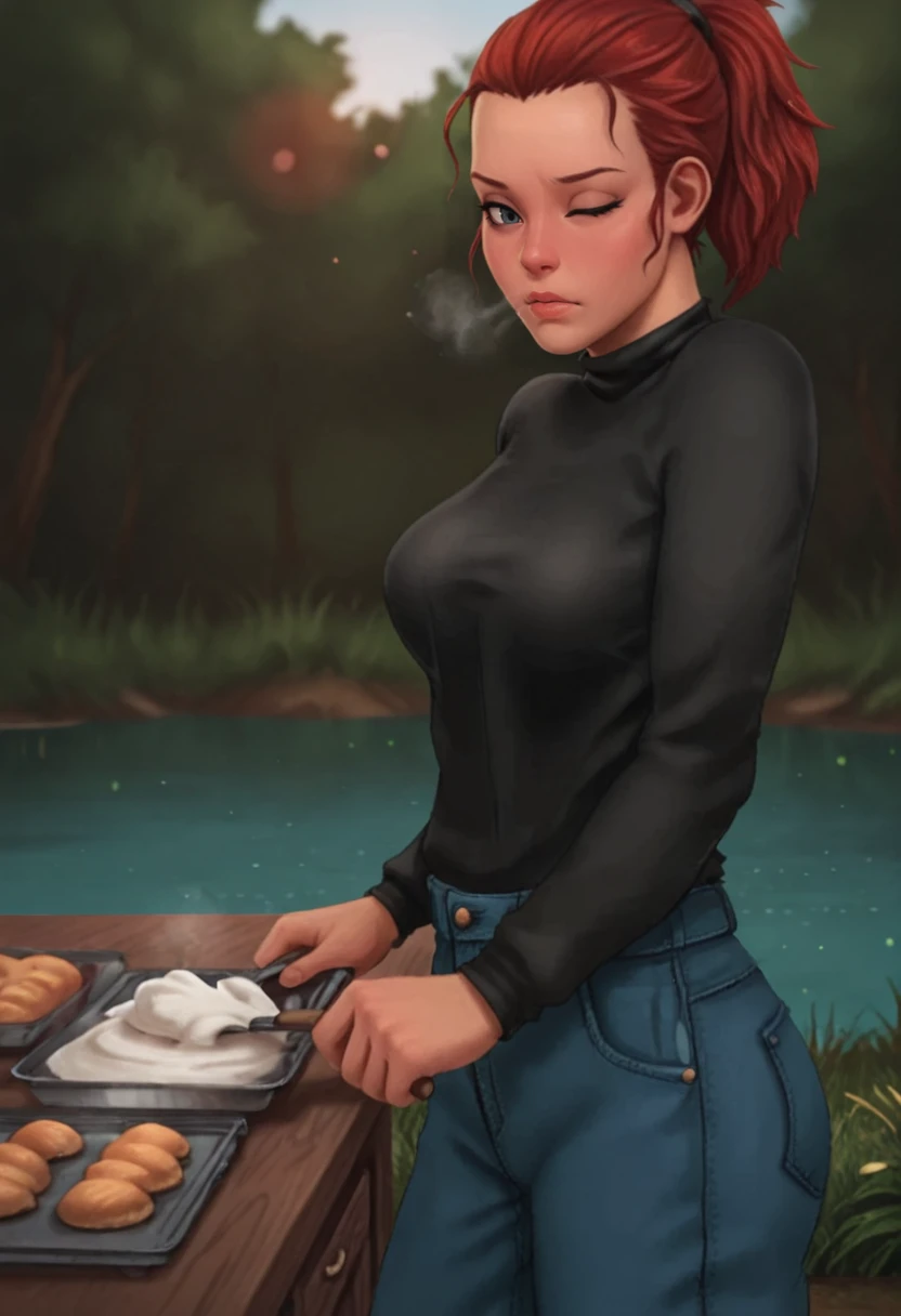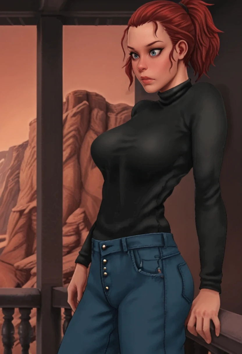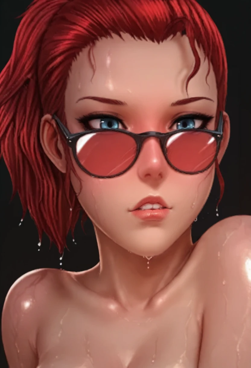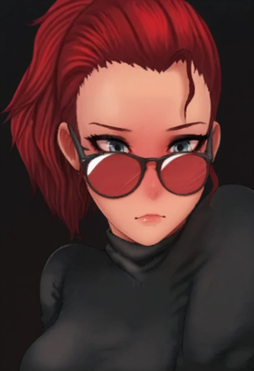 belt buckle, black sweater, jeans, red-tinted eyewear, red hair