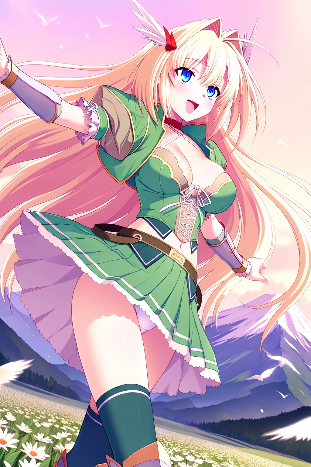 gearsdra_philia, 1girl, solo, blue eyes, long hair, blonde hair, hair intakes, large breasts, cleavage, hair ornament, red choker, green cropped jacket, green cropped shirt, white ribbon, green pleated skirt, armor, deep green thighhighs, armor boots,