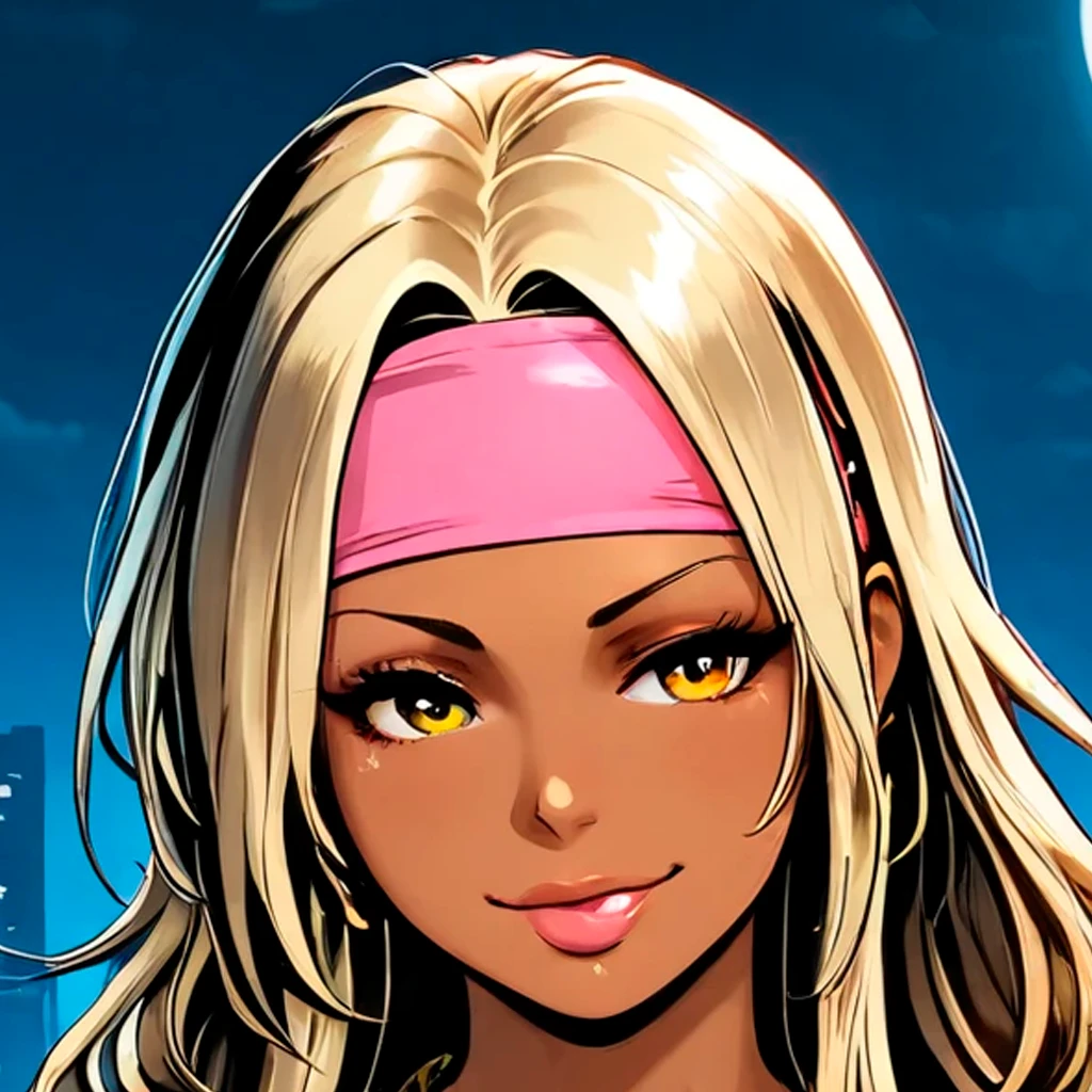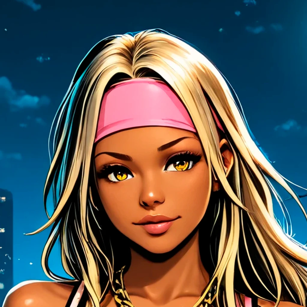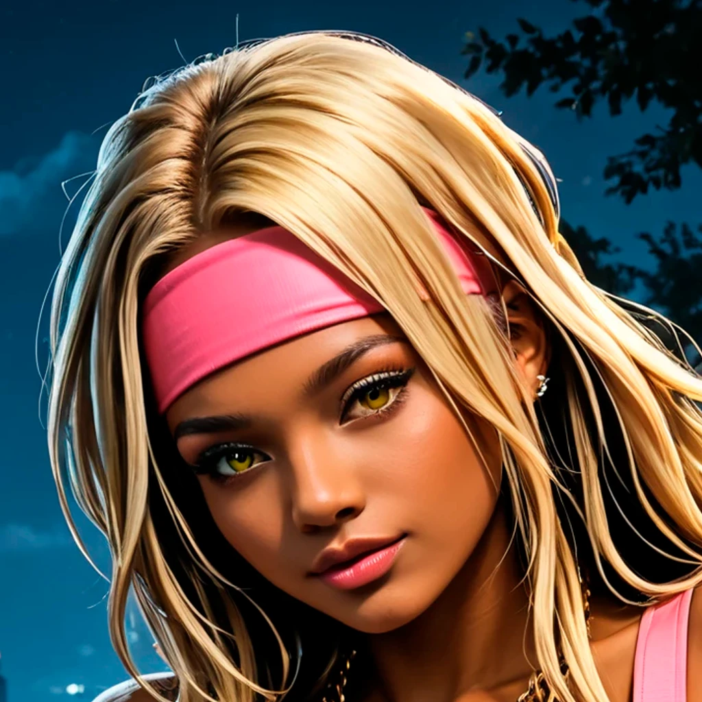 score_9, photorealistic, ultra realistic, ultra detailed, high quality. Kahlua_RBX, blonde hair, long hair, pink headband, yellow eyes, blonde eyebrows, tanned skin, gyaru, , thin waist, wide , thick gold chain necklace, pink croptop, pink shoulders, multiple gold bracelets, midriff, sweatpants, black pants, baggy pants, green Chinese dragon print, pink and yellow high-top sneakers. nighttime, full moon, modern city, street fair, street food stalls. pose, sensual expression. cinematic composition, cinematic lighting, soft natural light.