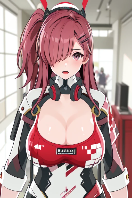 aylakaleido, large breasts, cleavage, hair ornament, black gloves, white bodysuit, hair over one eye, side ponytail, long hair, red gloves, black gloves