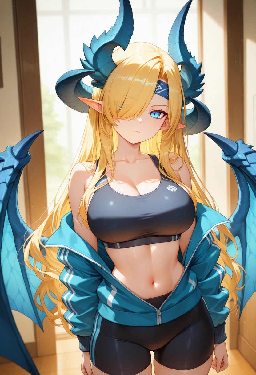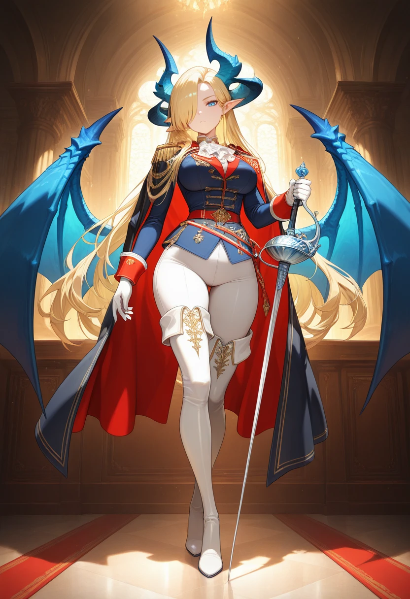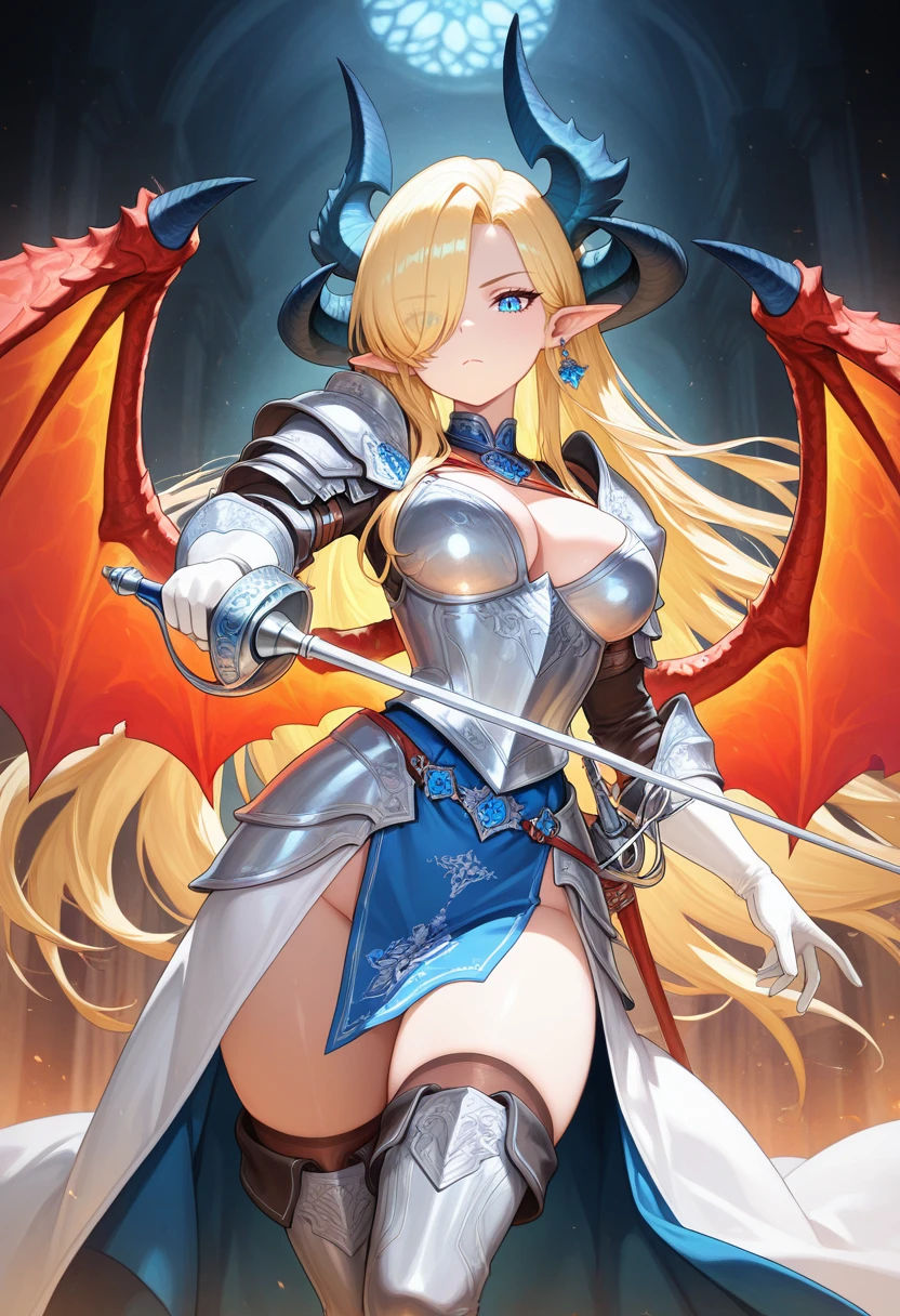 biancanoble_nekoforge,1girl,blonde hair,long hair,hair over one eye,blue eyes,pointy ears,horns,dragon horns,blue dragon wings,