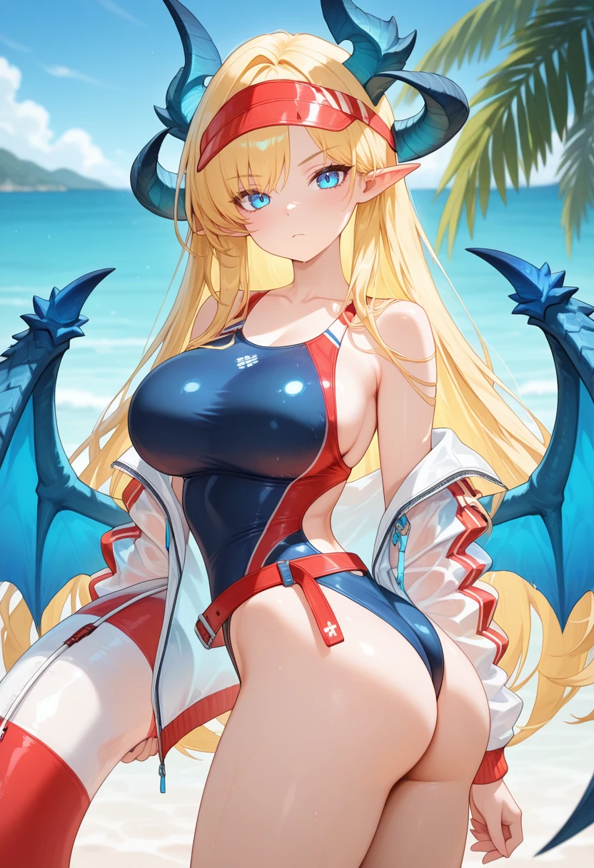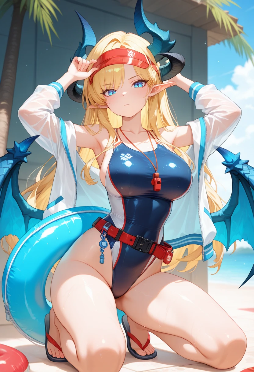 blue one-piece swimsuit,competition swimsuit,highleg swimsuit,swimsuit under clothes,open white jacket,see-through clothes,off shoulder,bare shoulders,collarbone,visor cap,whistle around neck,goggles,belt,swim ring,sandals,flip-flops,Myth: